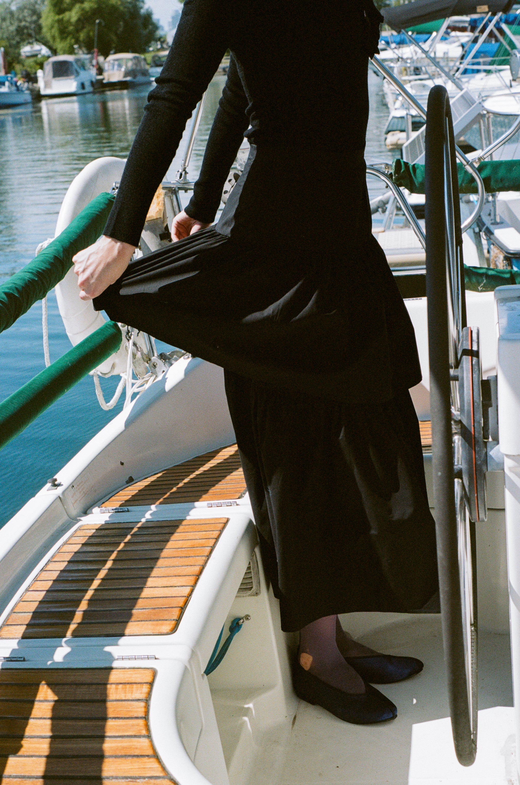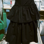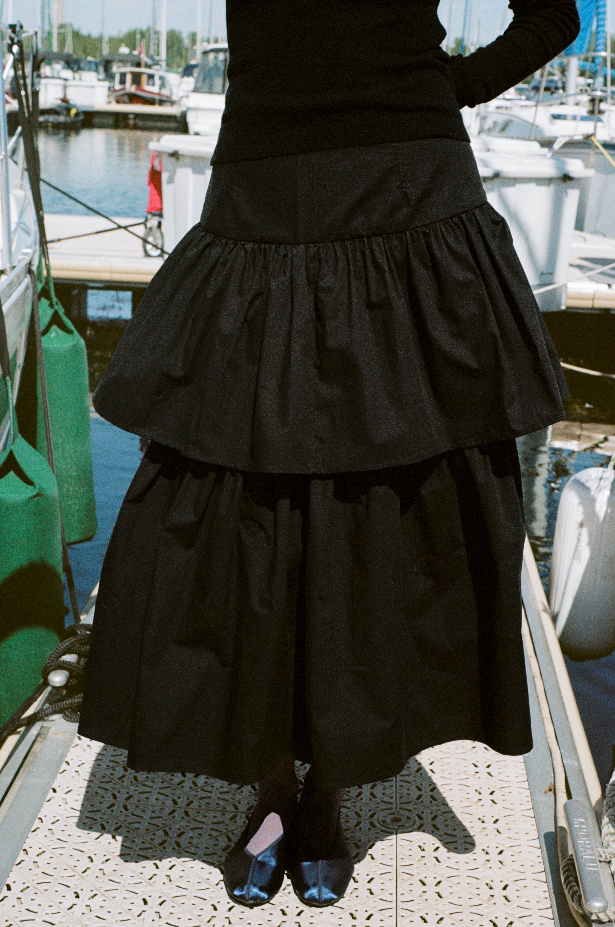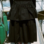 Mid rise midi skirt in deep black crisp cotton, A lining in shape into two structured voluminous tiers from the hip down. Invisible side zip closure. Easy to wear, easy to pair with any top for a sophisticated and feminine touch to any outfit.