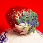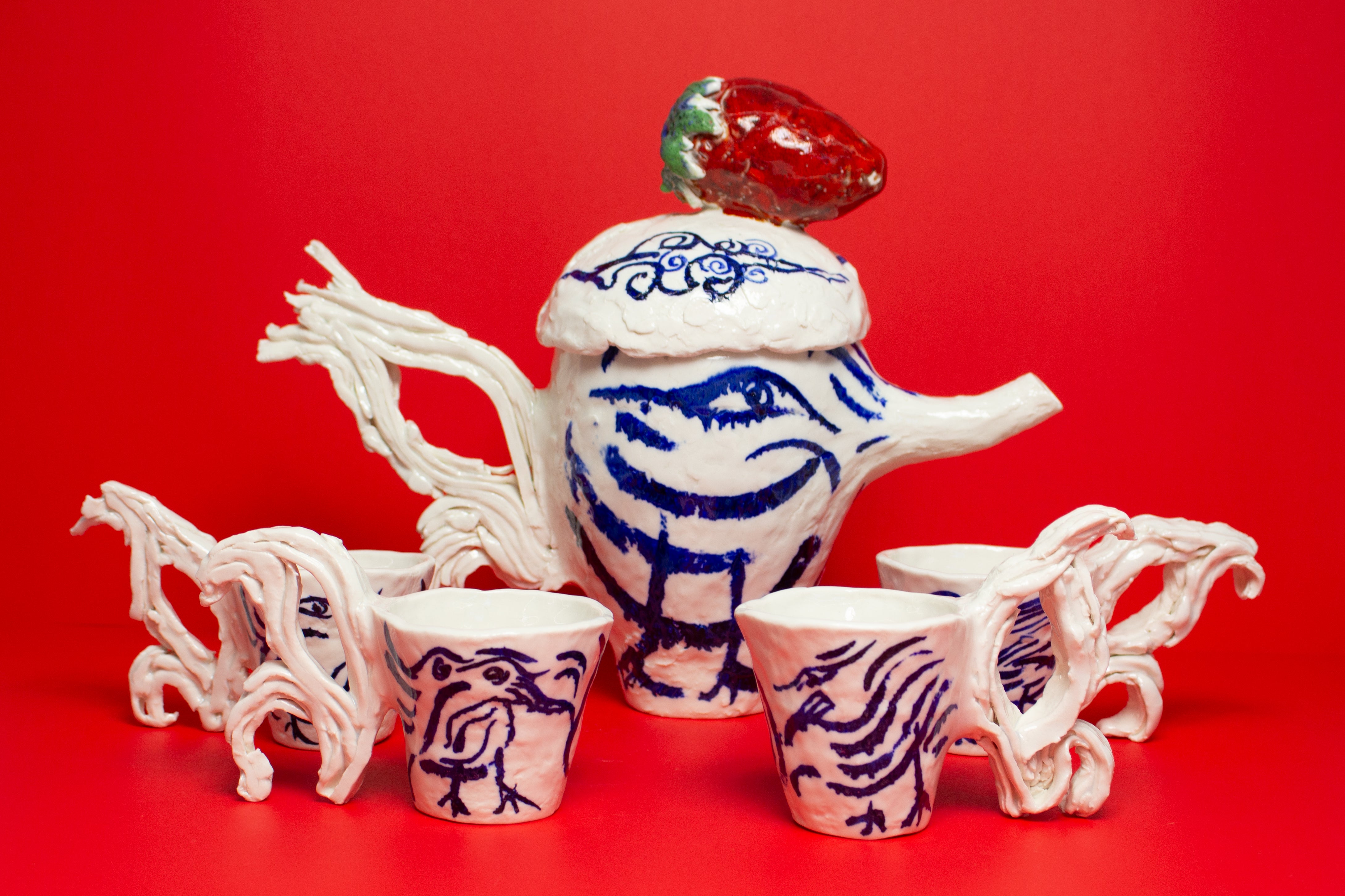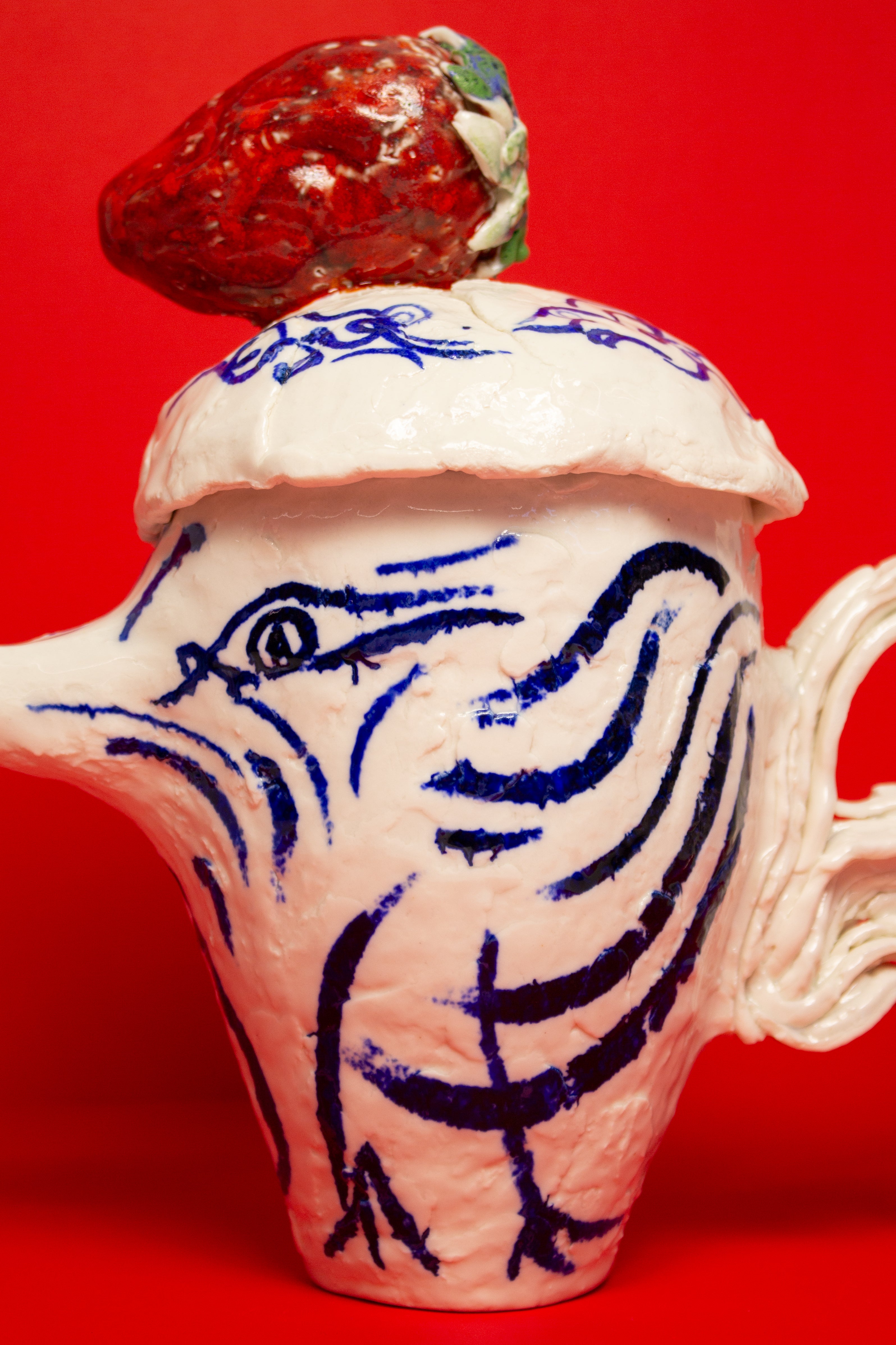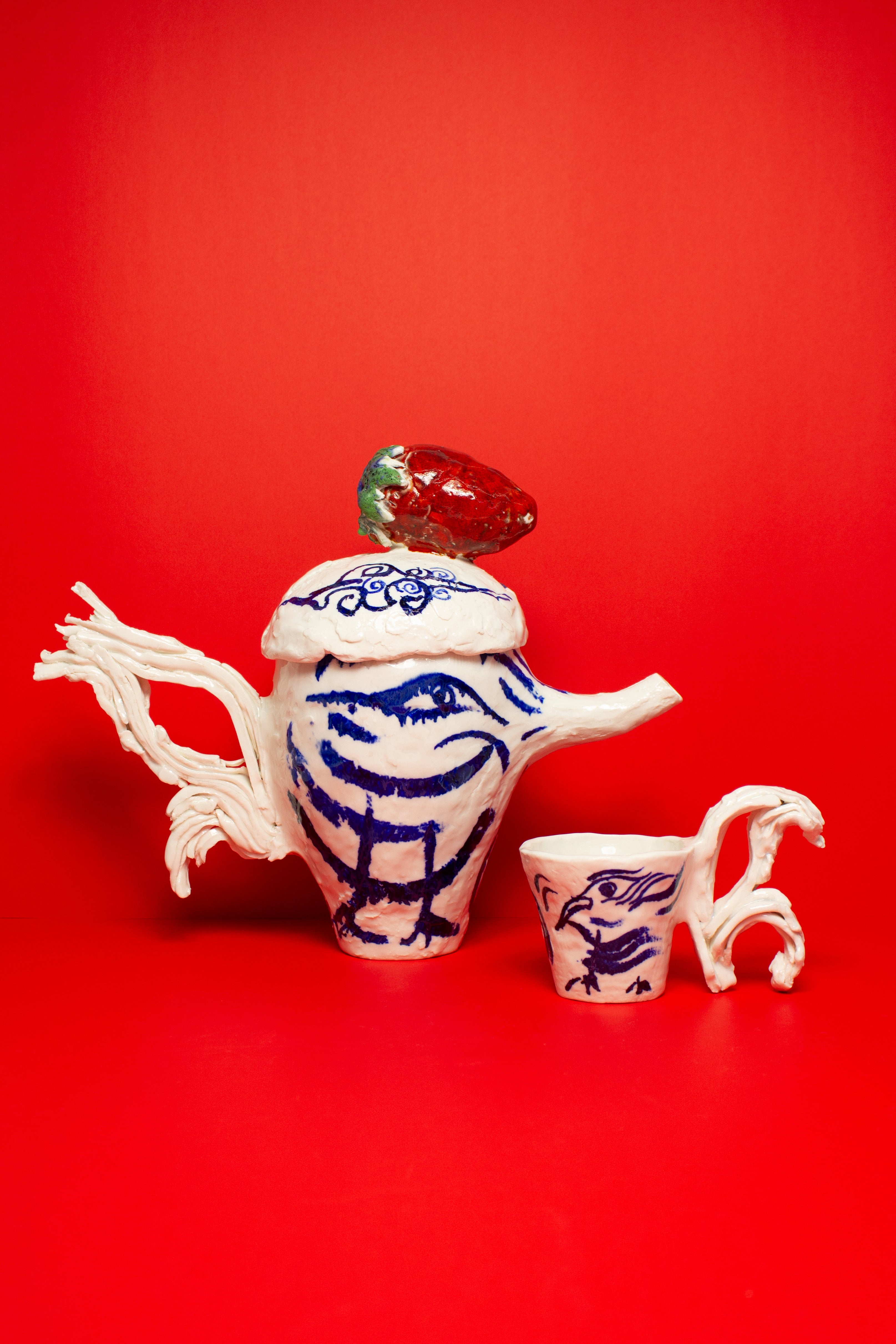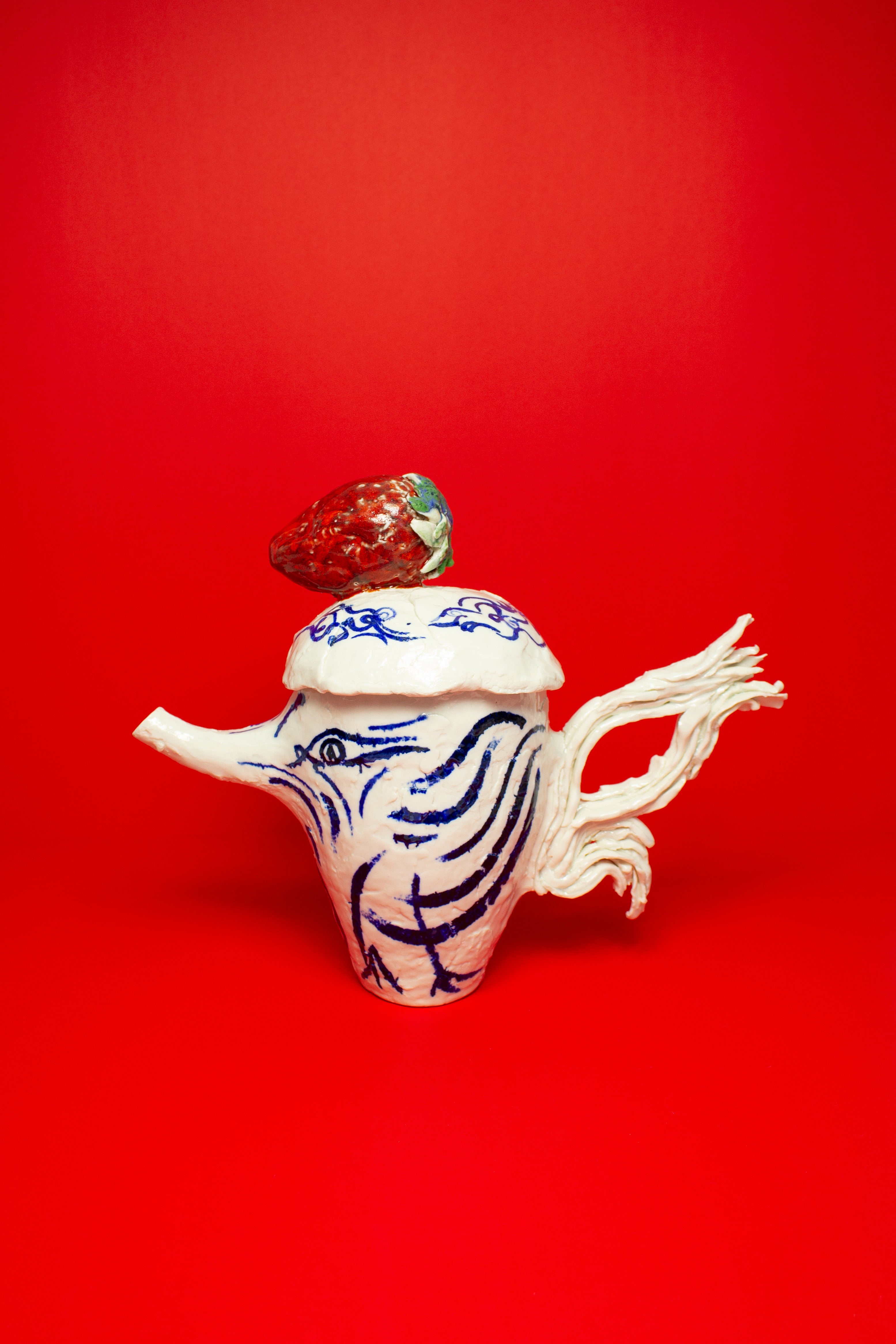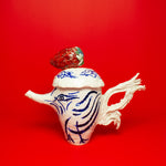 Two hand painted birds appear on the teapot, facing one another beneath the strawberry, engaged in a gentle, open ended discourse. Their meaning is intentionally left to the viewer's interpretation. They might suggest freedom, transformation, rebirth, or simply the presence of a bird.