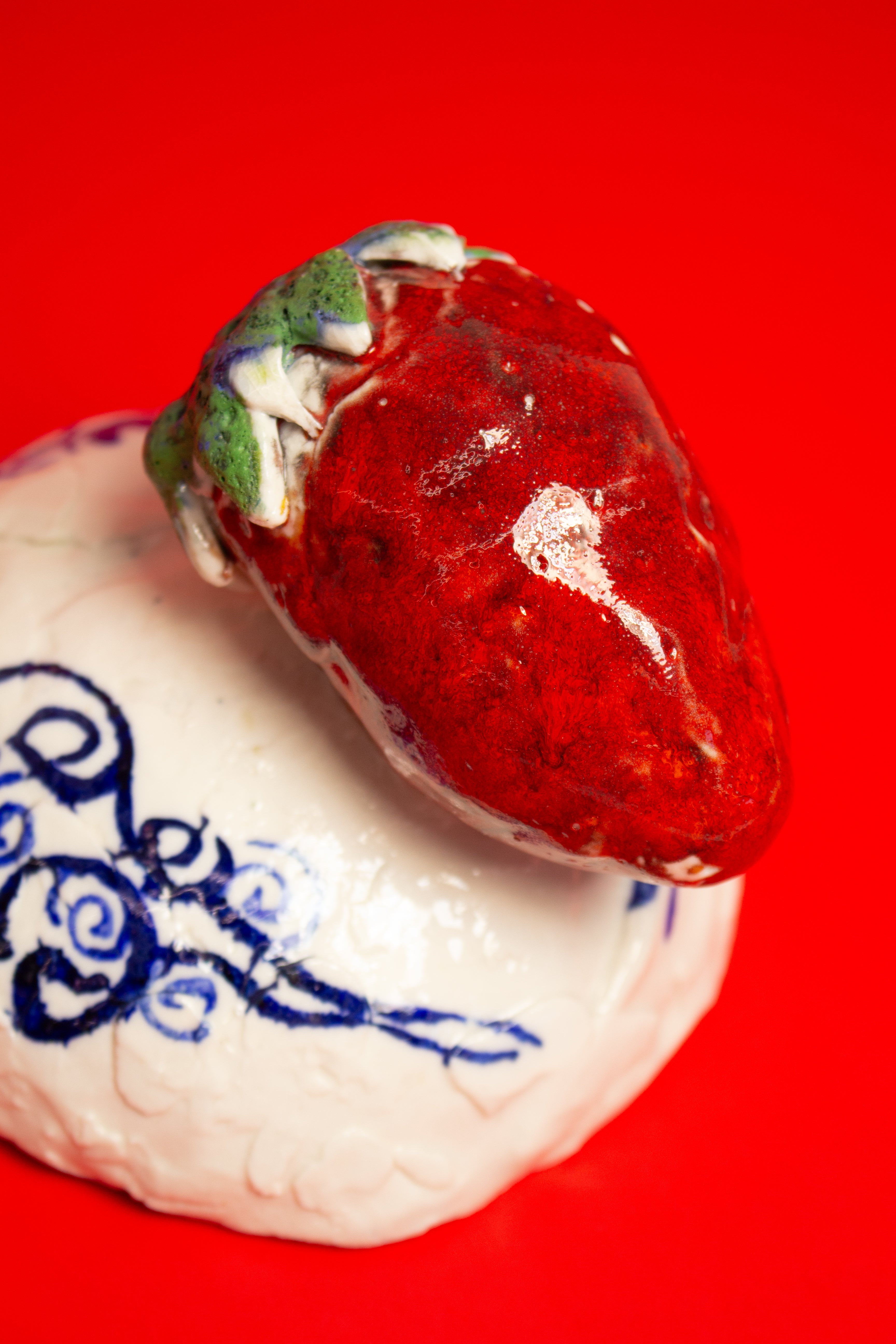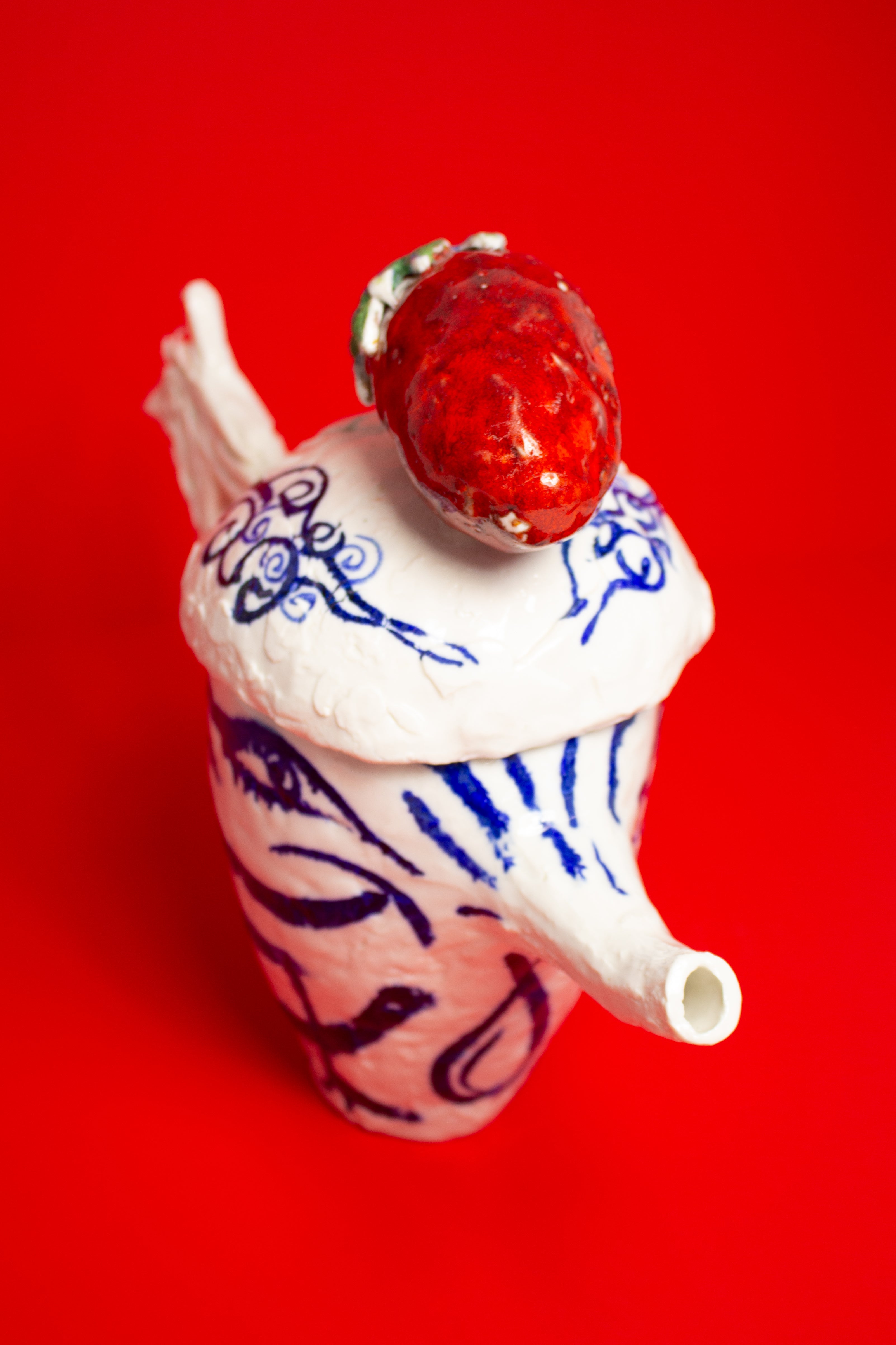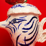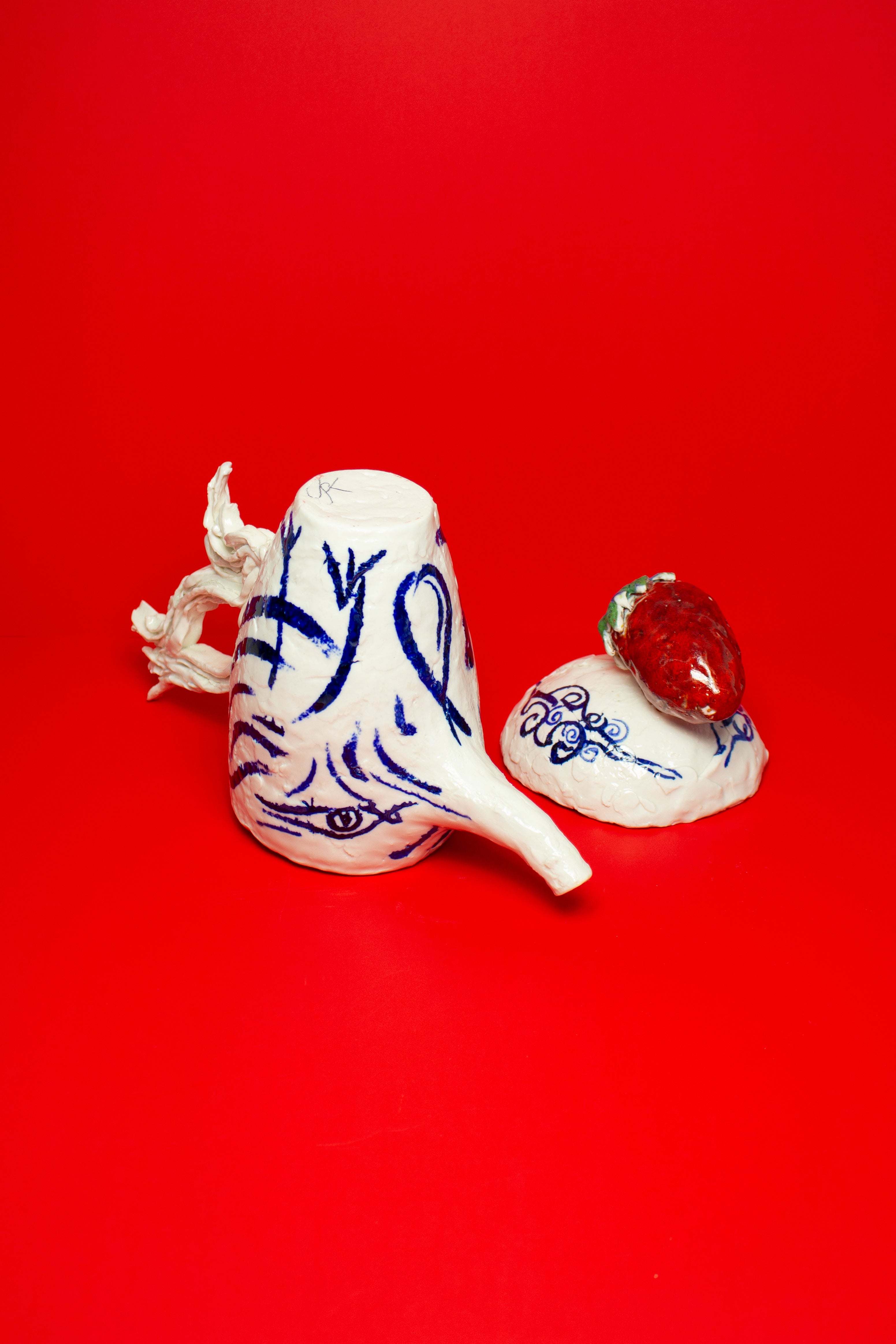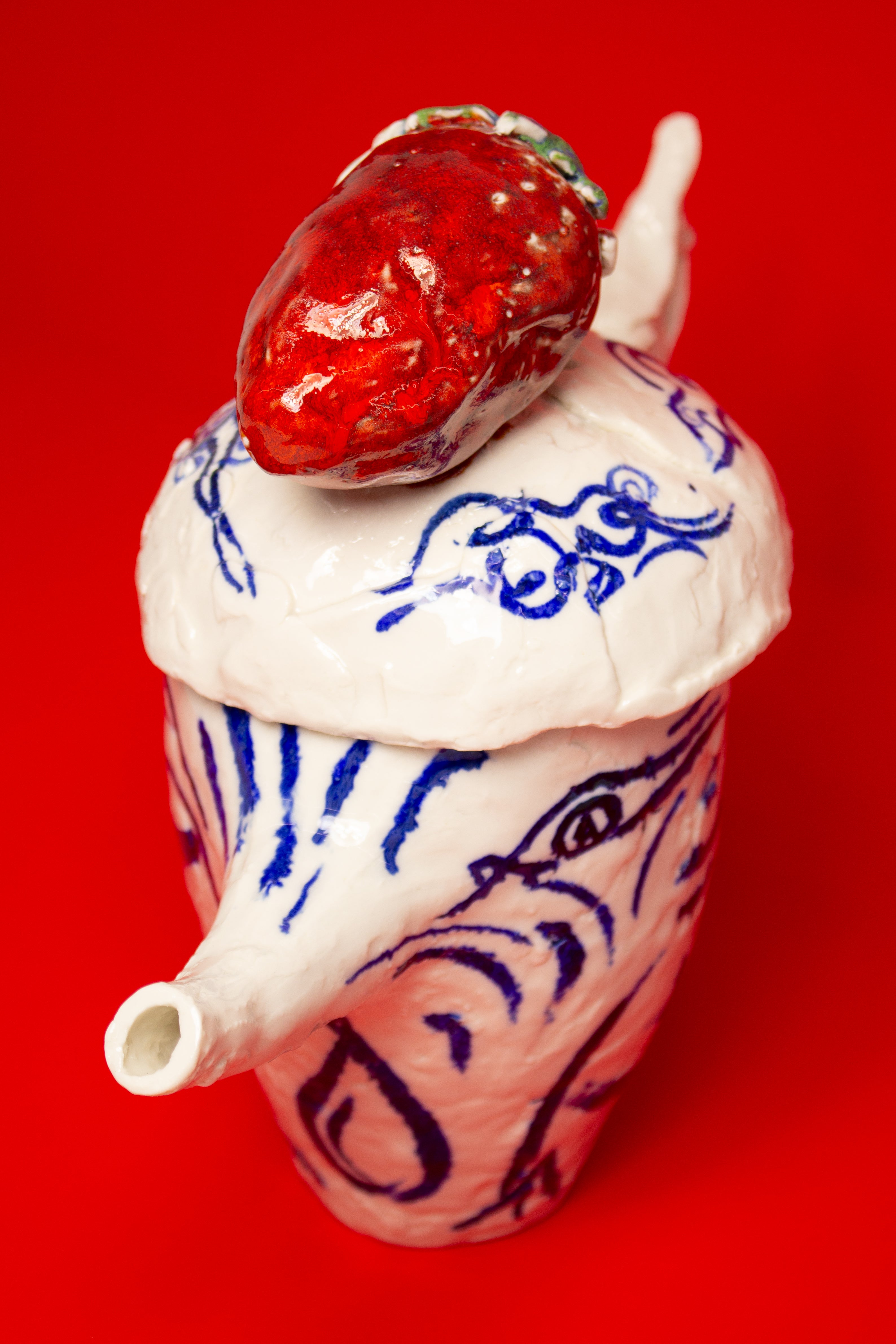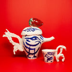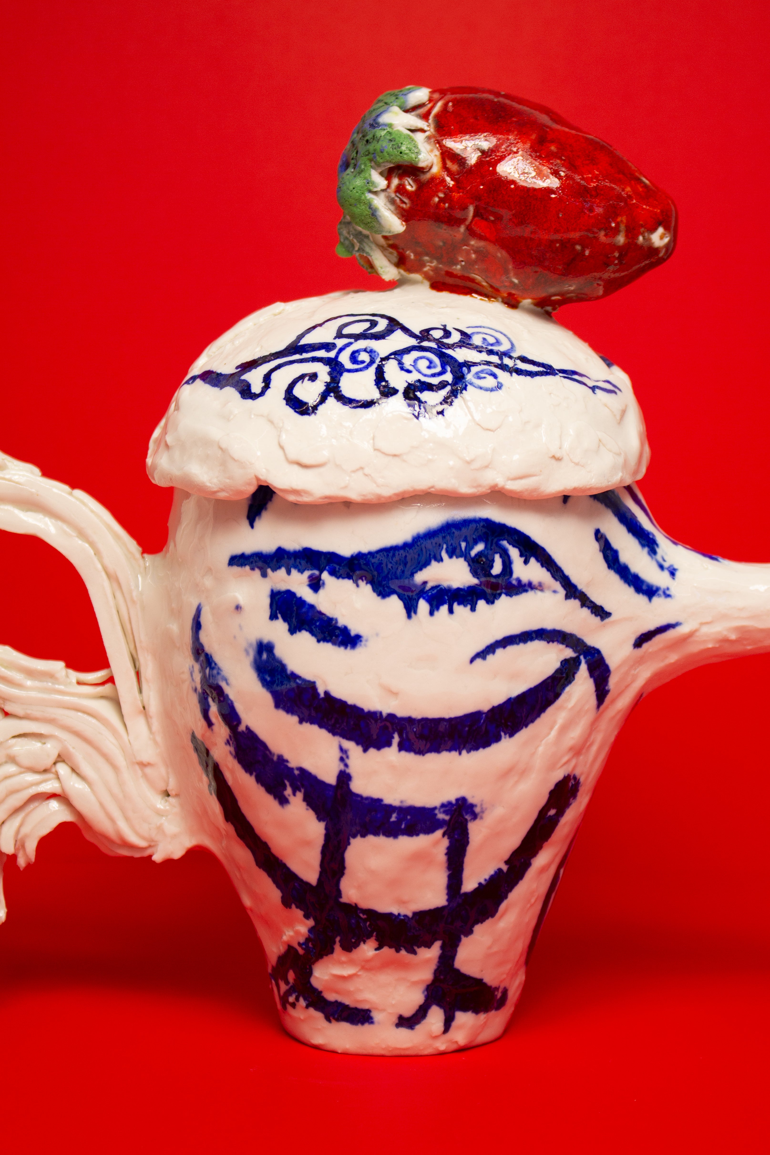 Two hand painted birds appear on the teapot, facing one another beneath the strawberry, engaged in a gentle, open ended discourse. Their meaning is intentionally left to the viewer's interpretation. They might suggest freedom, transformation, rebirth, or simply the presence of a bird.