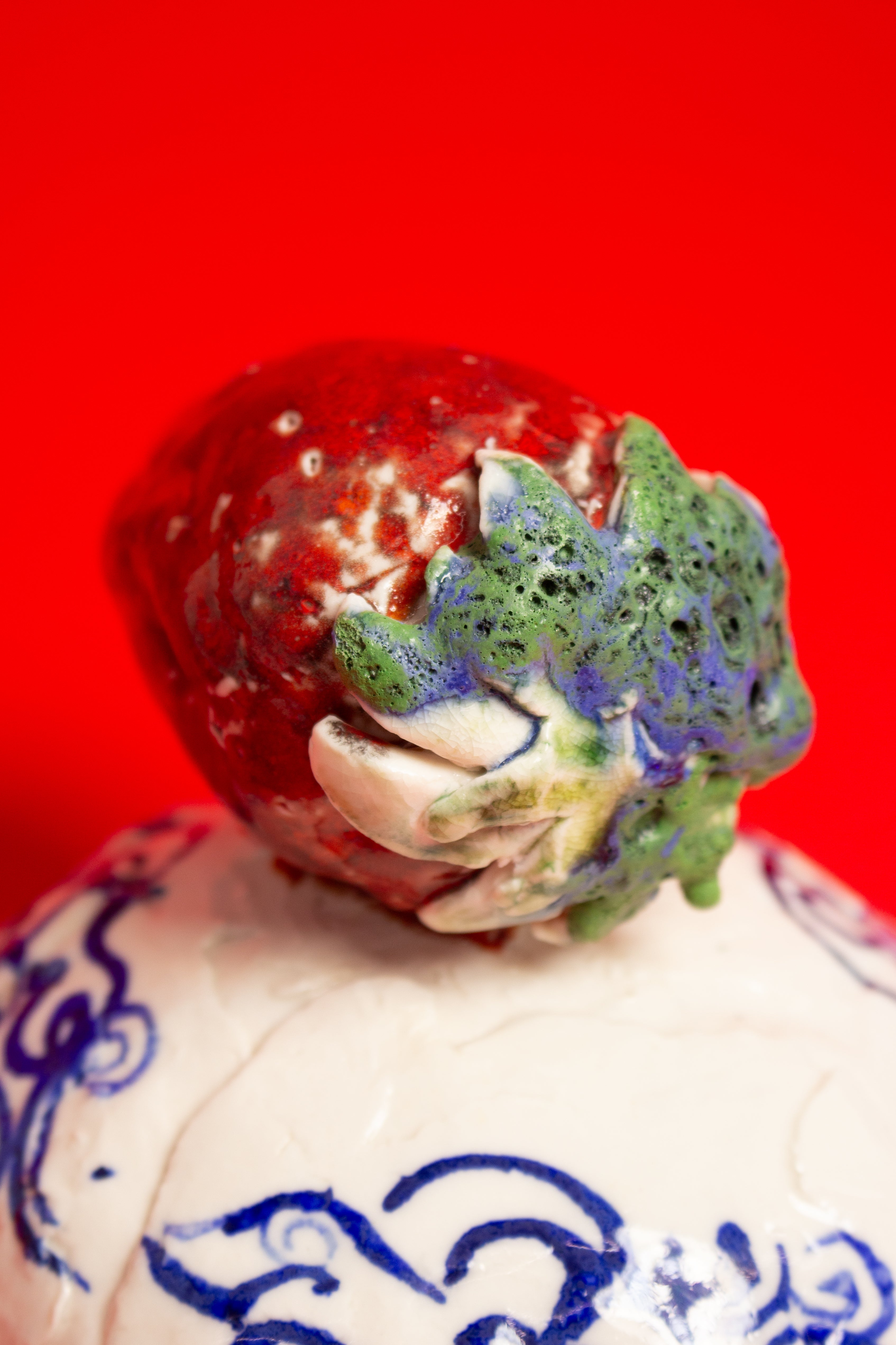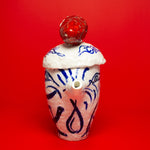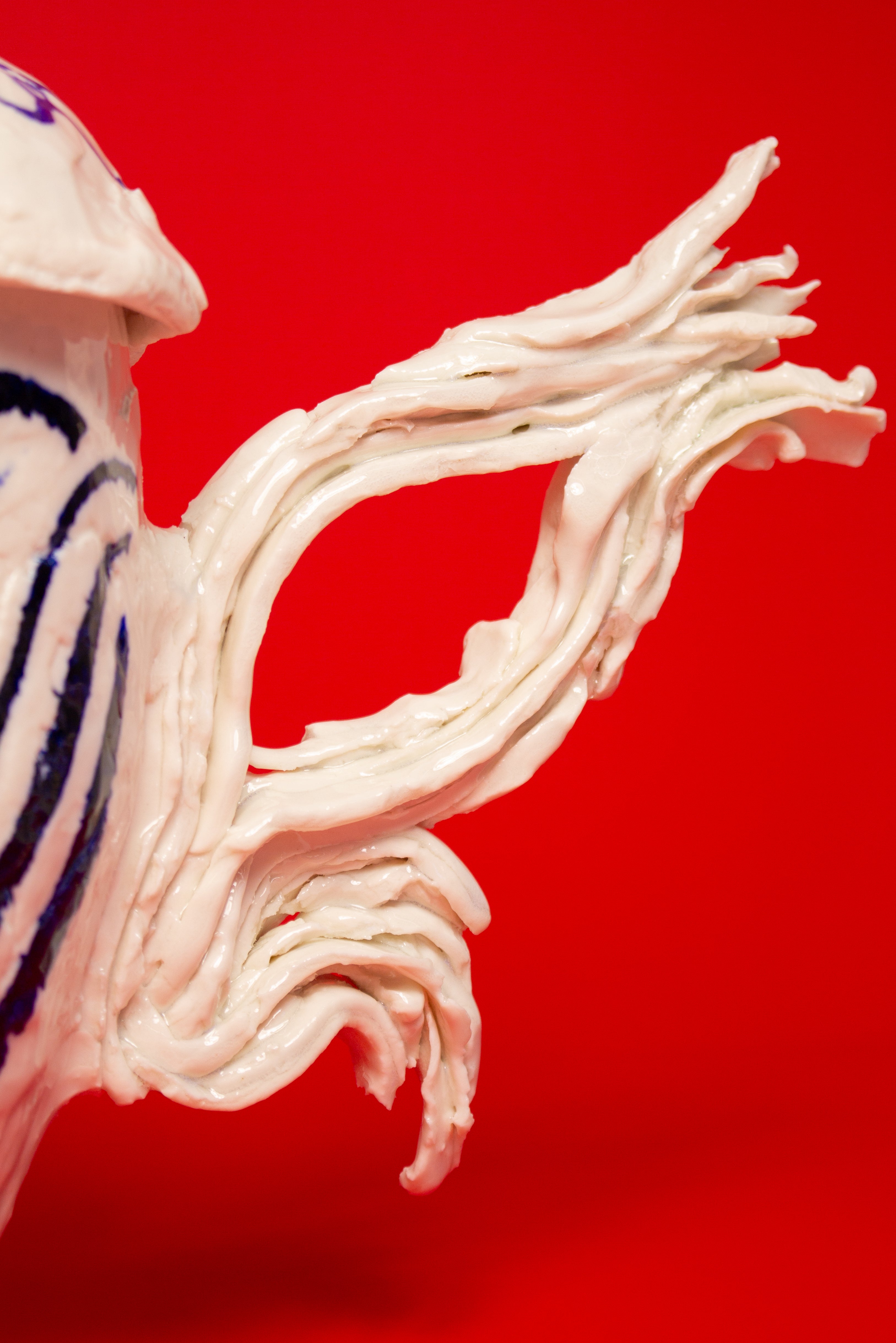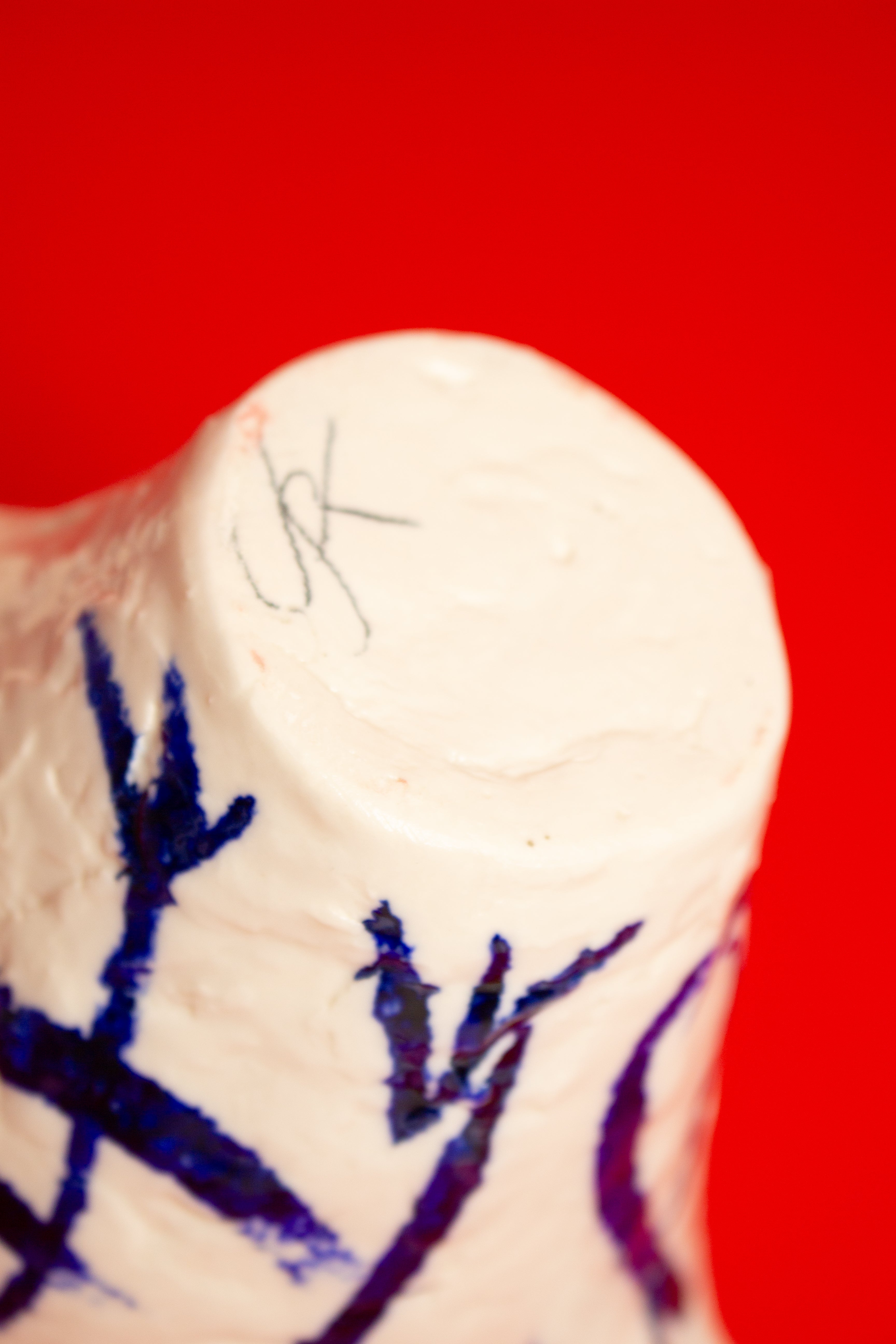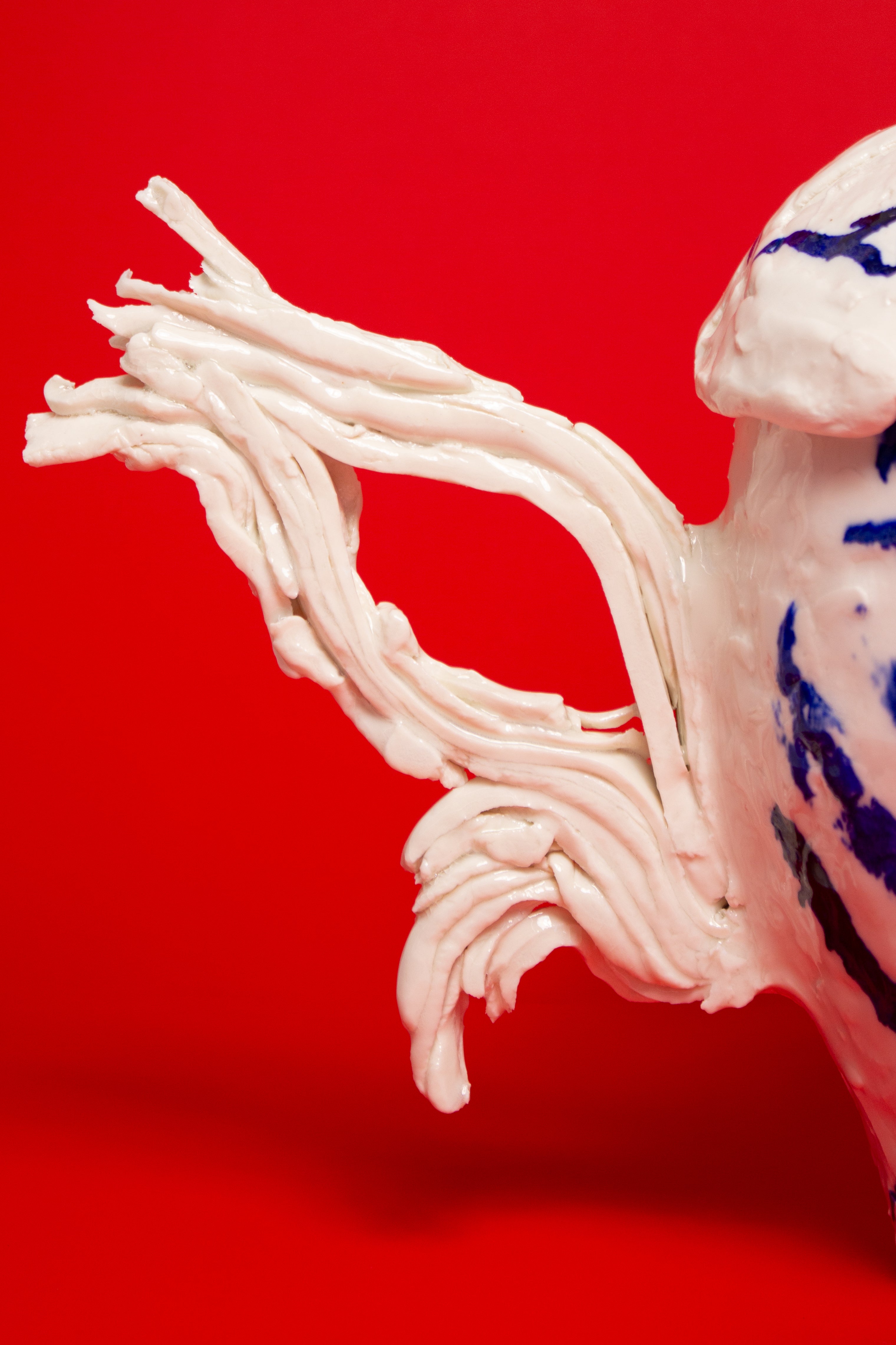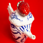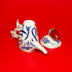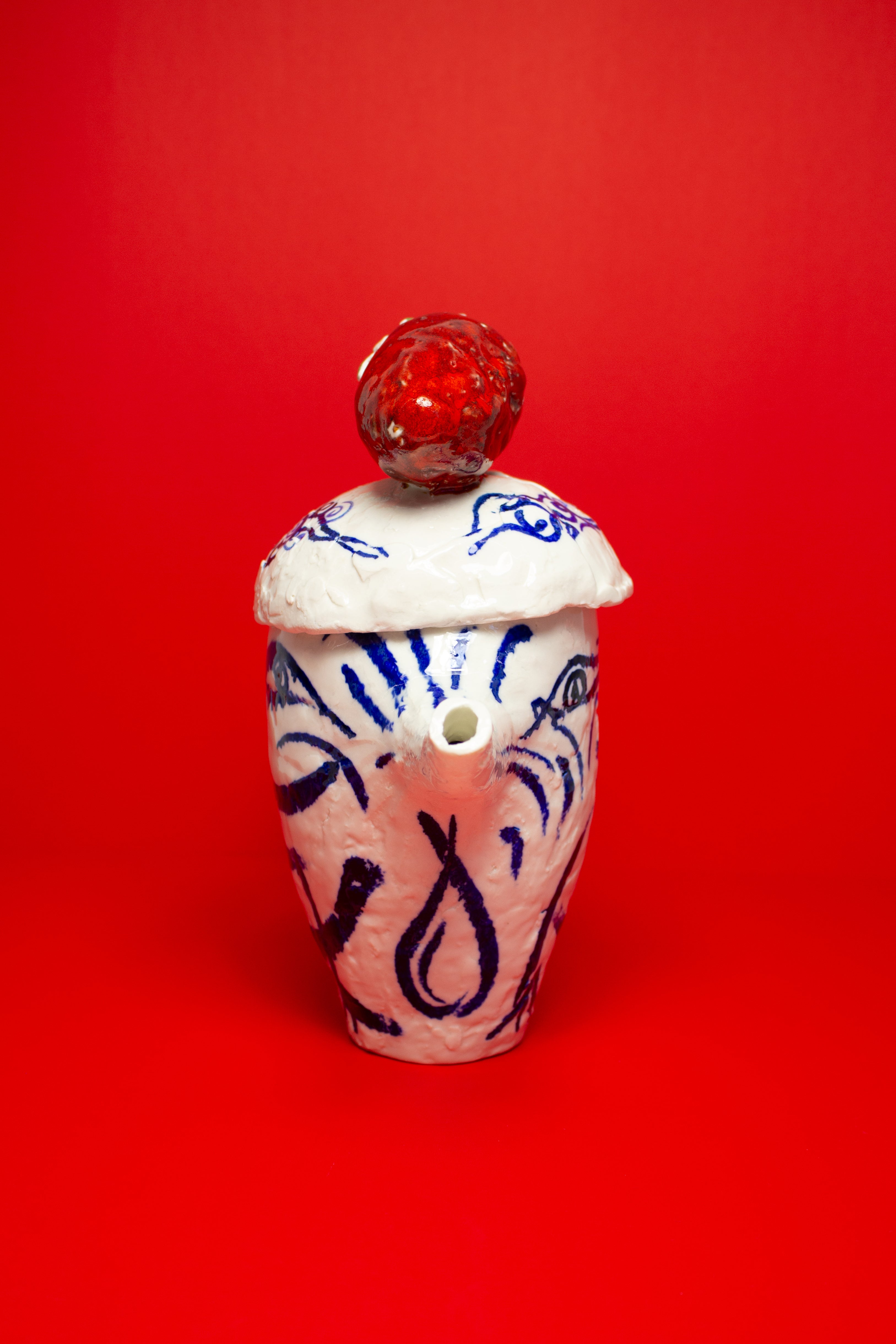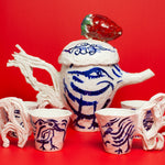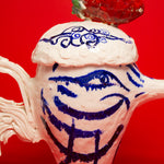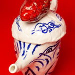 This teapot is made in porcelain and painted with cobalt oxide. It took six weeks to make, progressing through the full process of building, drying, first firing, painting, glazing, and final firing to become a finished piece. Food safe and liquid tight. The work emerges from Tülay Kulbay's exploration of her layered cultural heritage, Turkish, Swedish, and French, and her ongoing dialogue with materials, form, and the body.