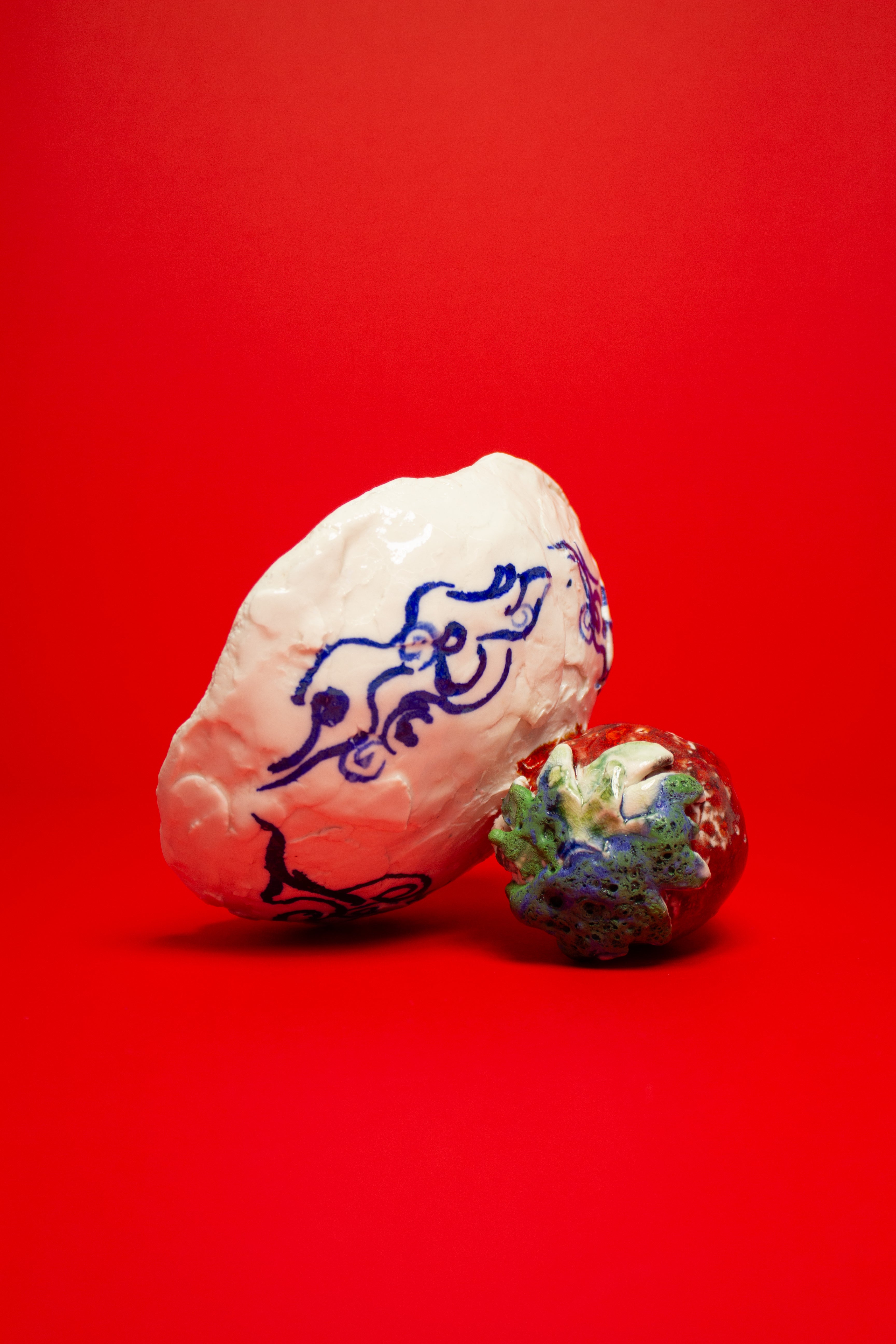 The wild strawberry motif draws from Swedish culture. Smultronstället, meaning "wild strawberries" or a "secret place", evokes hidden spots of personal significance. It also references Ingmar Bergman's film 'Wild Strawberries', in which the journey of memory and reflection uncovers intimate, emotional landscapes. The strawberry's shape echoes an anatomical heart, a visual motif repeated across Kulbay's work alongside eggs and other forms, symbolizing vulnerability, desire, and protection.