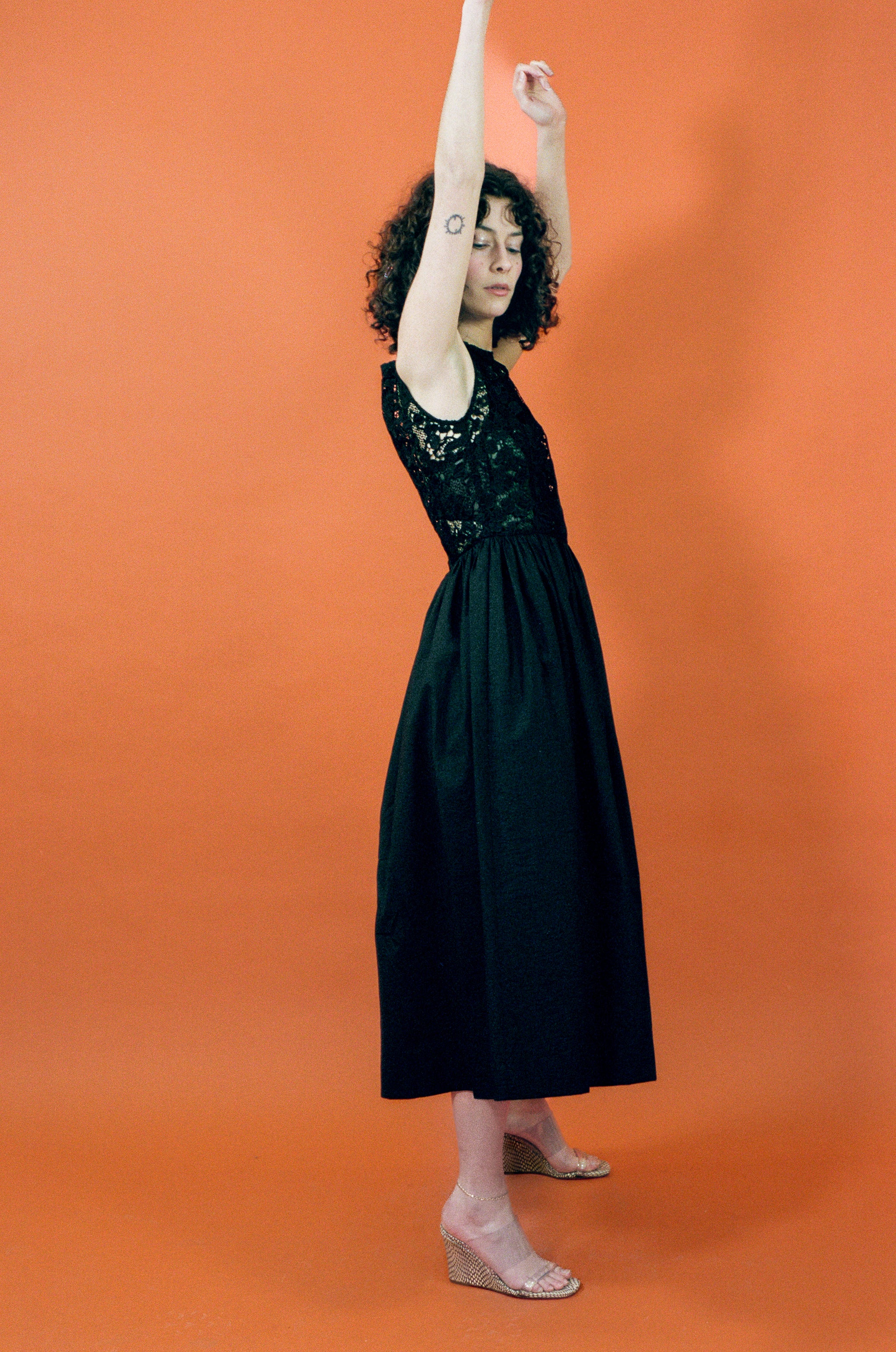 The Erica Dress combines two signature Naya Rea textures: a crochet-lace bodice and a crisp cotton-poplin skirt. The bodice is crafted from intricate openwork lace that sits lightly on the body, while the gathered skirt adds volume and ease of movement. Finished with side pockets for comfort and practicality.