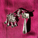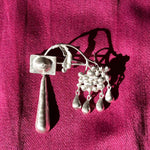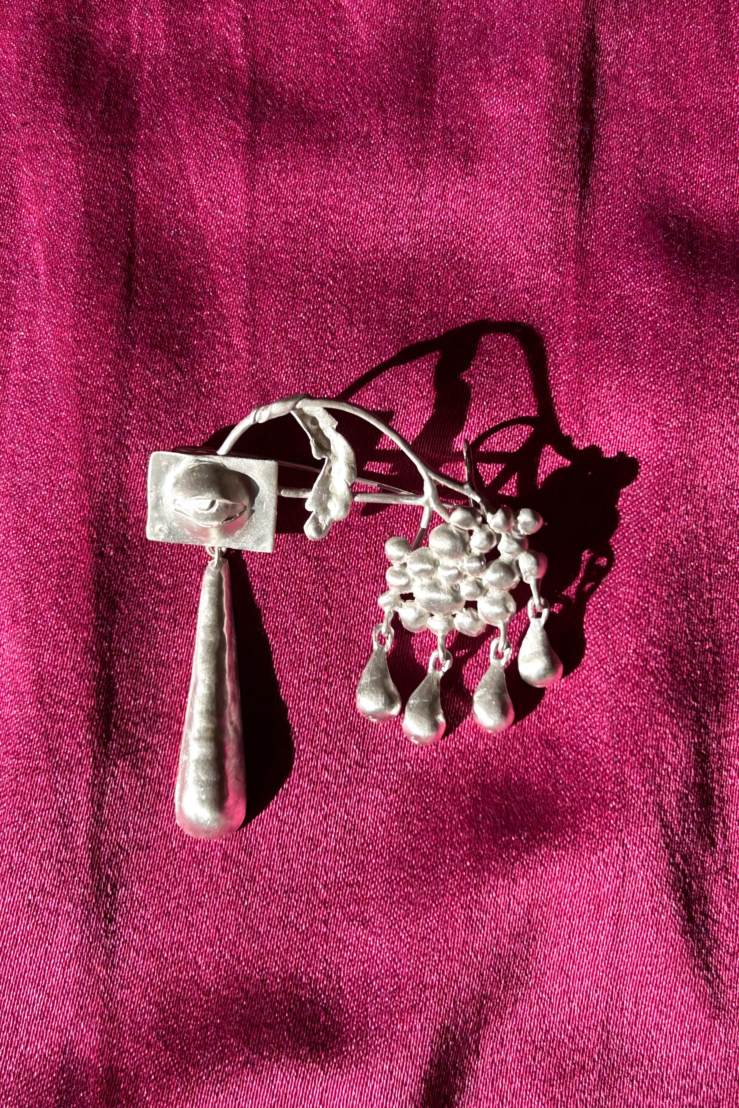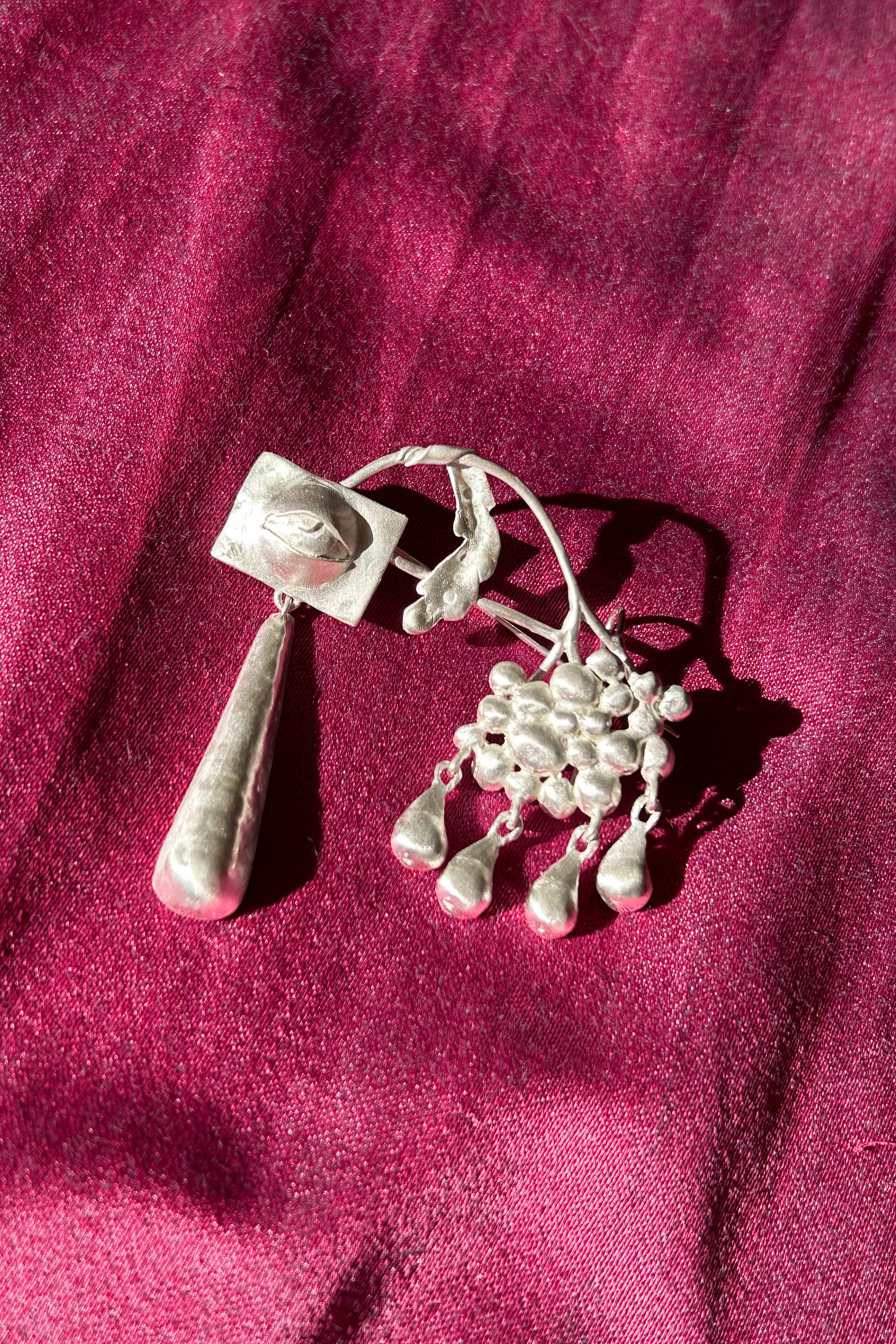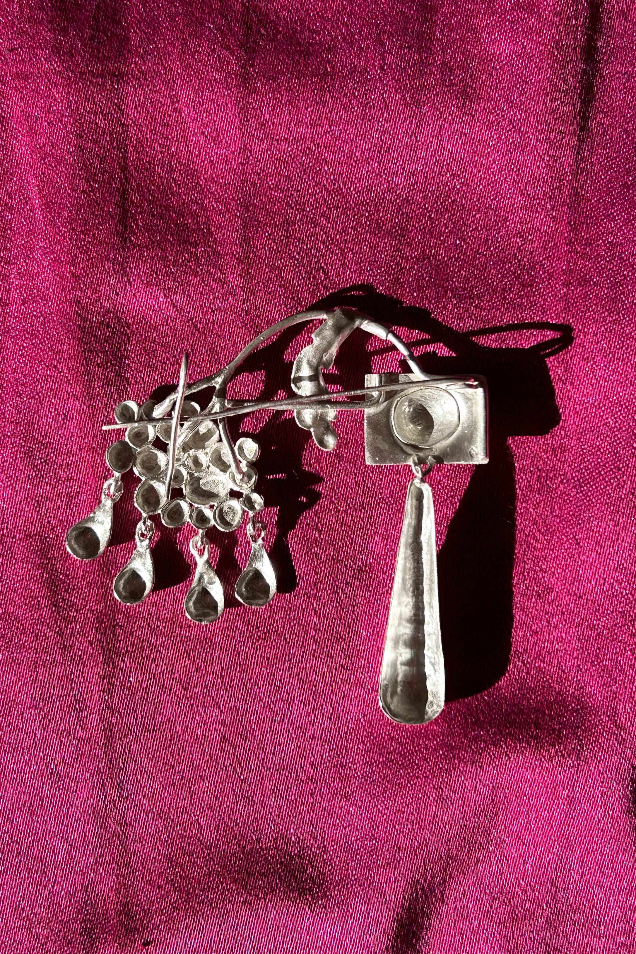 Hand foraged and casted brooch of flowers with pebble charms dangling down, and an eye motif adorned with a long drop. Hooked through a thin semi circle, at the center of it all is a curved leaf detail, finishing off this comic book scene of nature and whimsy. Featured in matte sterling silver.