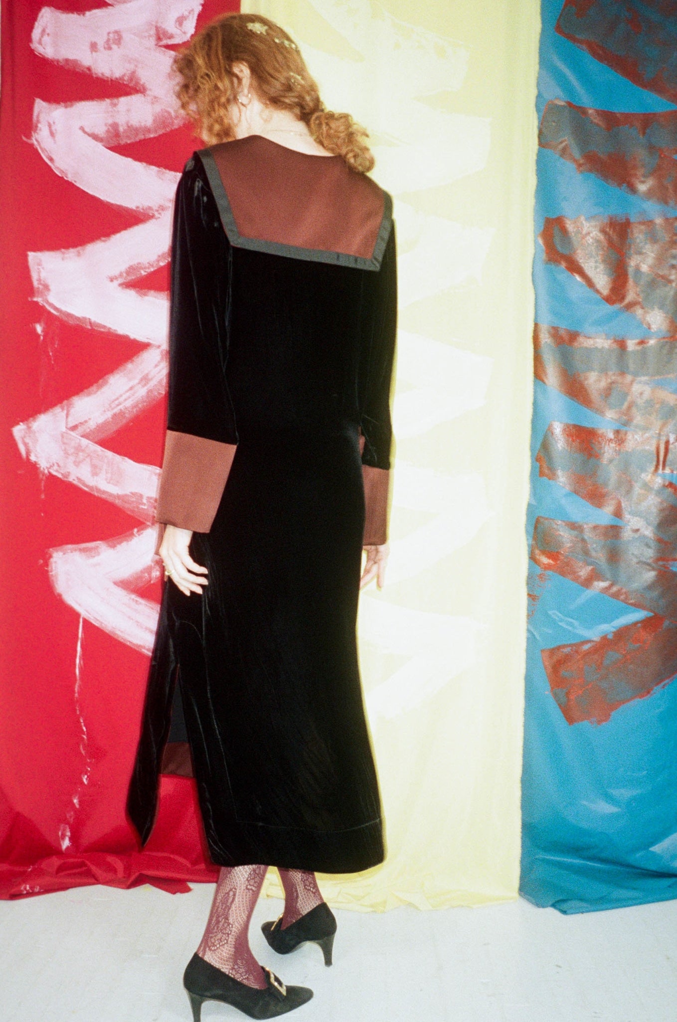 Sailor style dress with low slung satin ties that hit at a dropped waist. Black velvet with a chocolate brown charmeuse collar, cuff, tie and interior slits. This dress is beautifully weighted and walks with the wearer..