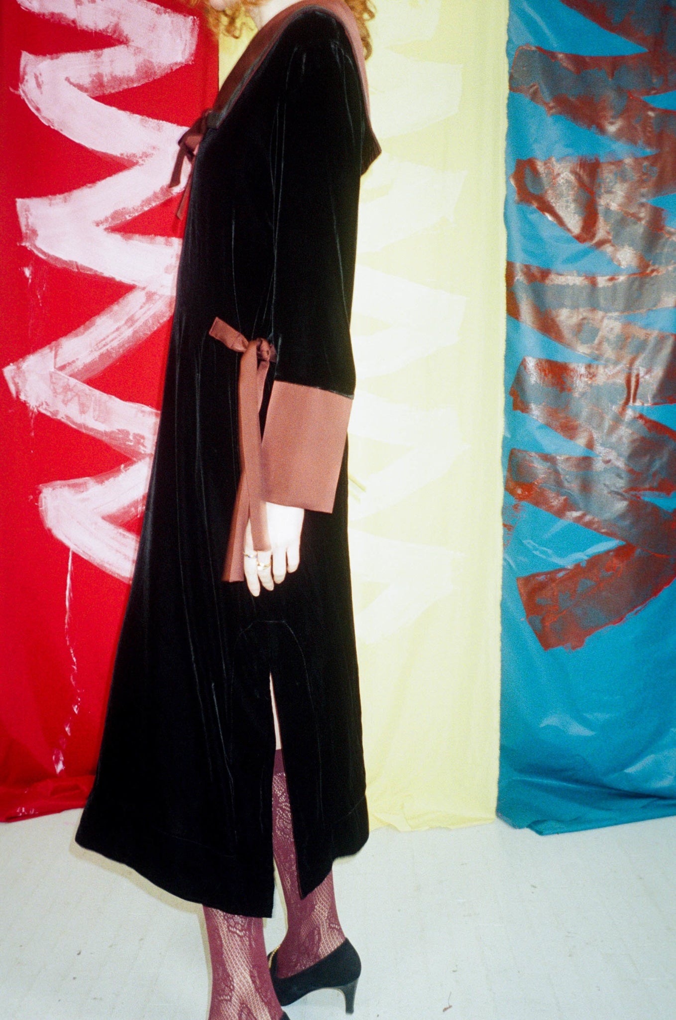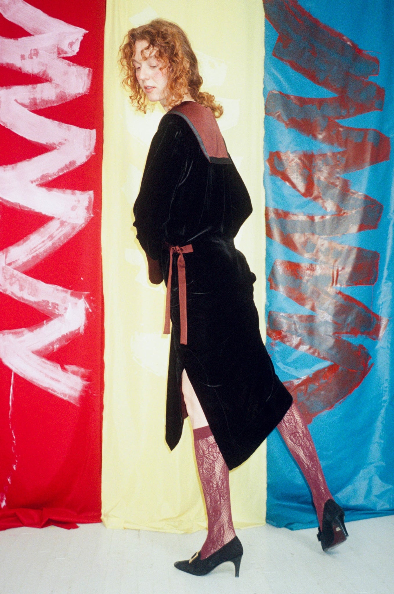 Material: Silk and rayon velvet body, silk charmeuse contrast