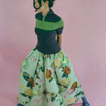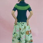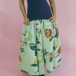 Full volume, full-length, bouncing, voluminous skirt with yoke detailing and hidden pockets below an elastic waistband. Featured in pistachio green with mutli coloured flowers printed throughout.