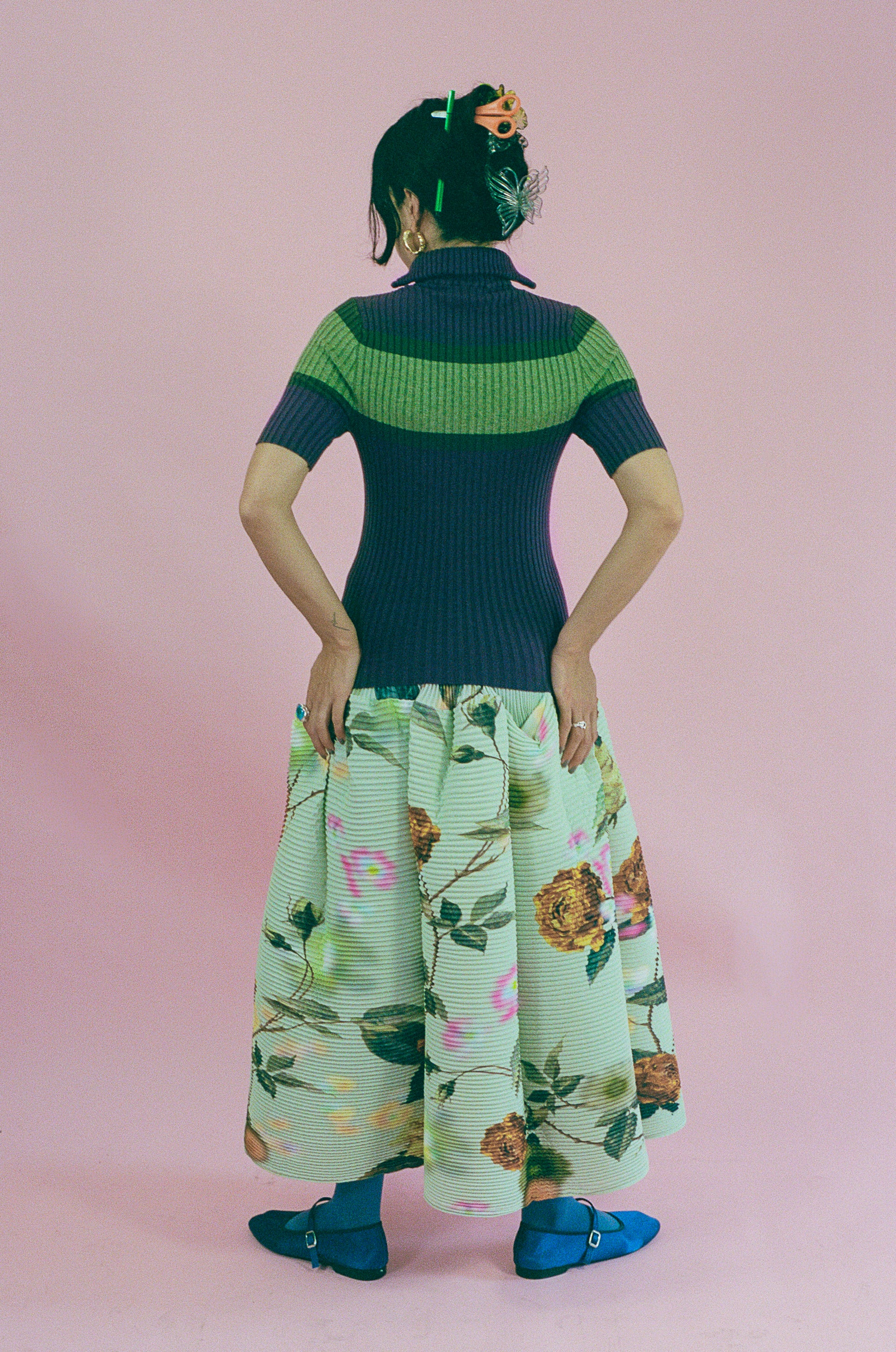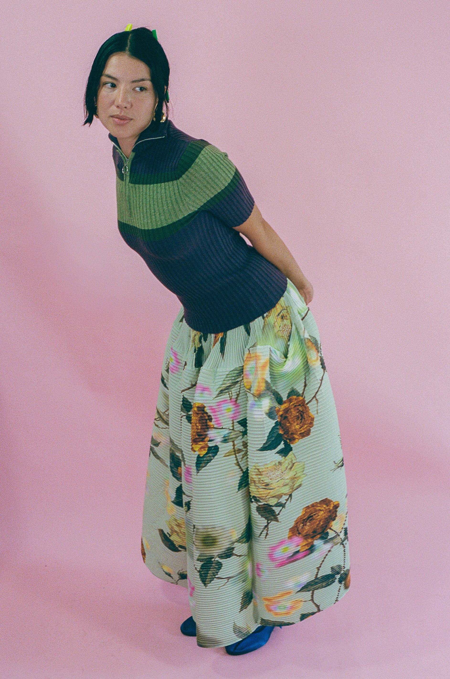 Through her eponymous brand, Swedish designer Julia Heuer creates pieces that are instantly recognizable by their handmade plissé and vibrant prints. Heuer’s careful process sees a combination of illustrated stories being directly applied to raw materials and the Japanese tie-dyeing pleating technique of Arashi Shibori. The garments’ delicate pleating and loose but elegant cut create a playful sense of movement and unique silhouette.