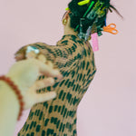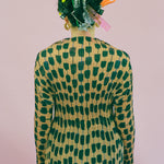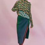 Jenn is 5'7 and a size small, and wears with the Nonna Wrap Skirt in Abyss, Artur Jacket in Radomir, Satin Theatre Slipper in Yellow, Pompas Earrings in Gold, Atolón Ring in Silver/Blue, and Ola Ring in Silver/Brown.