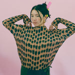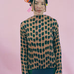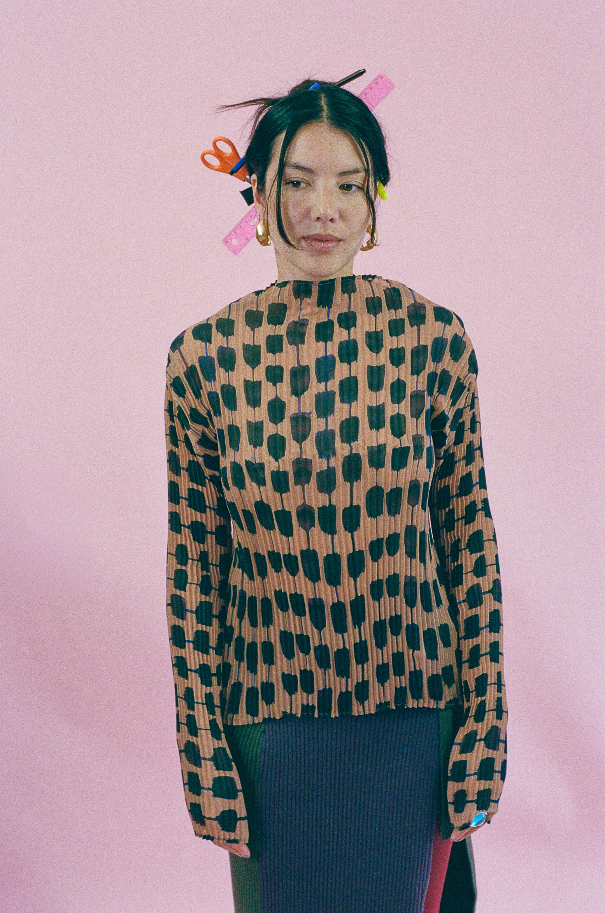Long sleeve straight cut top with a high boat neck and subtle batwing sleeves, made of a lightweight polyester chiffon that feels like silk and ensures the integrity of the print and pleat. Featured in caramel brown with black/dark purple blotted patterns. Hand made vertical pleating hugging and molding to the shape of your body — giving a fitted look while remaining light as air.