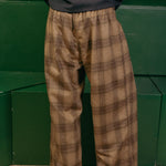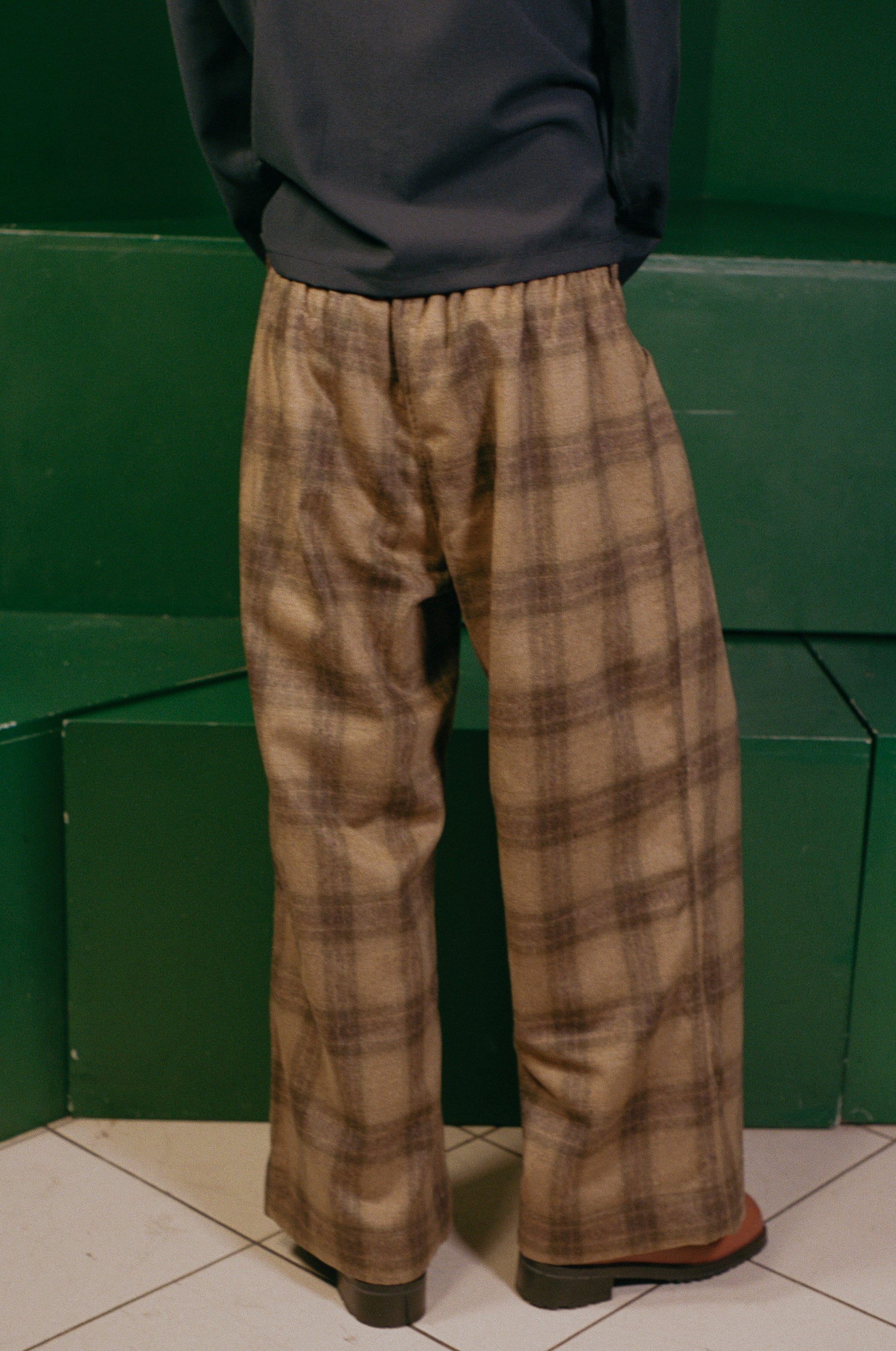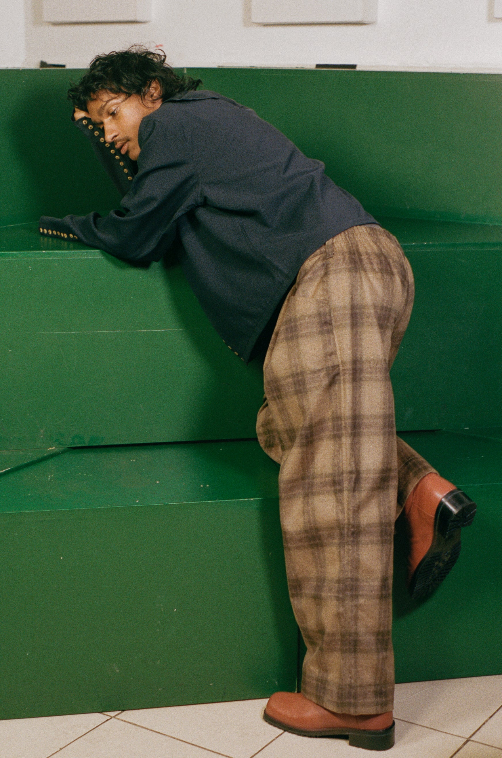 Straight cut and draped wool trousers in beautiful shades of warm and dark brown plaid, lined with light brown cotton. Inner hidden button up front with a stand out button closure at the top, in contrast with an elasticated waistband around the back. Belt loops and side slit pockets.