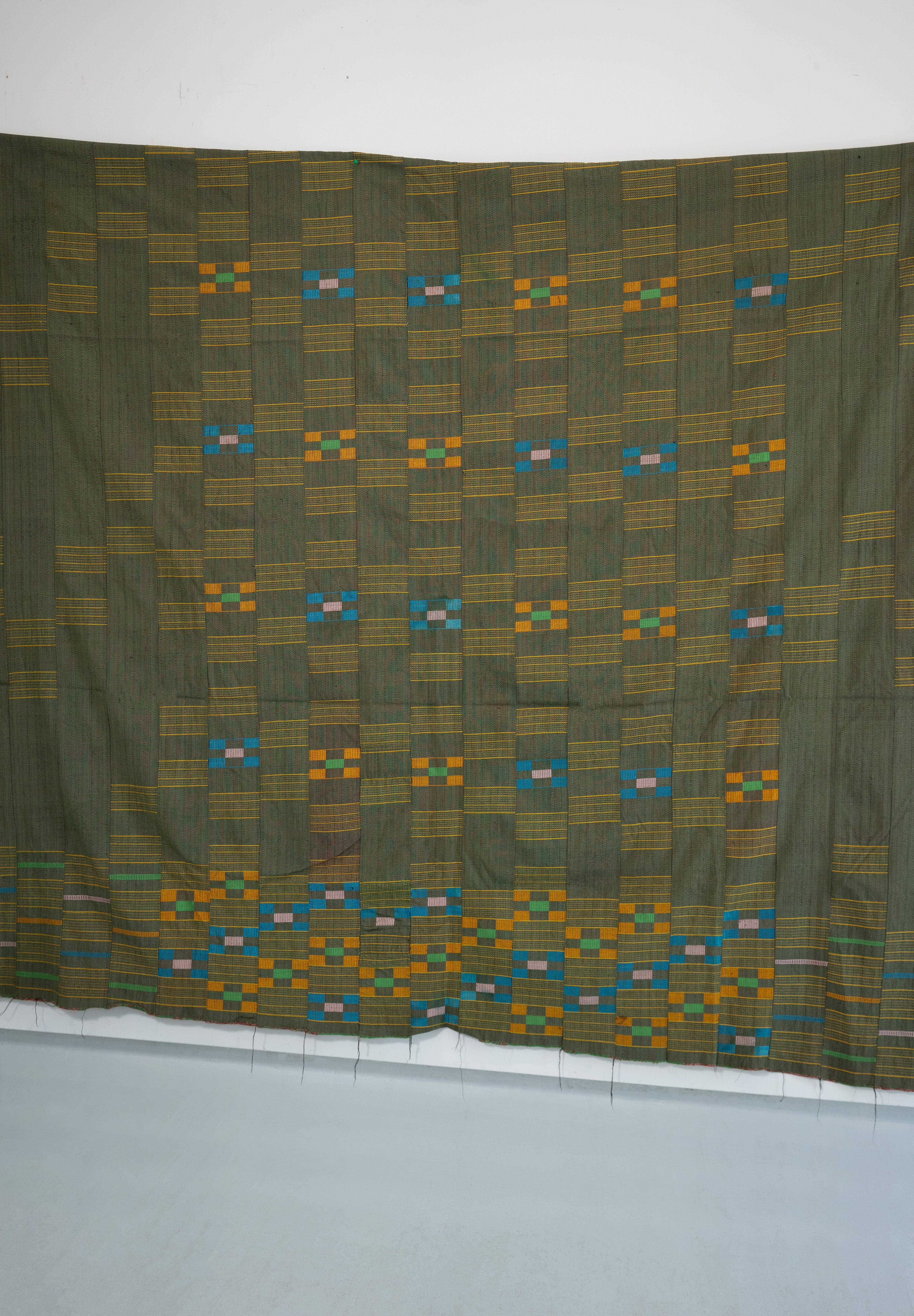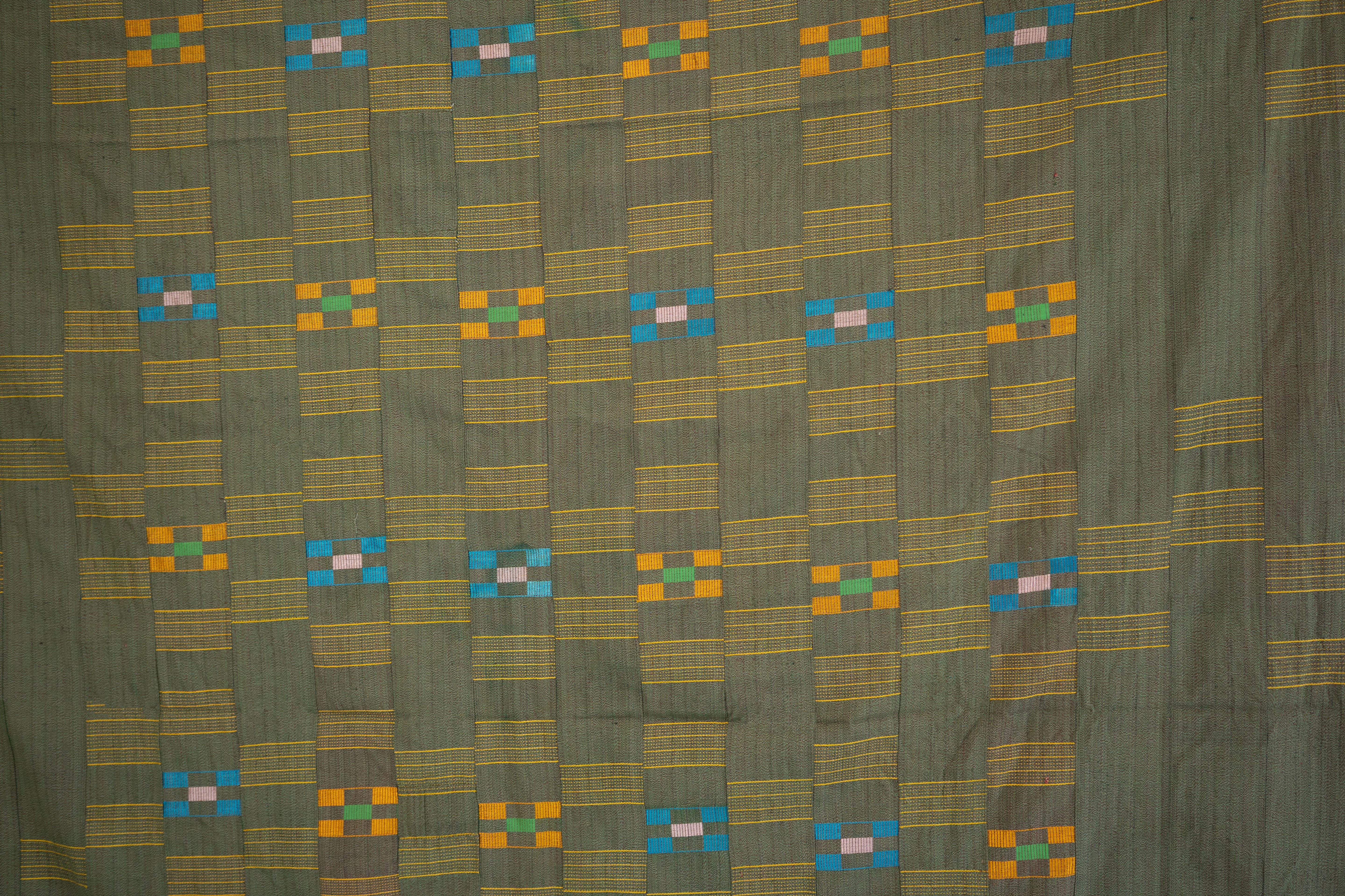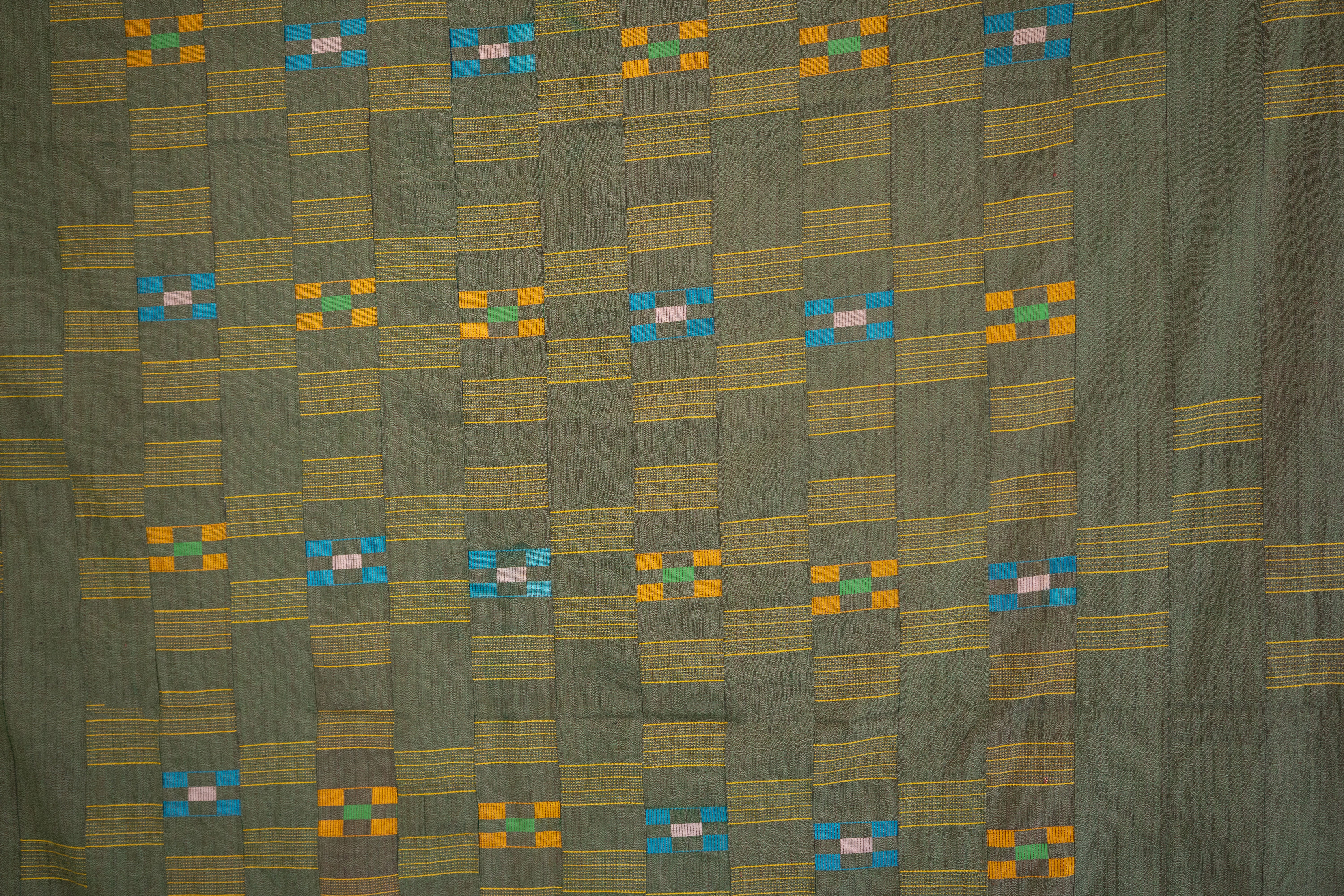 Large vintage ewe kente cloth in light forest green with pastel yellow, orange, blue, pink, and green floating weft designs throughout.