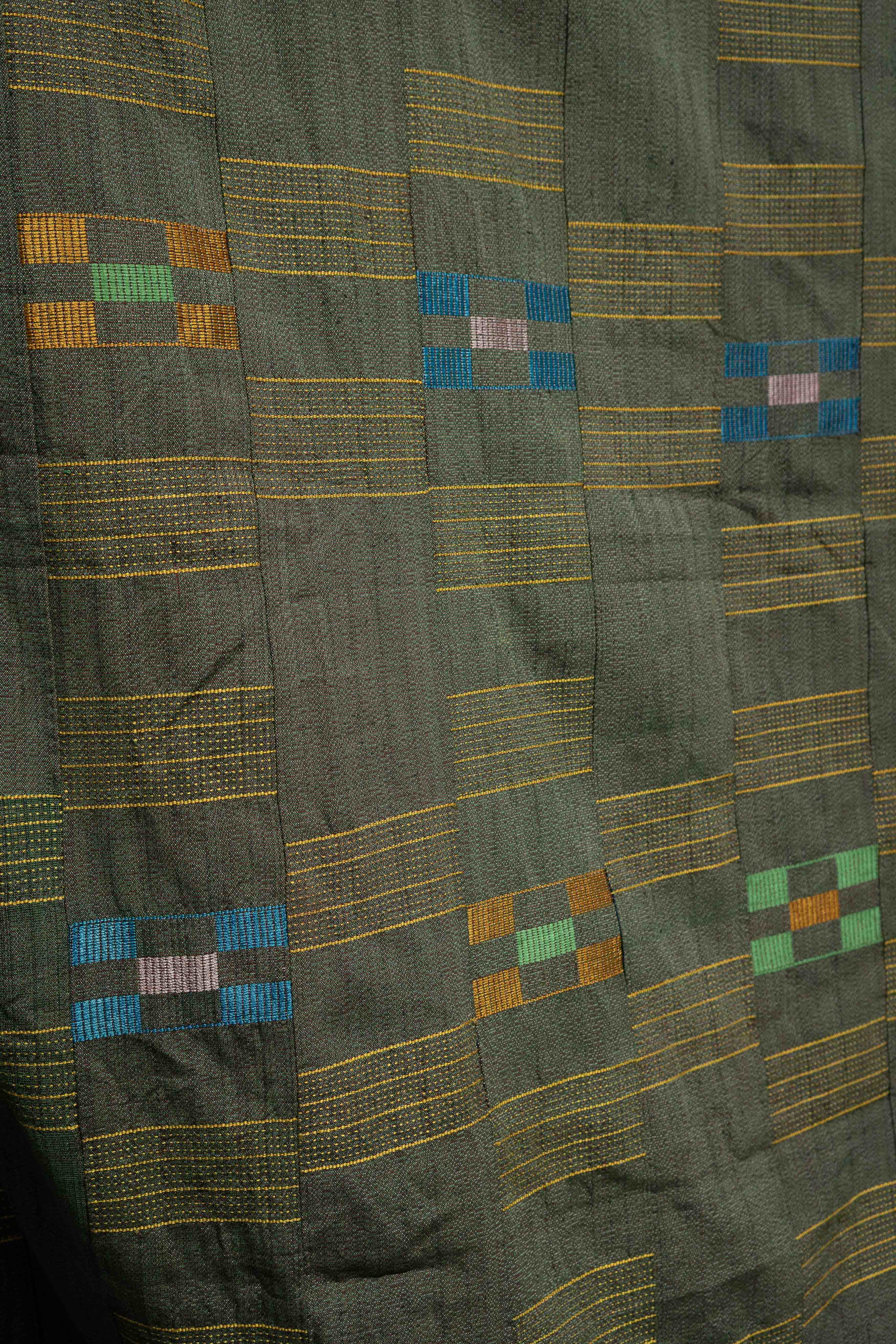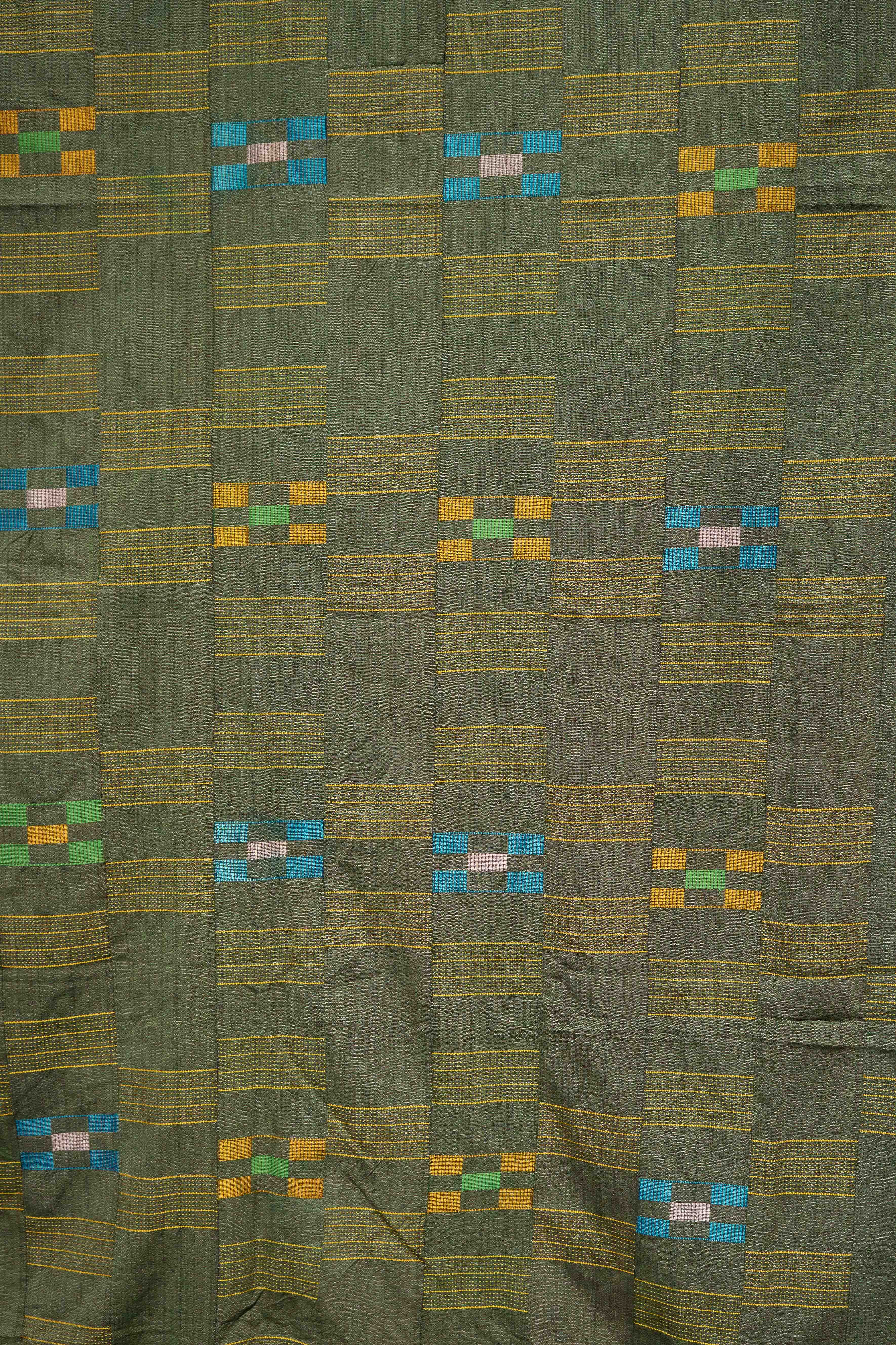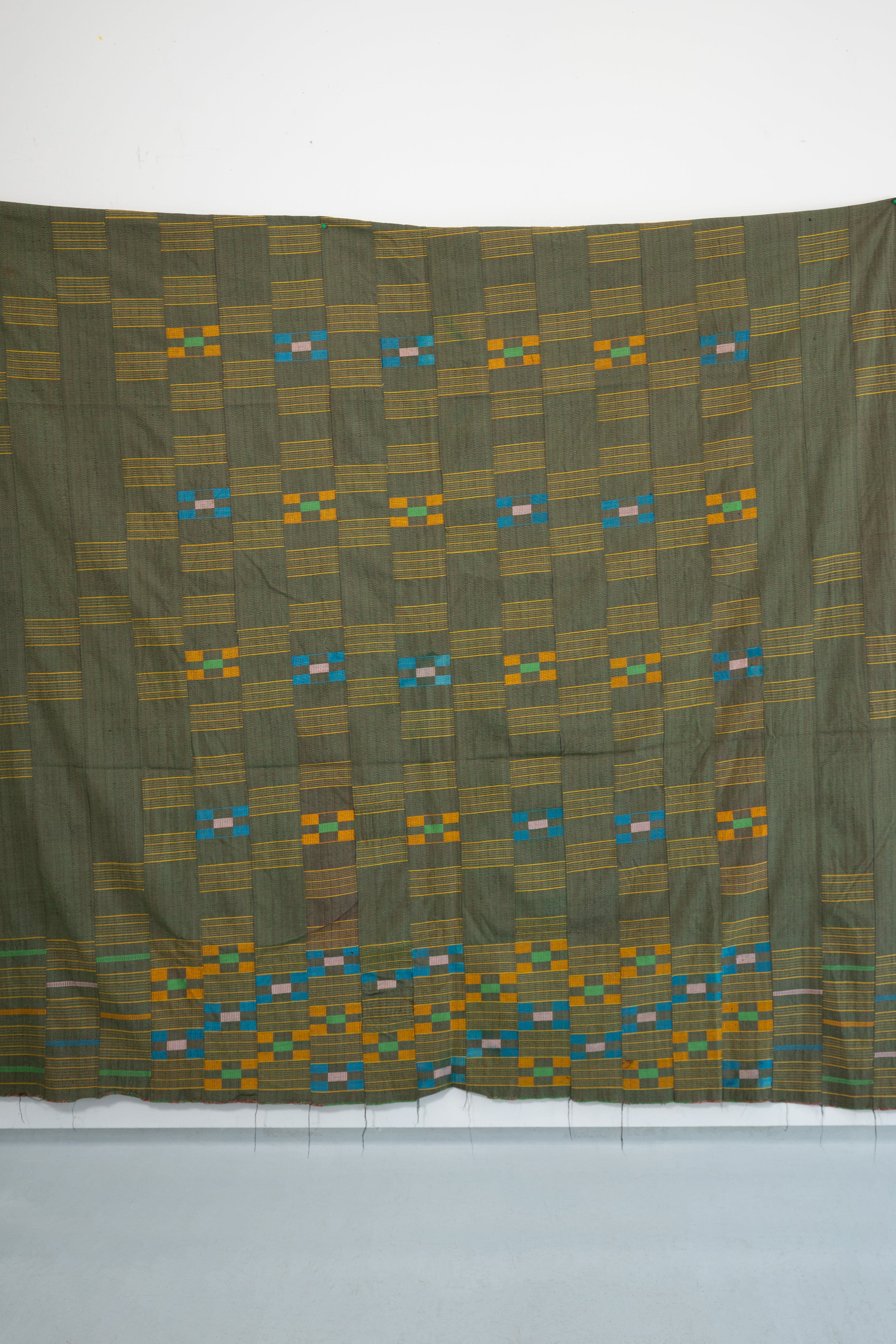 Large vintage ewe kente cloth in light forest green with pastel yellow, orange, blue, pink, and green floating weft designs throughout.
