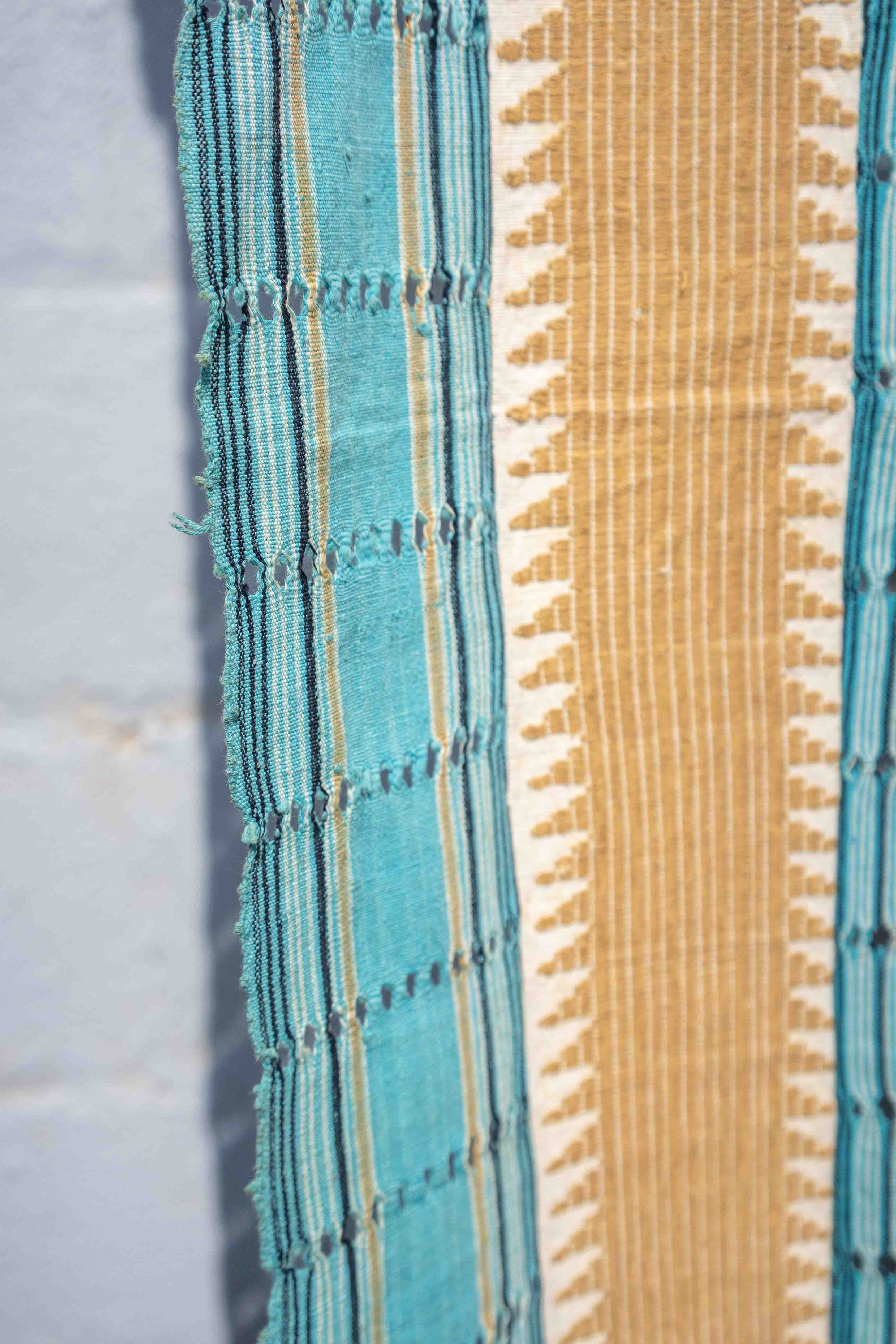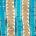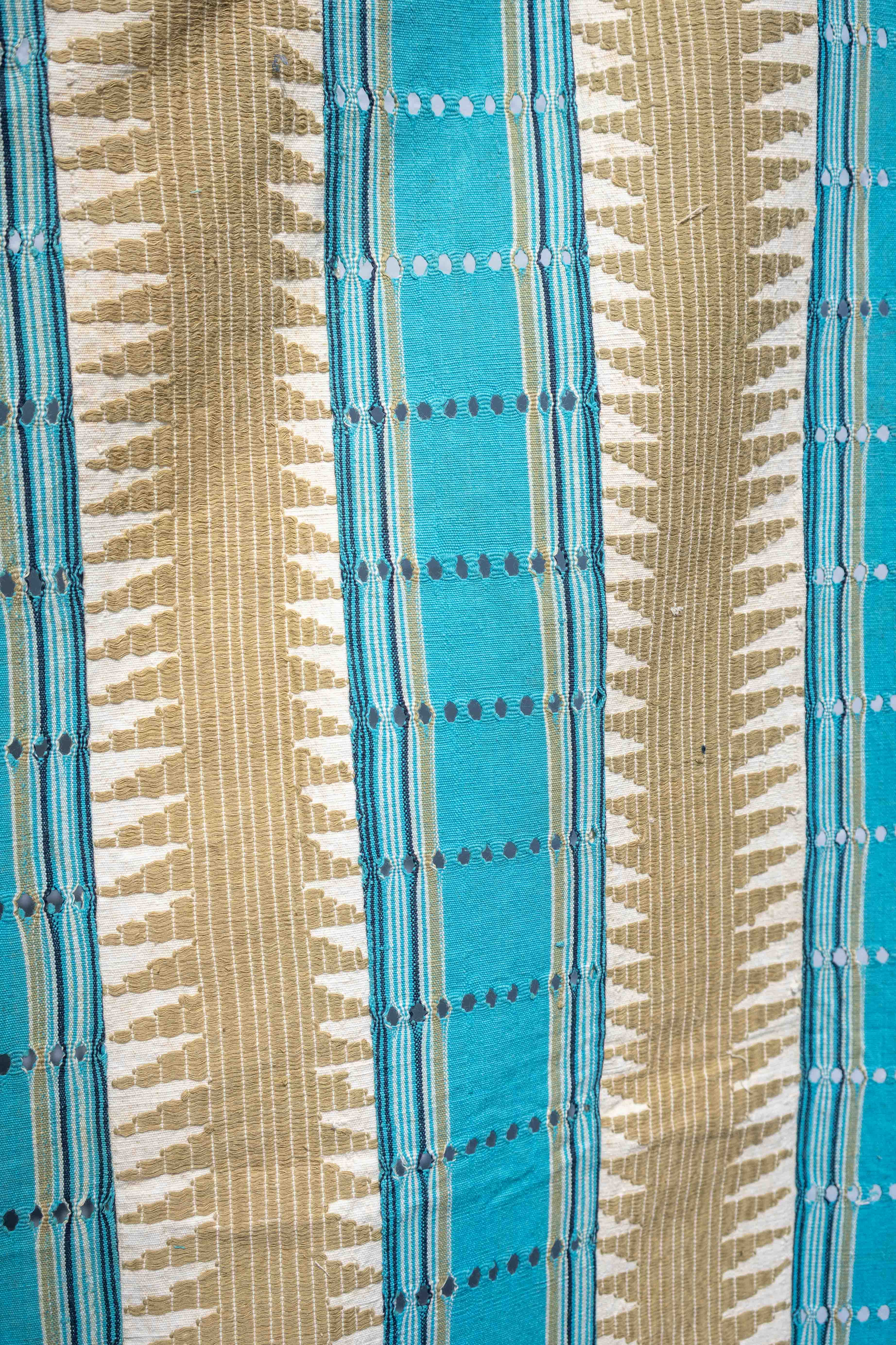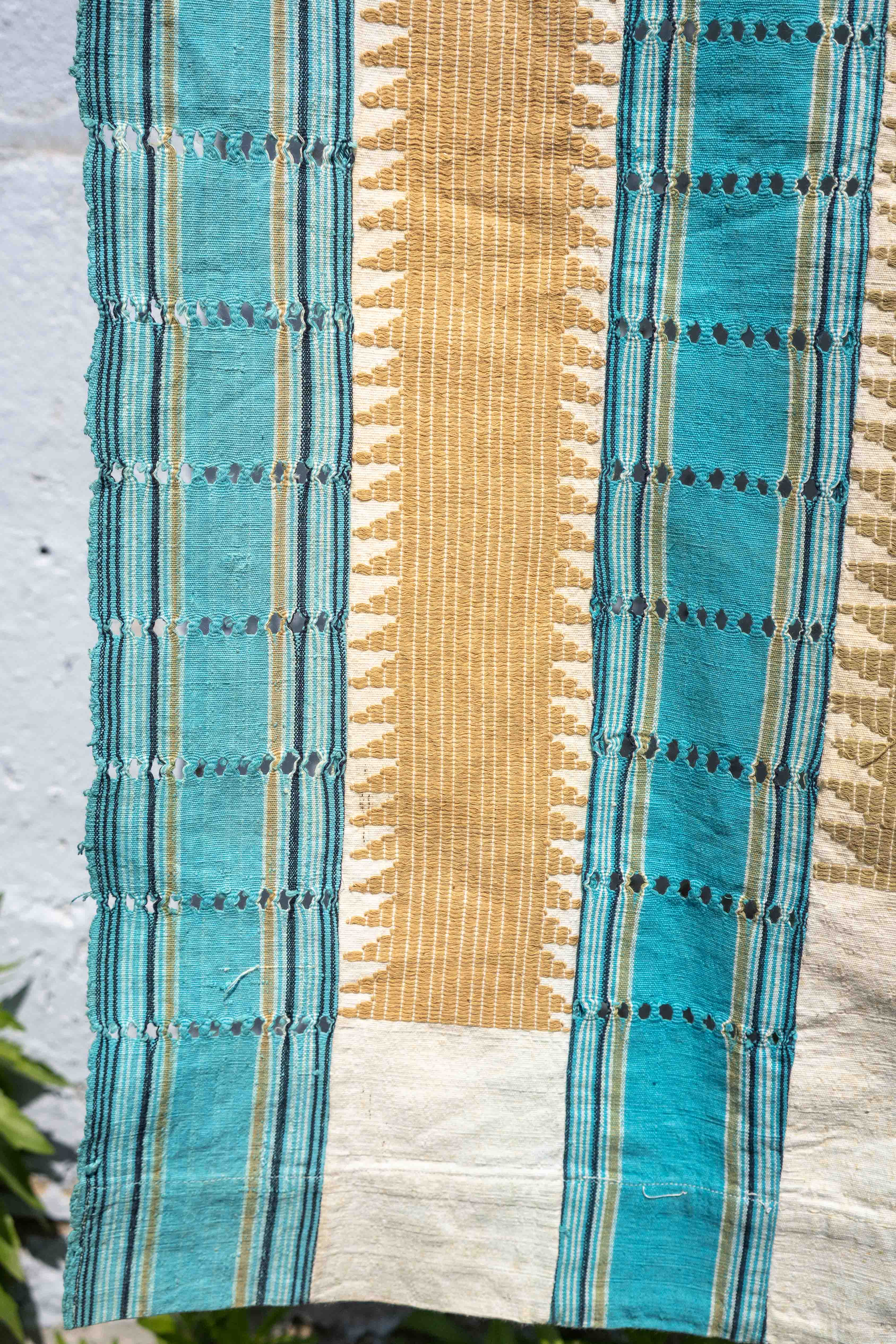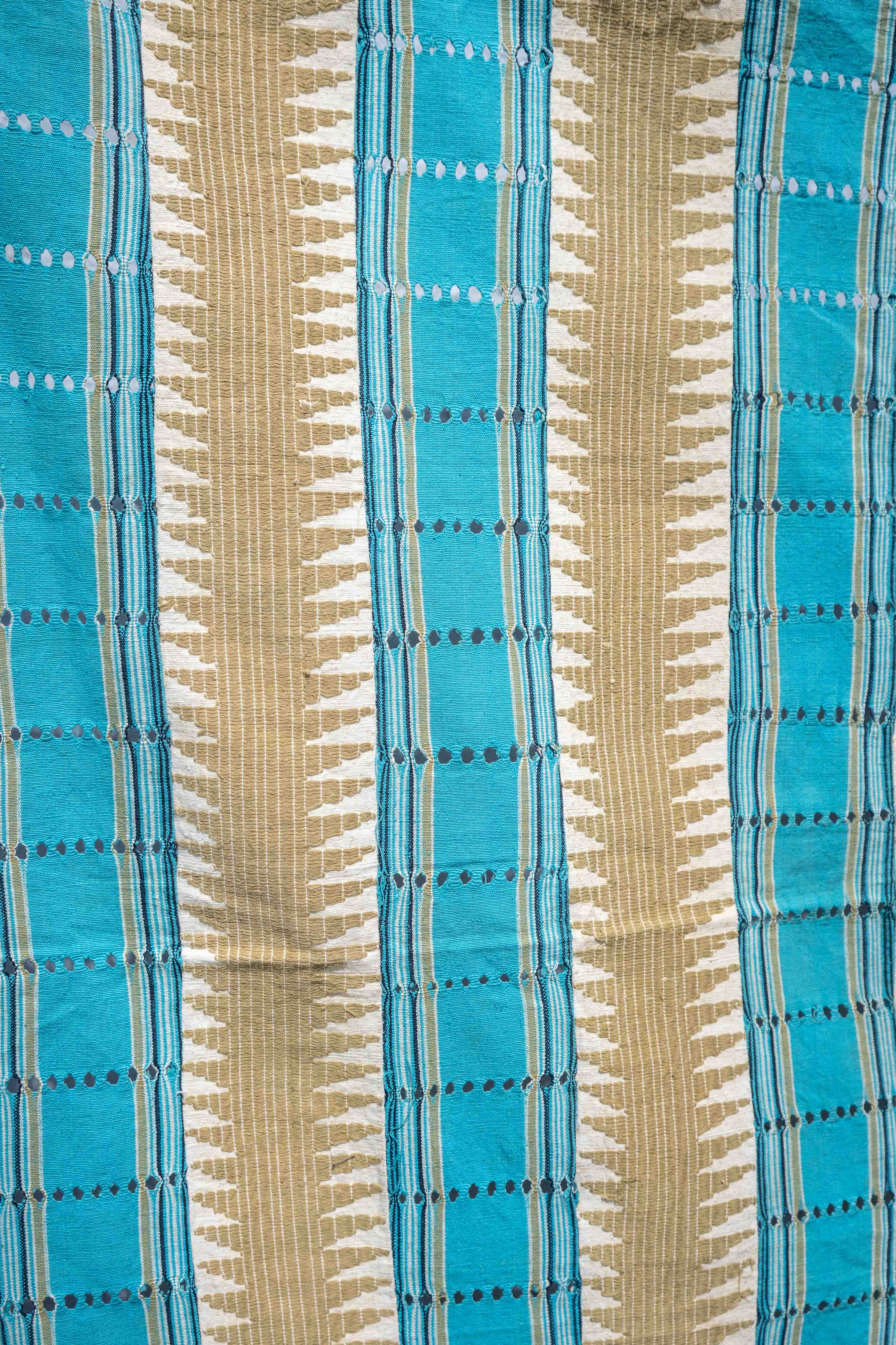 Turquoise and light brown vintage aso oke cloth featuring alternating rows of openwork.