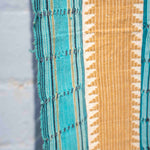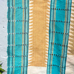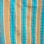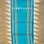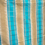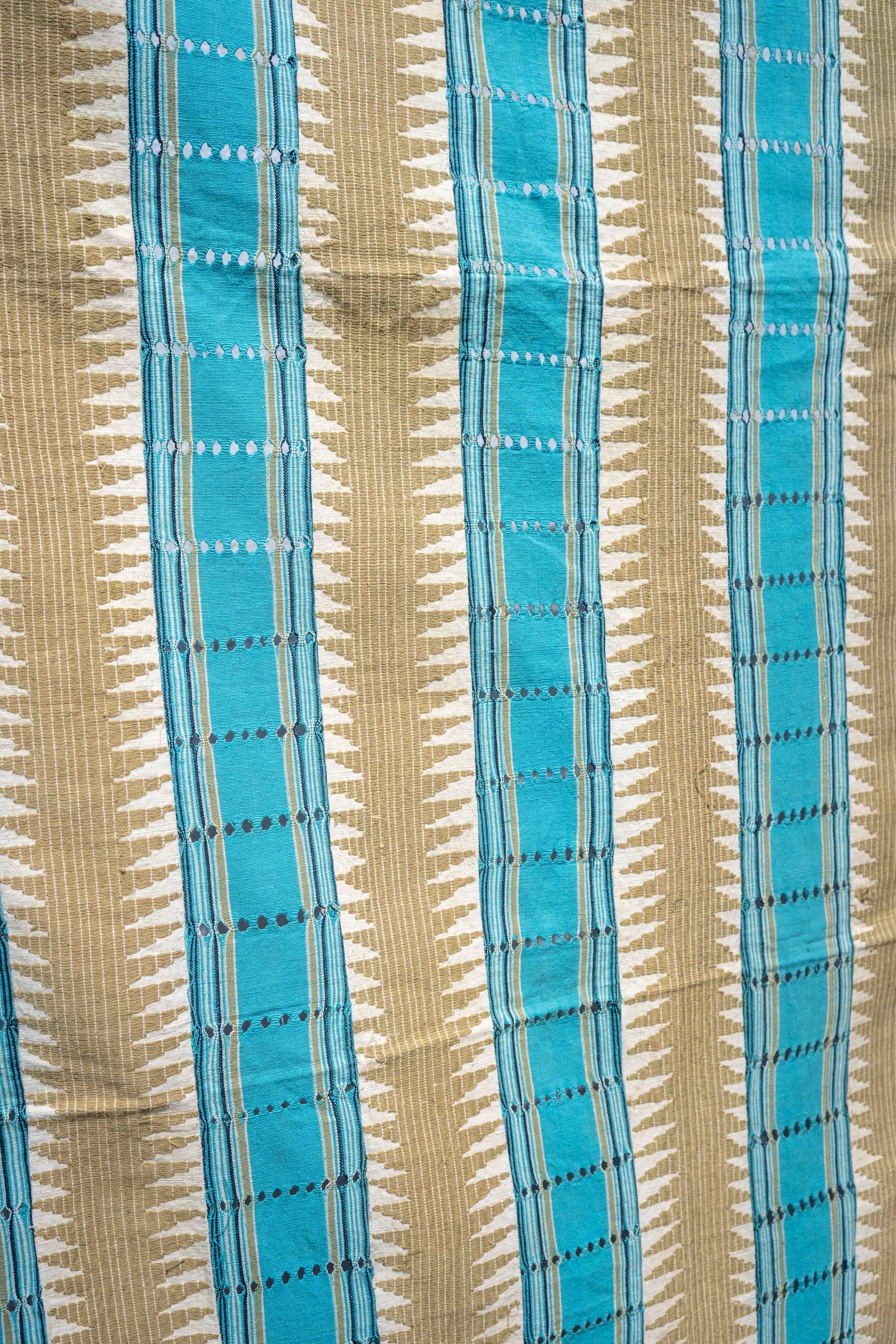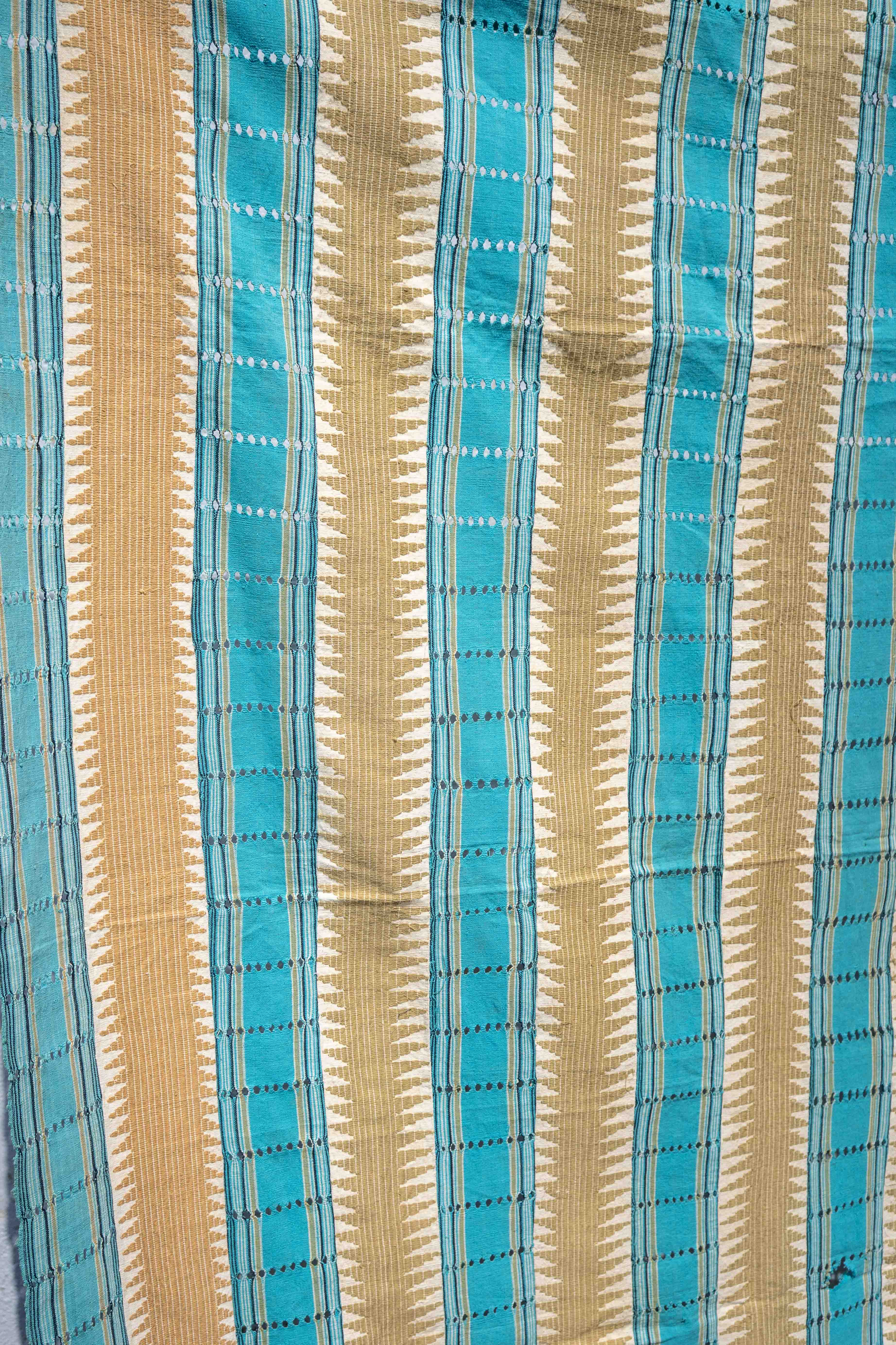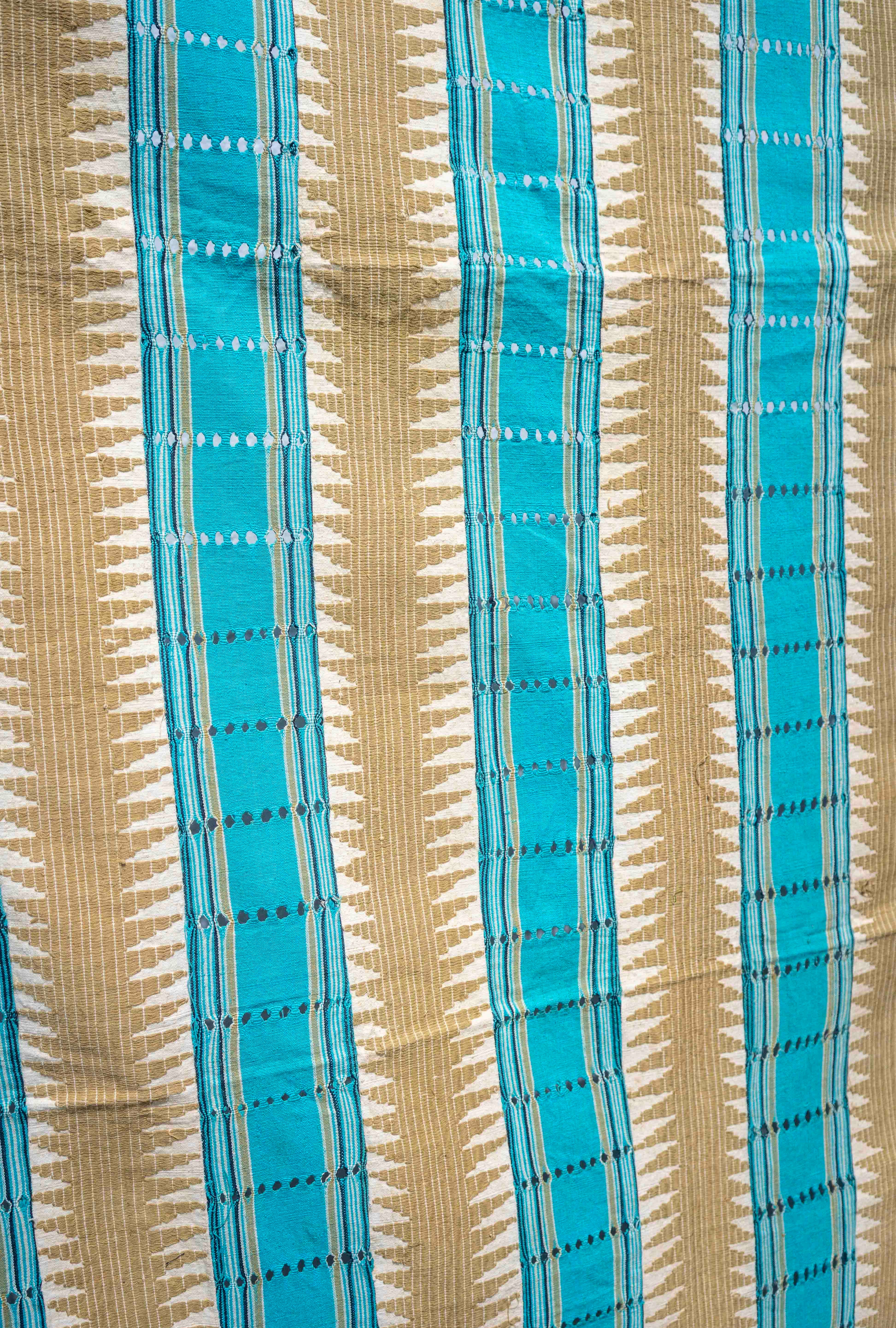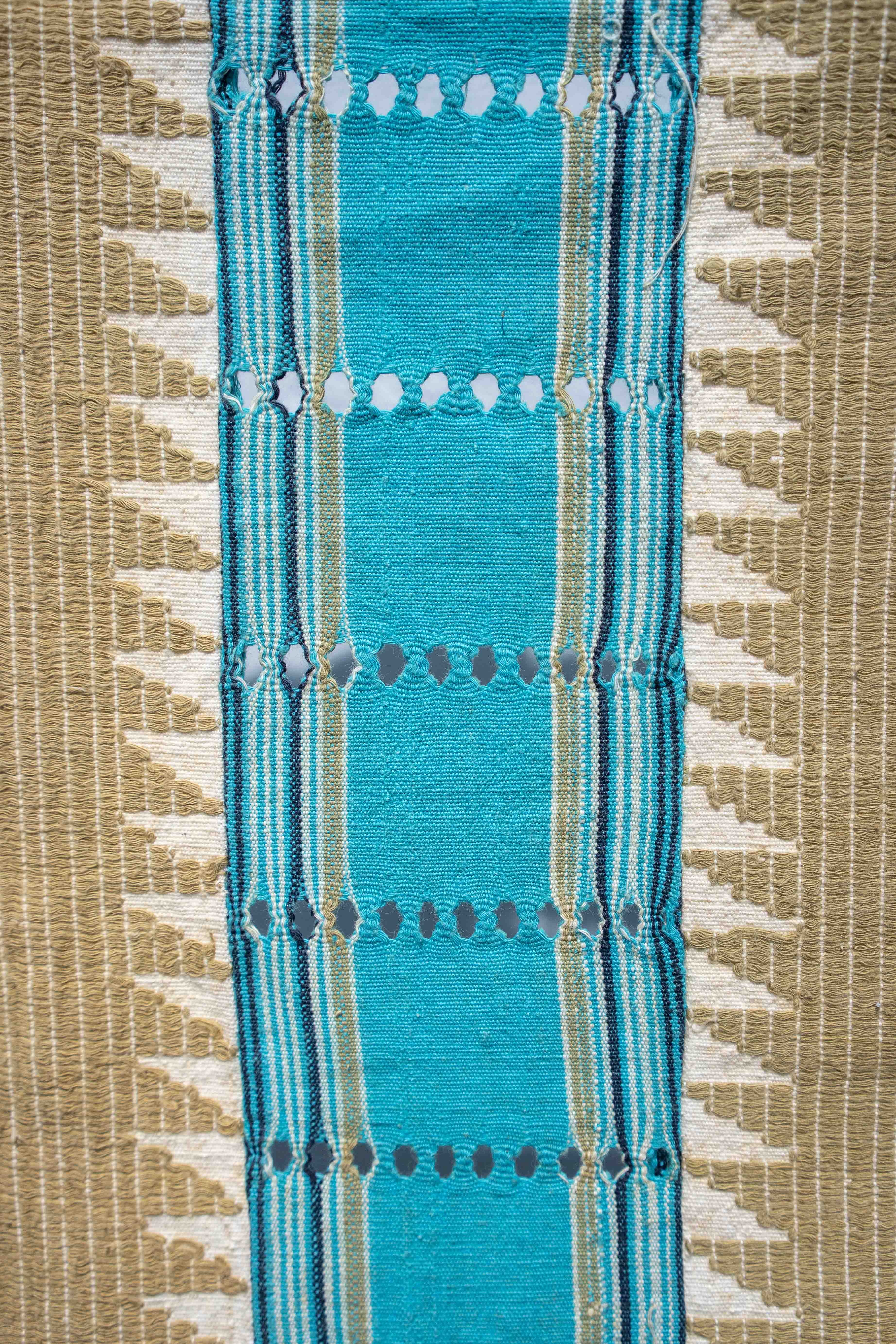 Turquoise and light brown vintage aso oke cloth featuring alternating rows of openwork.
