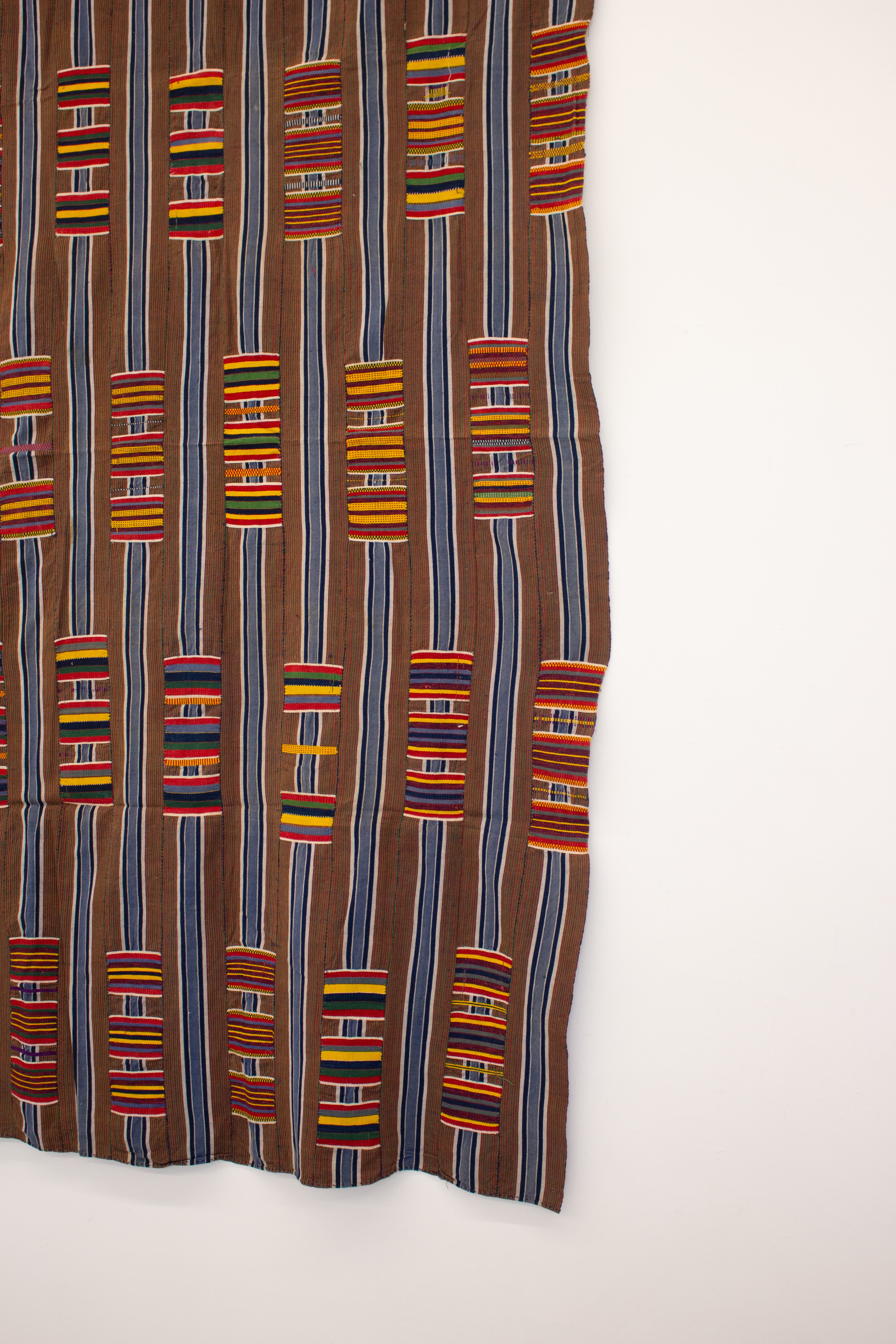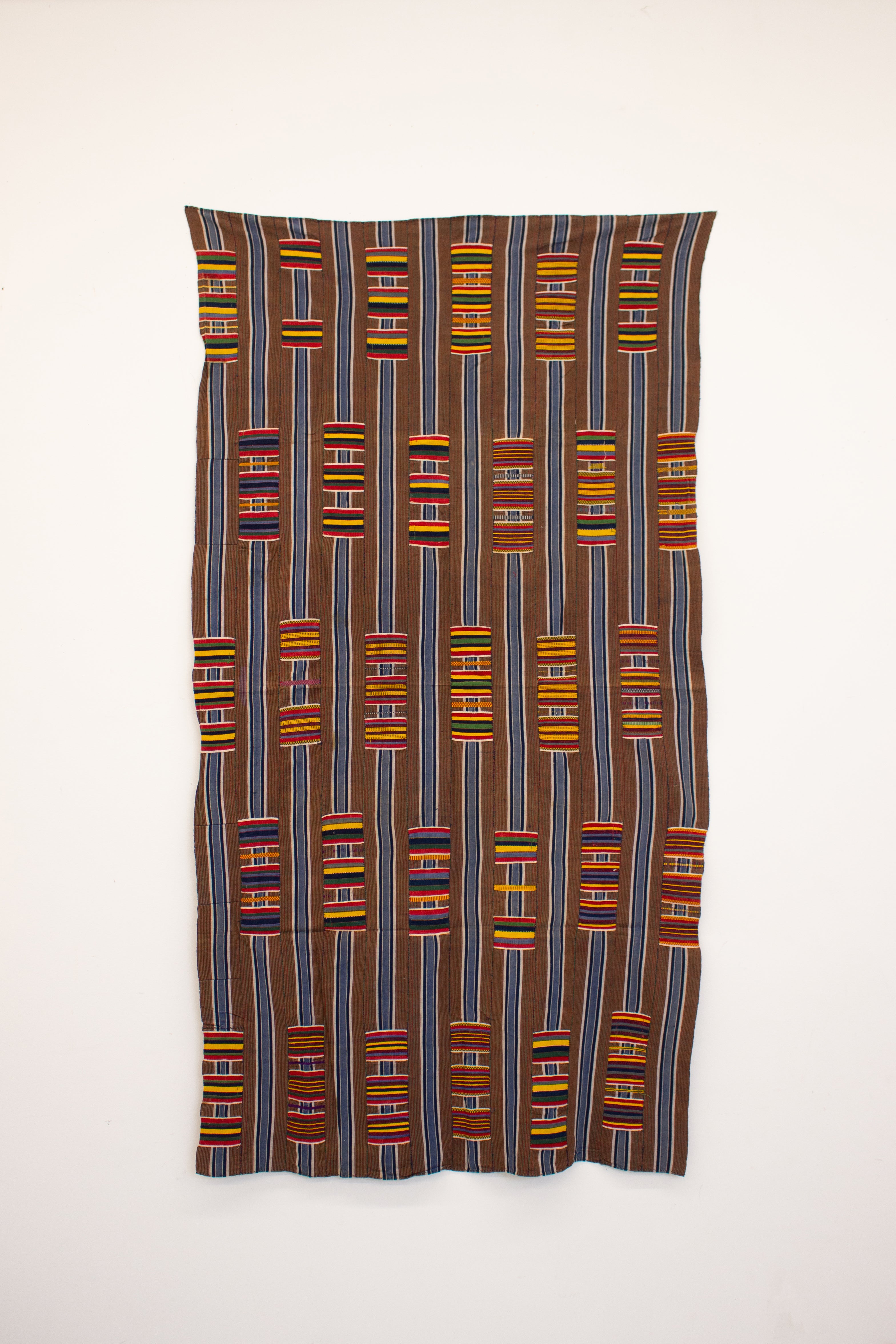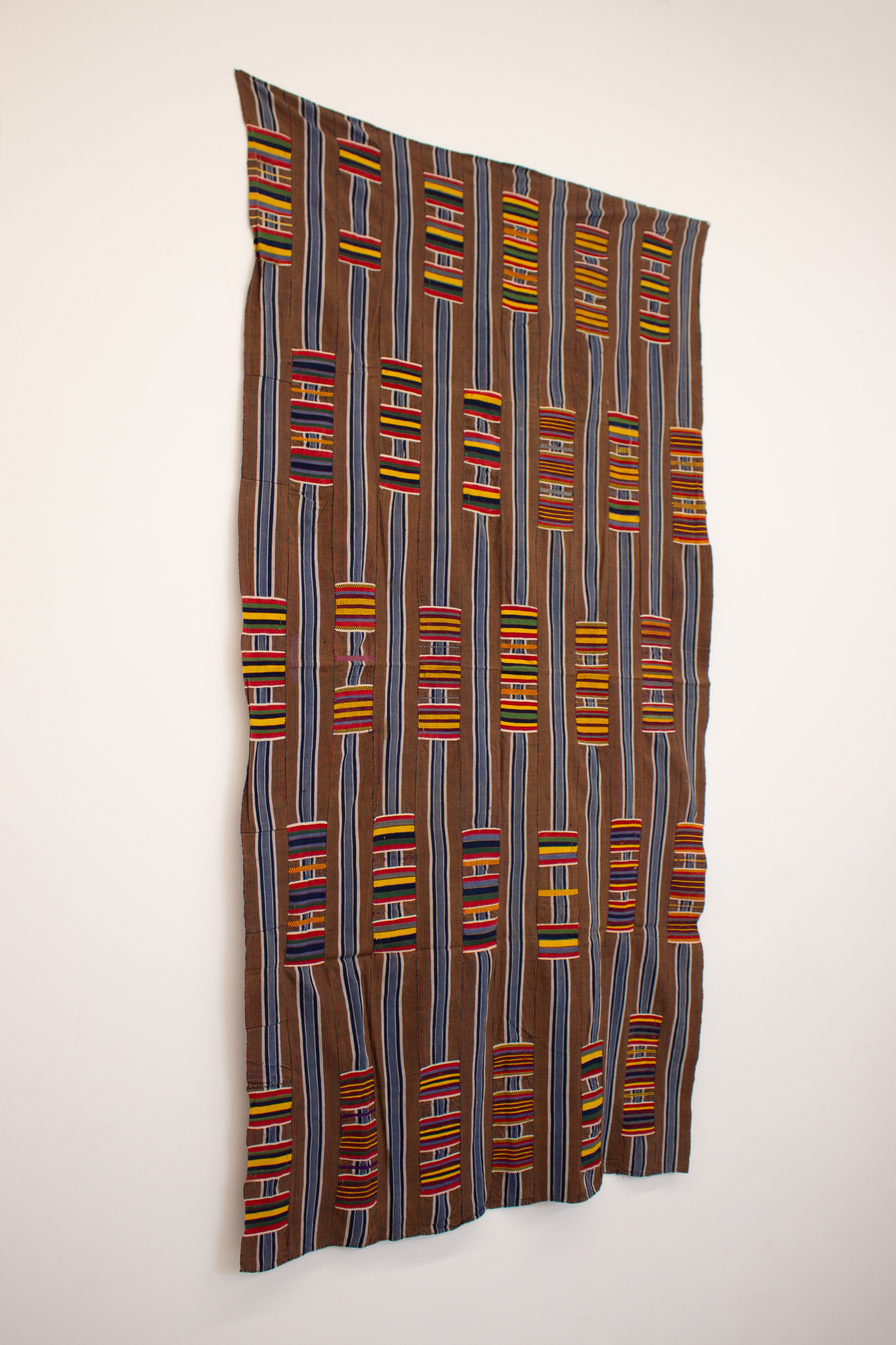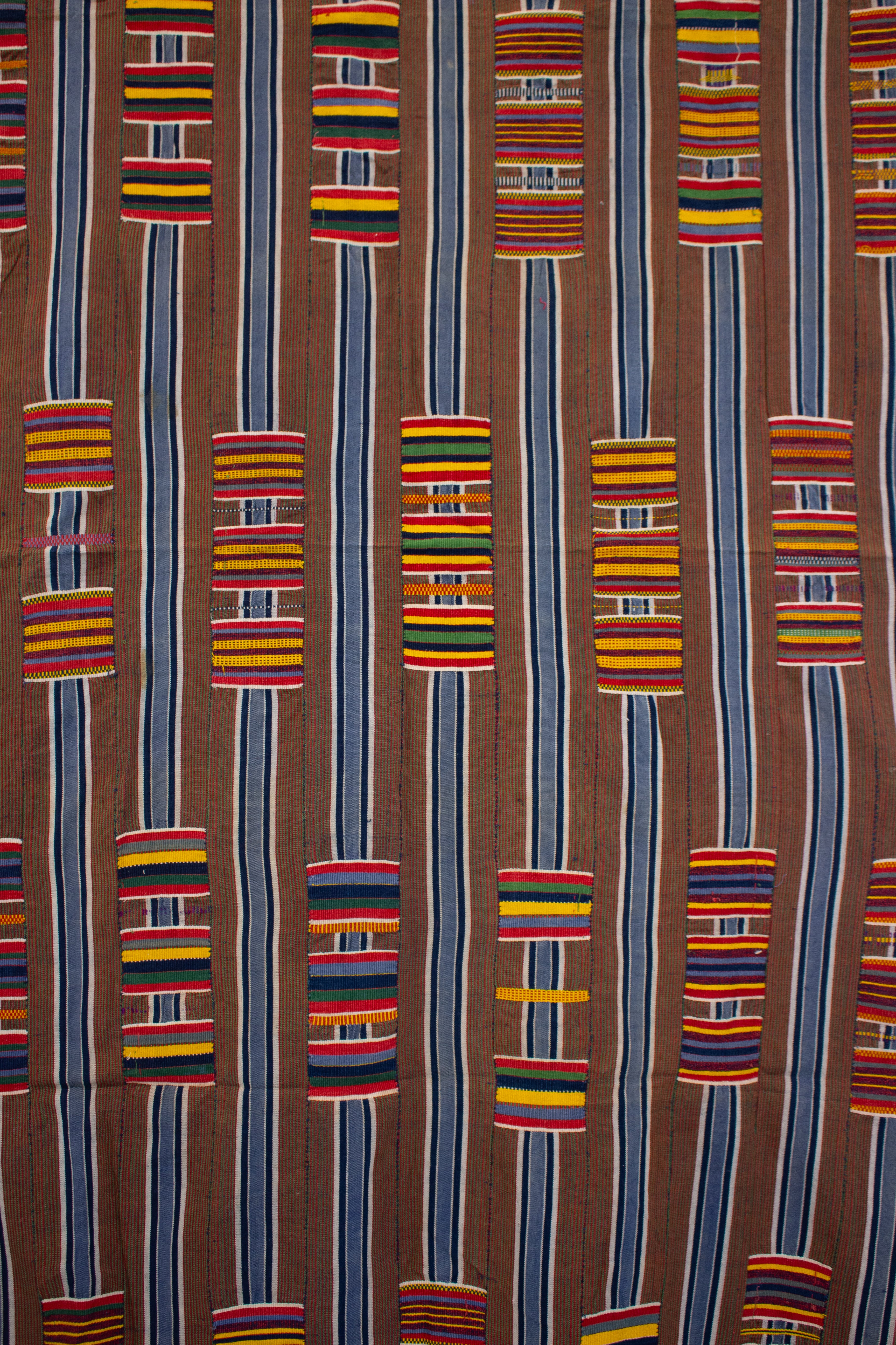 Considered one of the most significant textiles of the African subcontinent, kente cloth was historically made from silk, reserved for chiefs and kings, and worn as festive dress on special occasions, such as a gathering of elders or the inauguration of new royalty. This style of kente cloth comes from the Ewe people of Togo and Ghana. Ewe kente abounds with proverbial symbolism of both animal and inanimate kind.