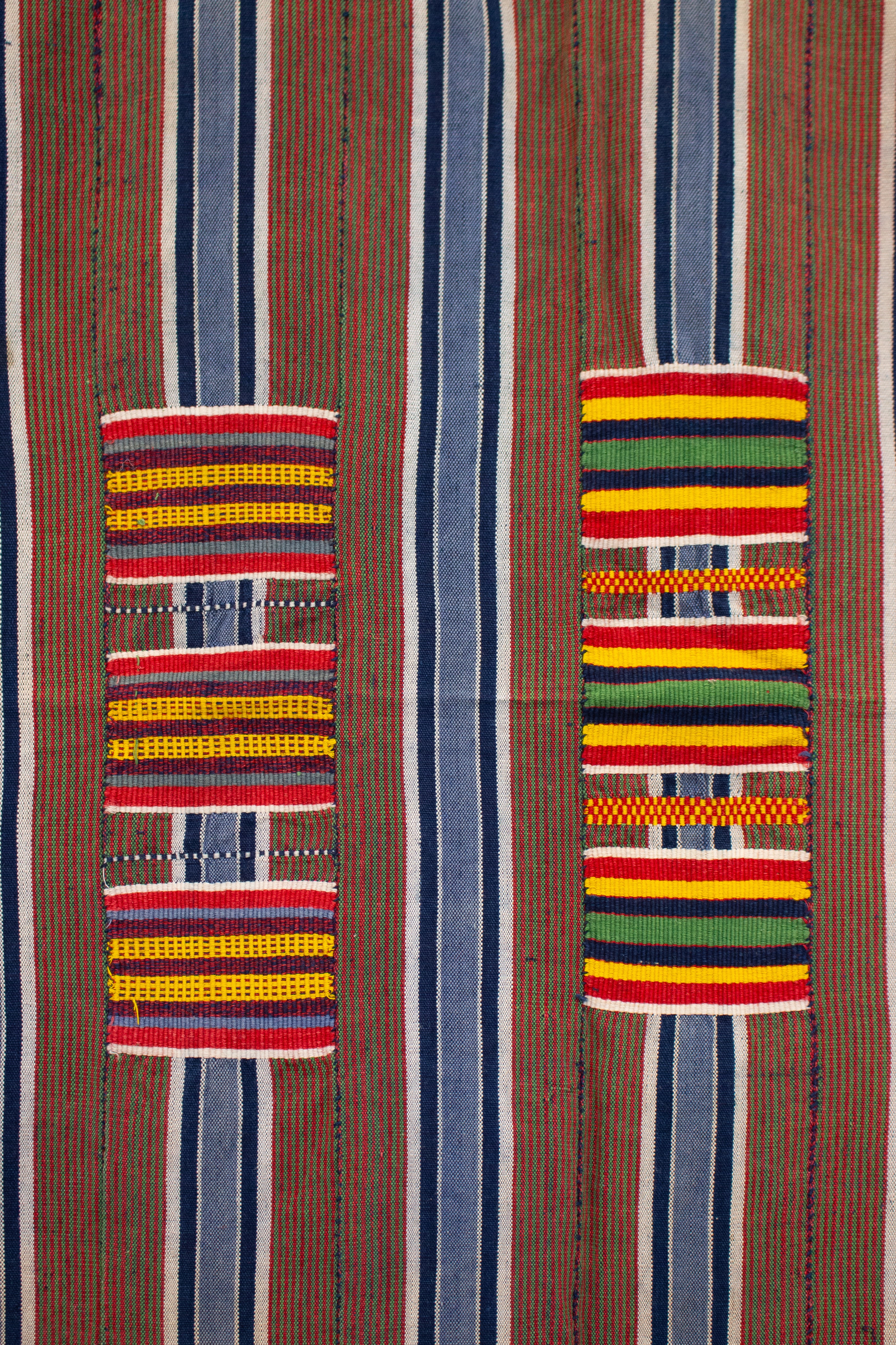 Handwoven multi-colored stripe cloth with bright pastel floating weft blocks of colour. The complex Ewe weaving technique used is called "Novie-Akpedo" and means Unity.