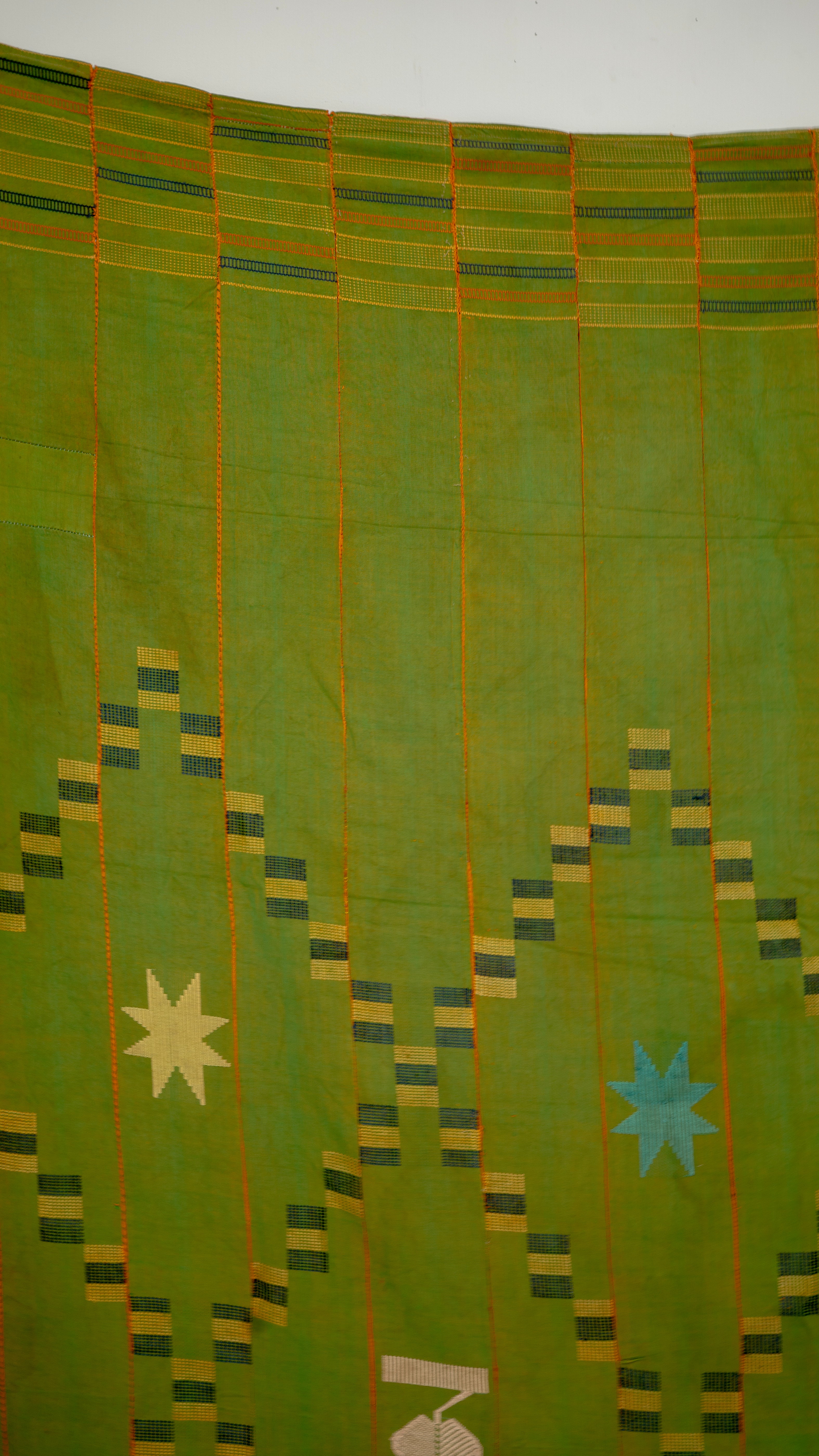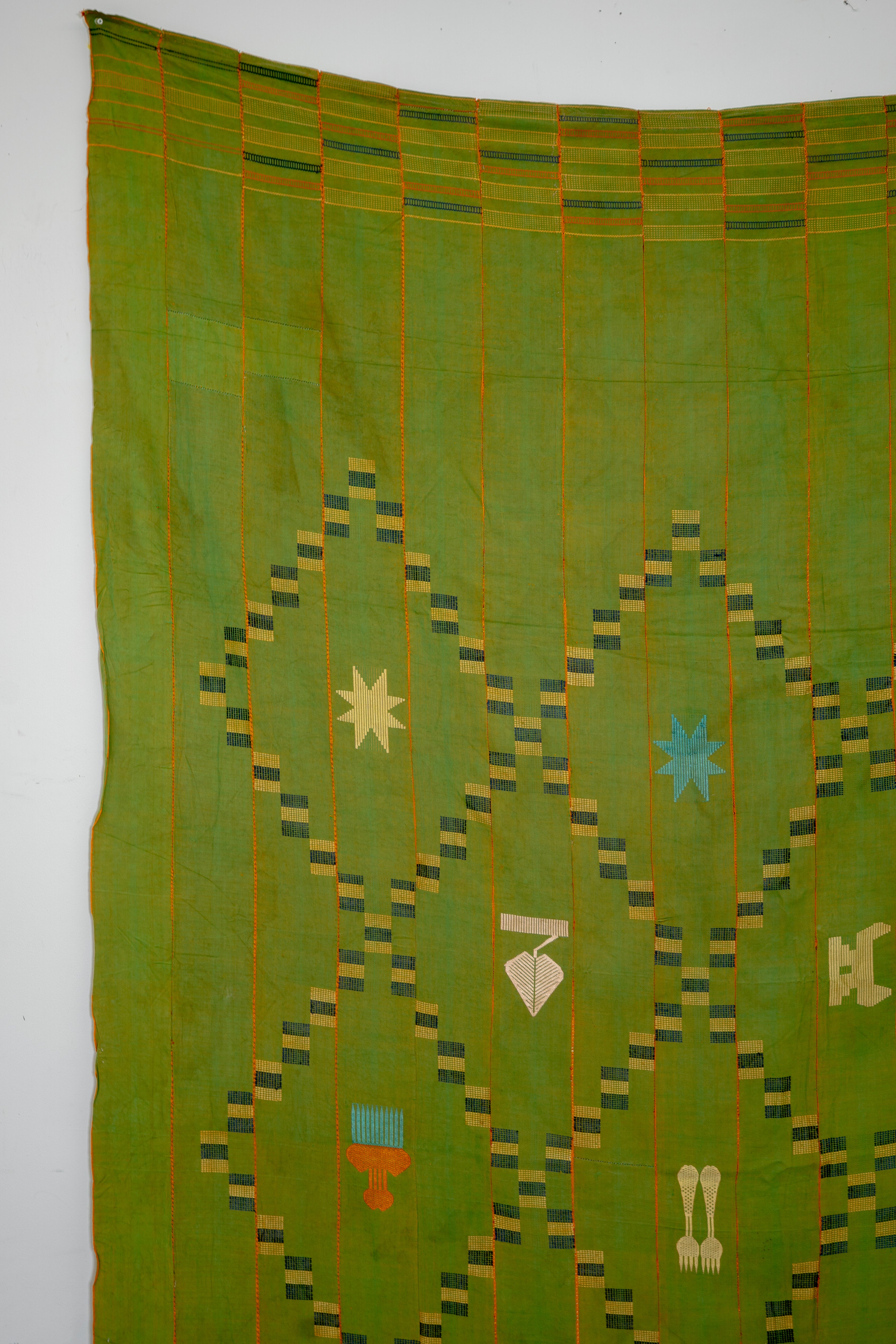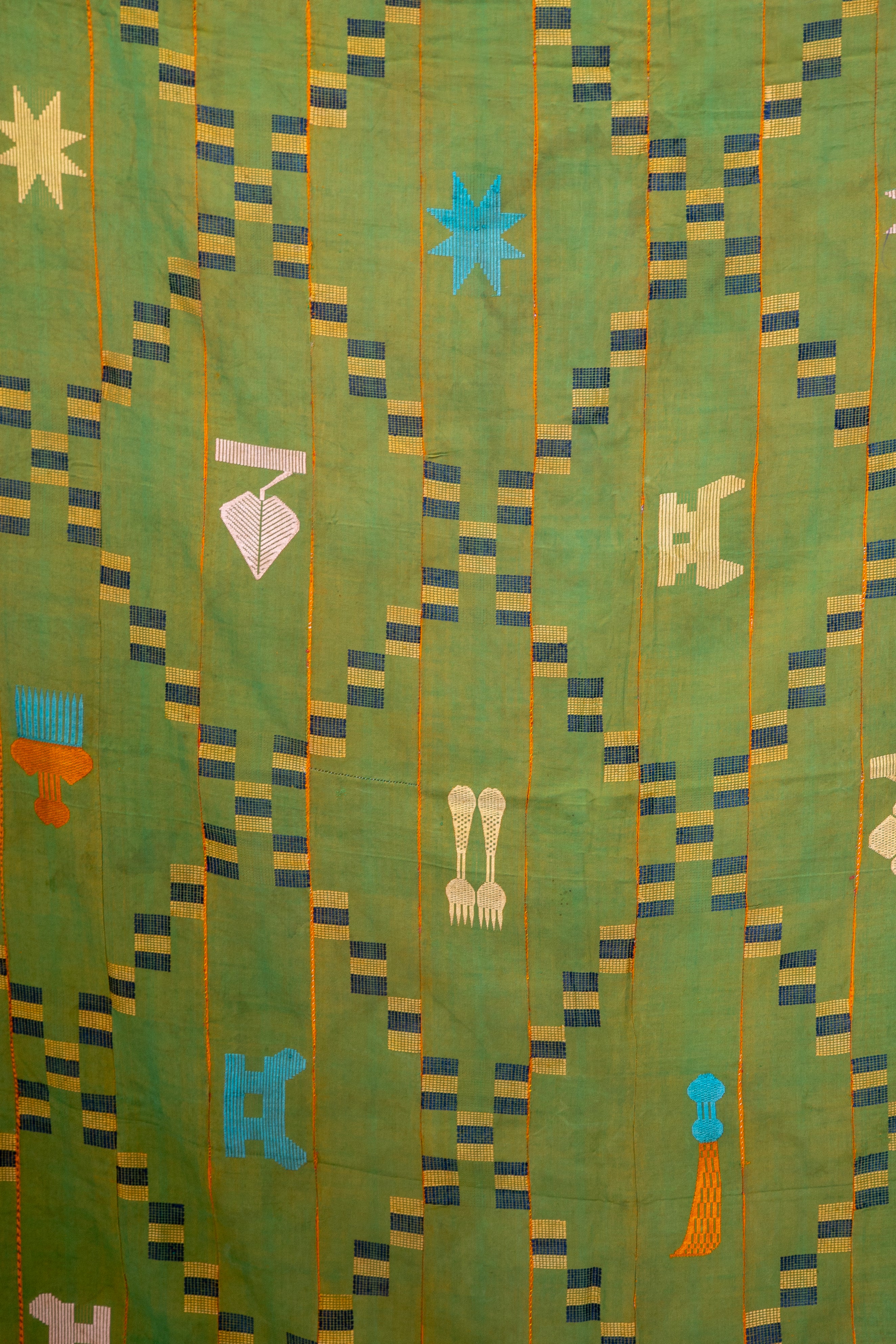 Large ewe kente cloth with a green background, orange horizontal stripes, and floating weft blocks in navy and yellow creating a diamond like pattern throughout. Adorned with brightly coloured symbols throughout.