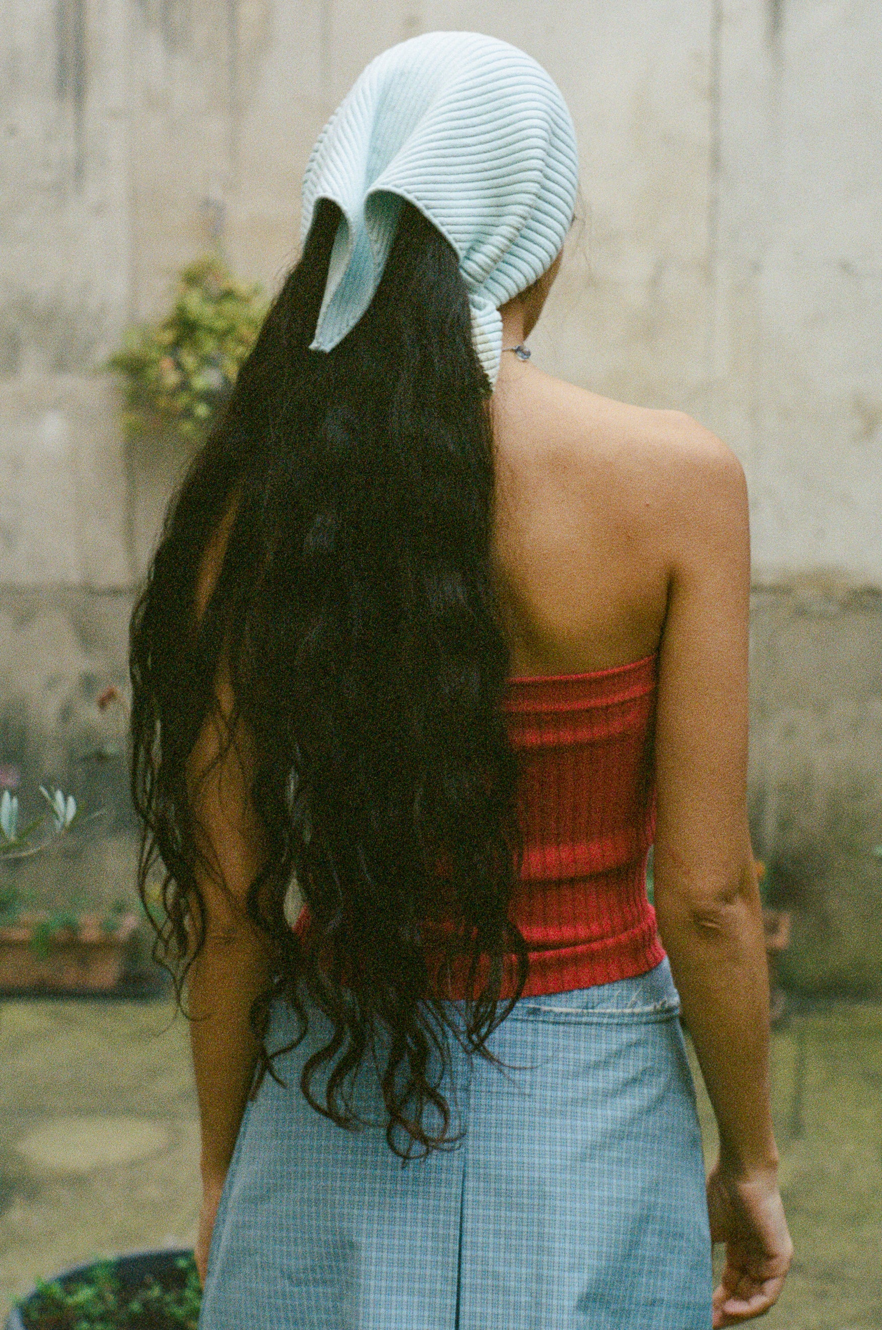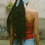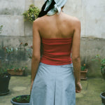 Maryam wears with the Nonna Tube in Strawberry, Mini Skirt in Blue/Grey/White Check, and Noue Necklace in Pale Blue/Grey.