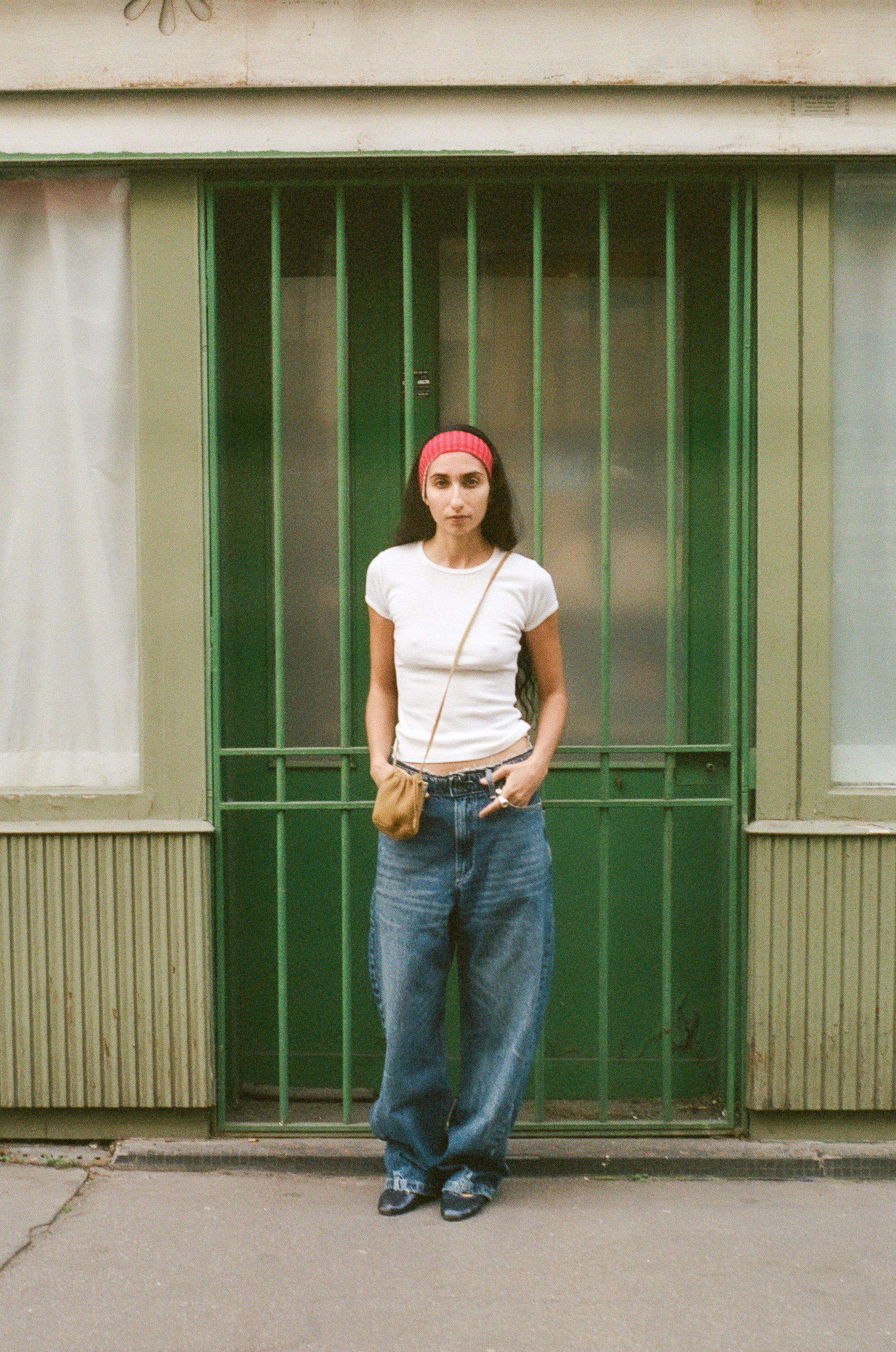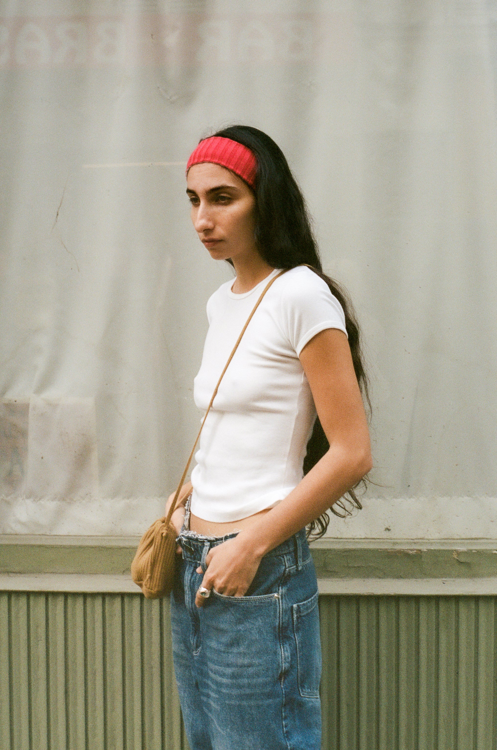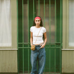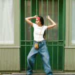 Maryam wears with the Wobbly Jeans in Vintage Wash Denim, Nonna Pochette in Cargo, and Lago Ring in Silver/Aquamarine.
