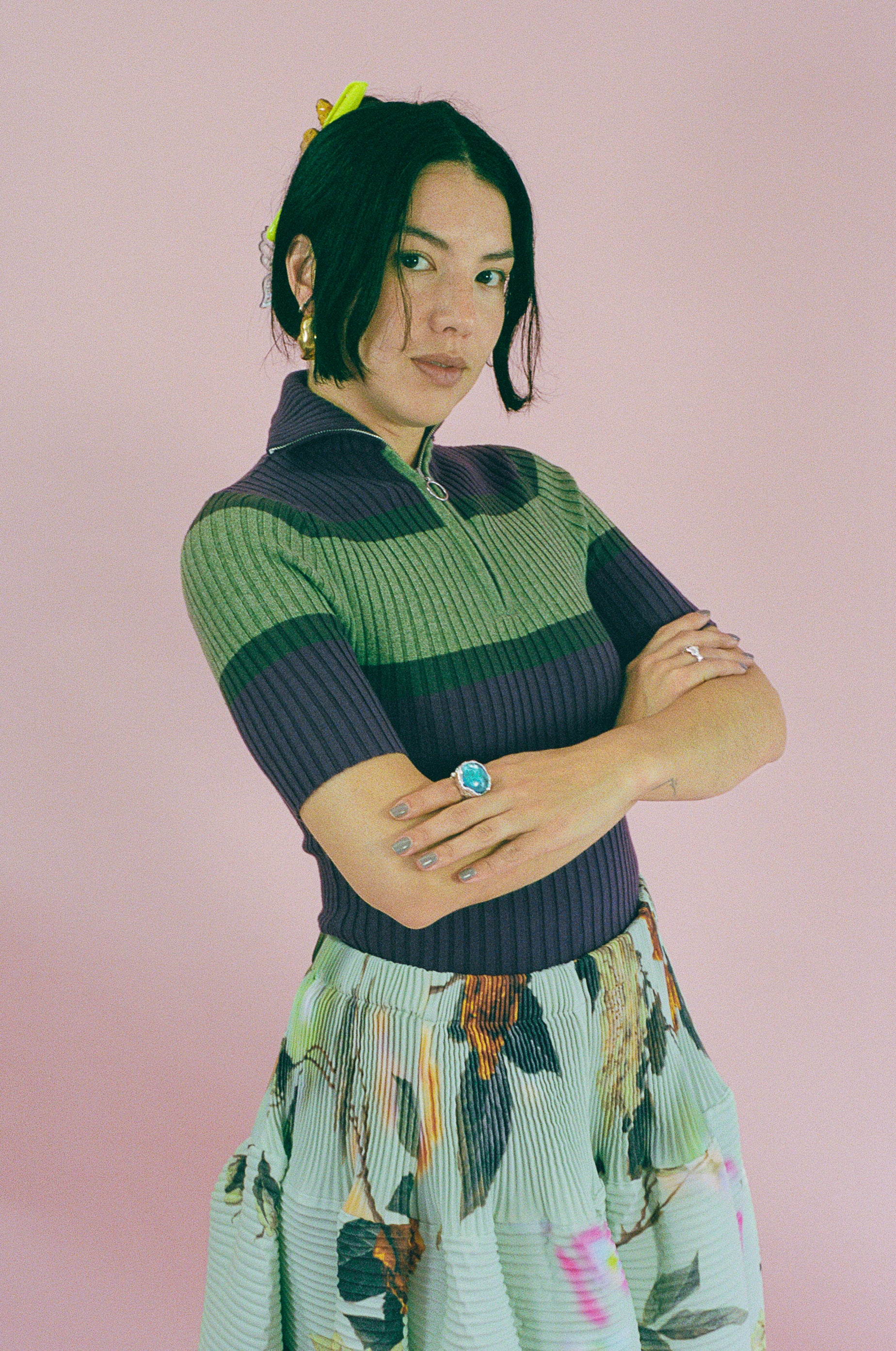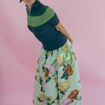 Jenn is 5'7 and a size small, and wears size small with the Kenza Skirt in Edward, Satin Mary Jane Theatre Shoe in Navy, Pompas Earrings in Gold, Atolón Ring in Silver/Blue, and Ola Ring in Silver/Brown.