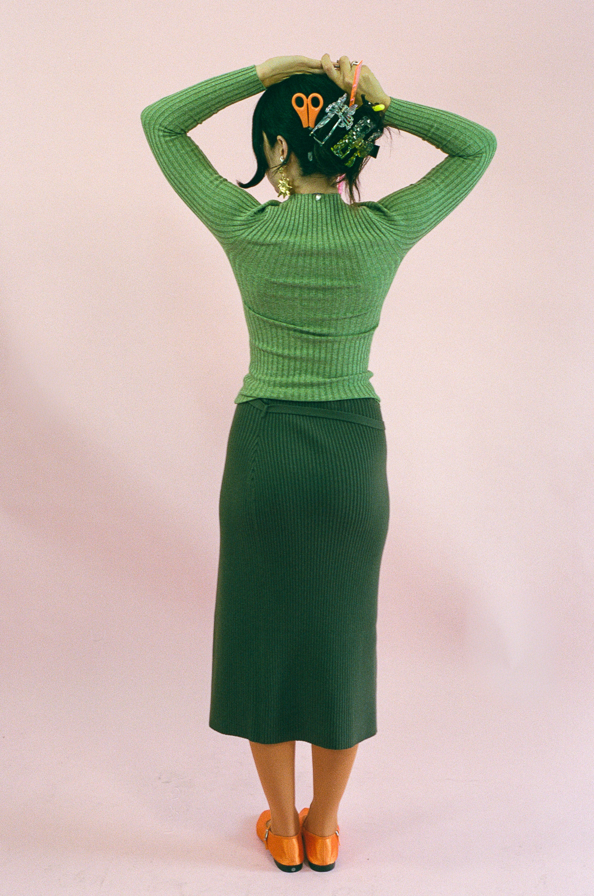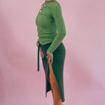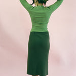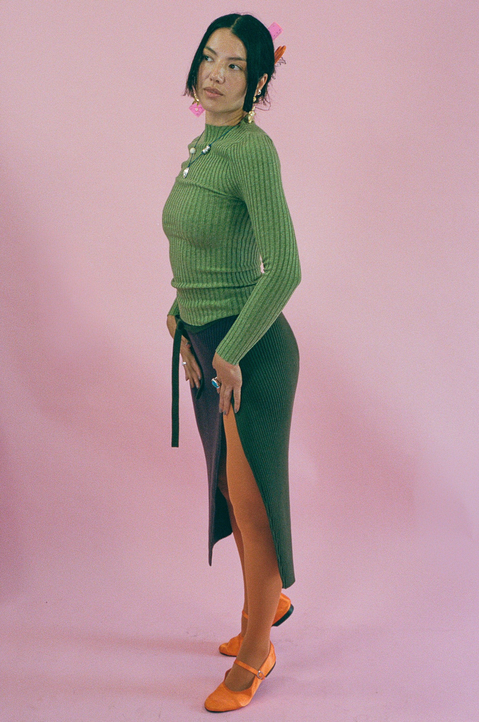 Mid length fitted wrap skirt in eggplant purple and forest green. Features a deep rib that comfortably conforms to your body. This piece will mould over your form and stretch to fit exactly your shape while smoothing over lines.