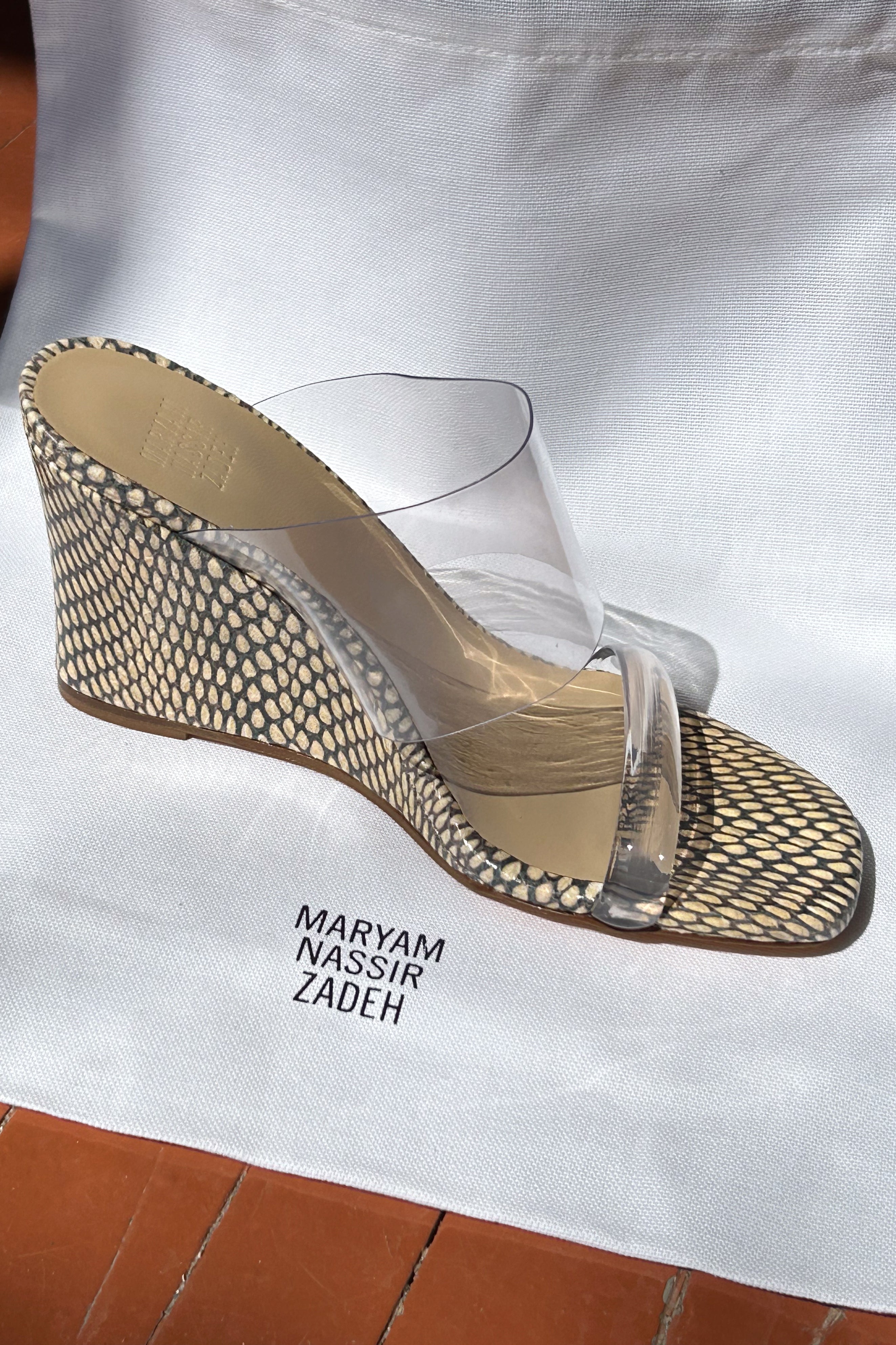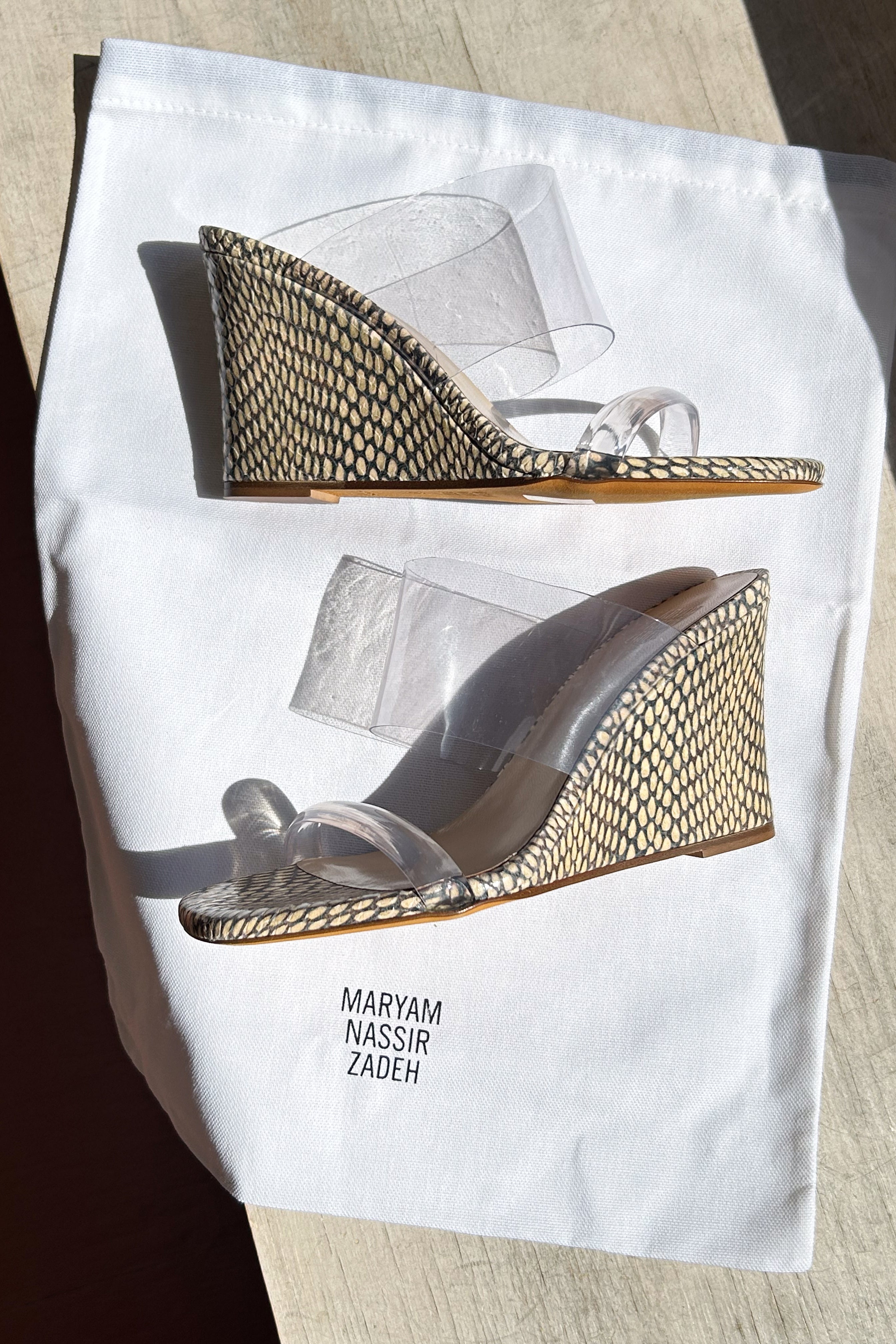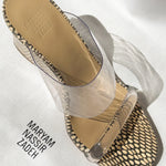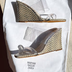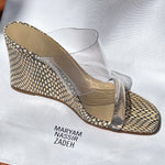 Every day elegance. Slip on high wedge sandals with an 8cm heel in cream and dark brown snake skin patterning with two clear perspex bands, holding your feet in place with style and support. Smooth buttery leather at the footbed cushioning your way through every step. Fits true to size.