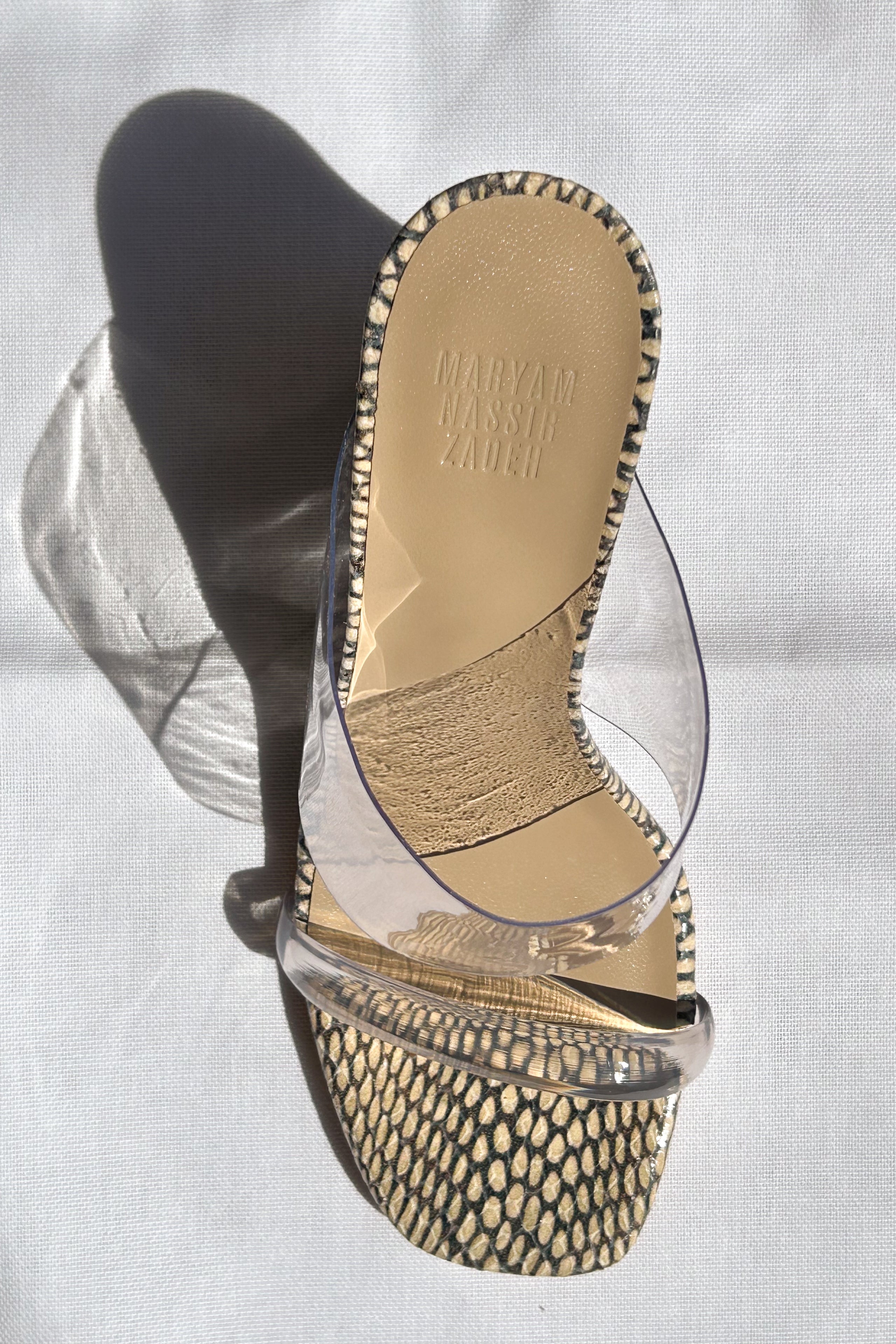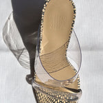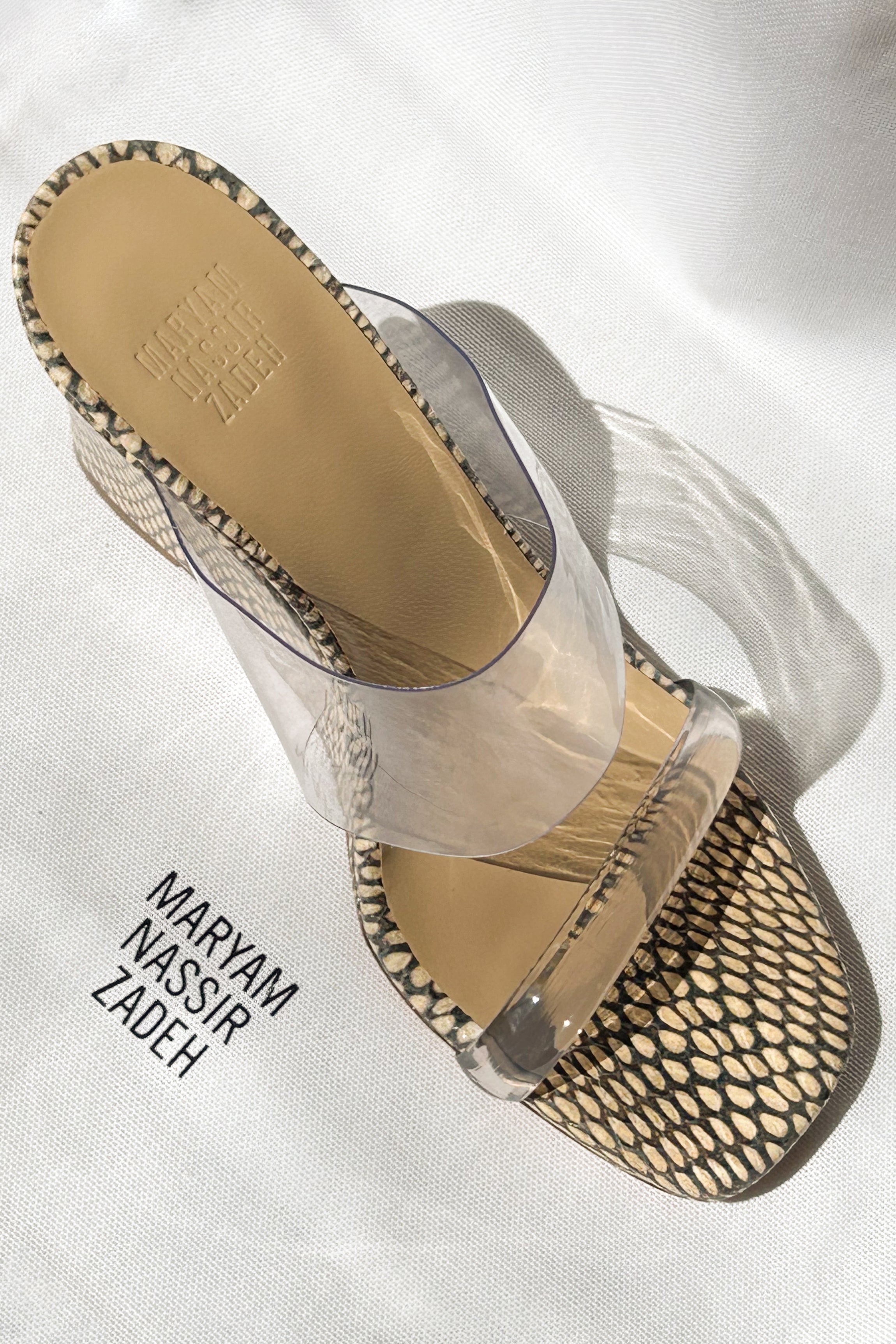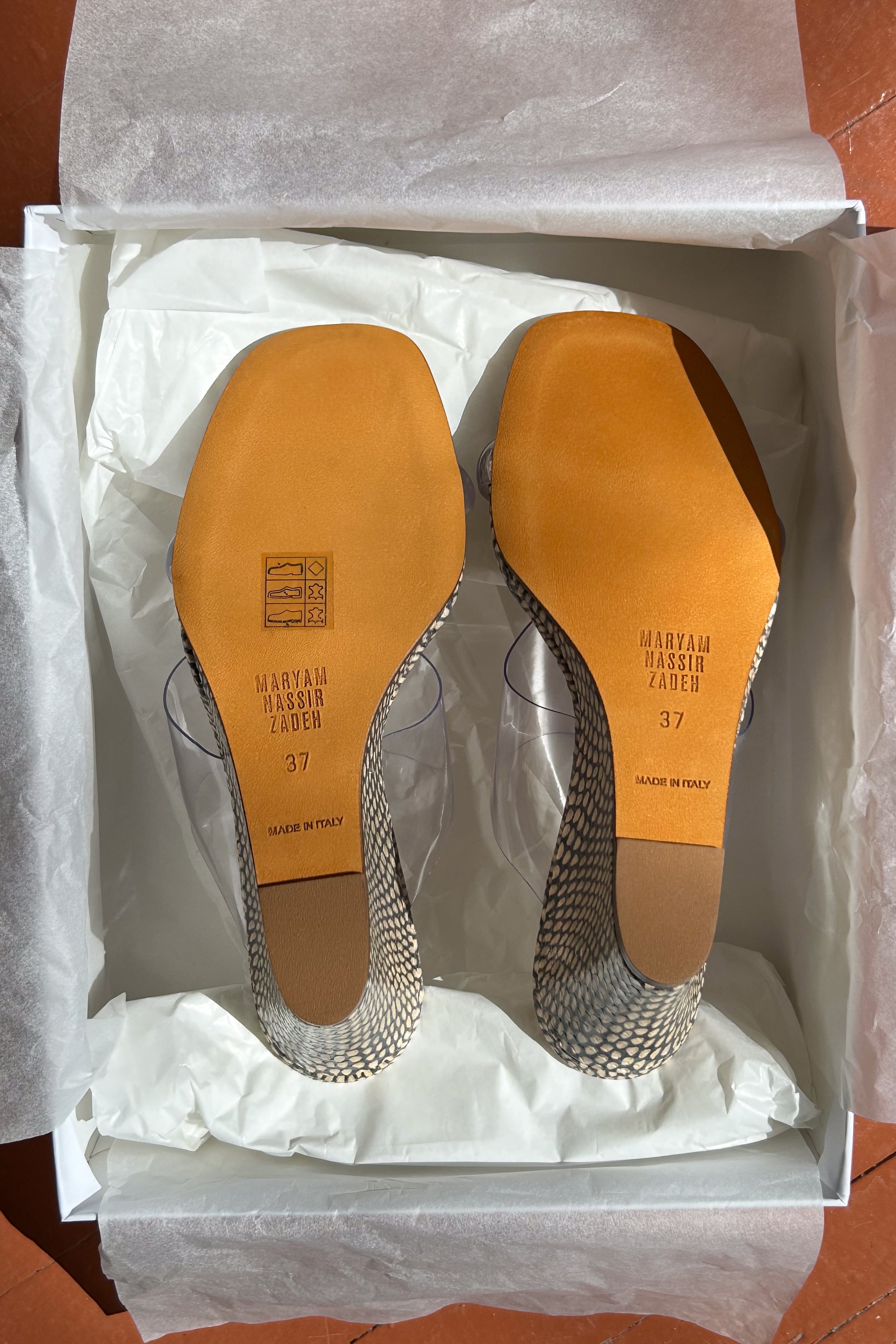 Material: 100% perspex upper, 100% calf leather lining and sole.