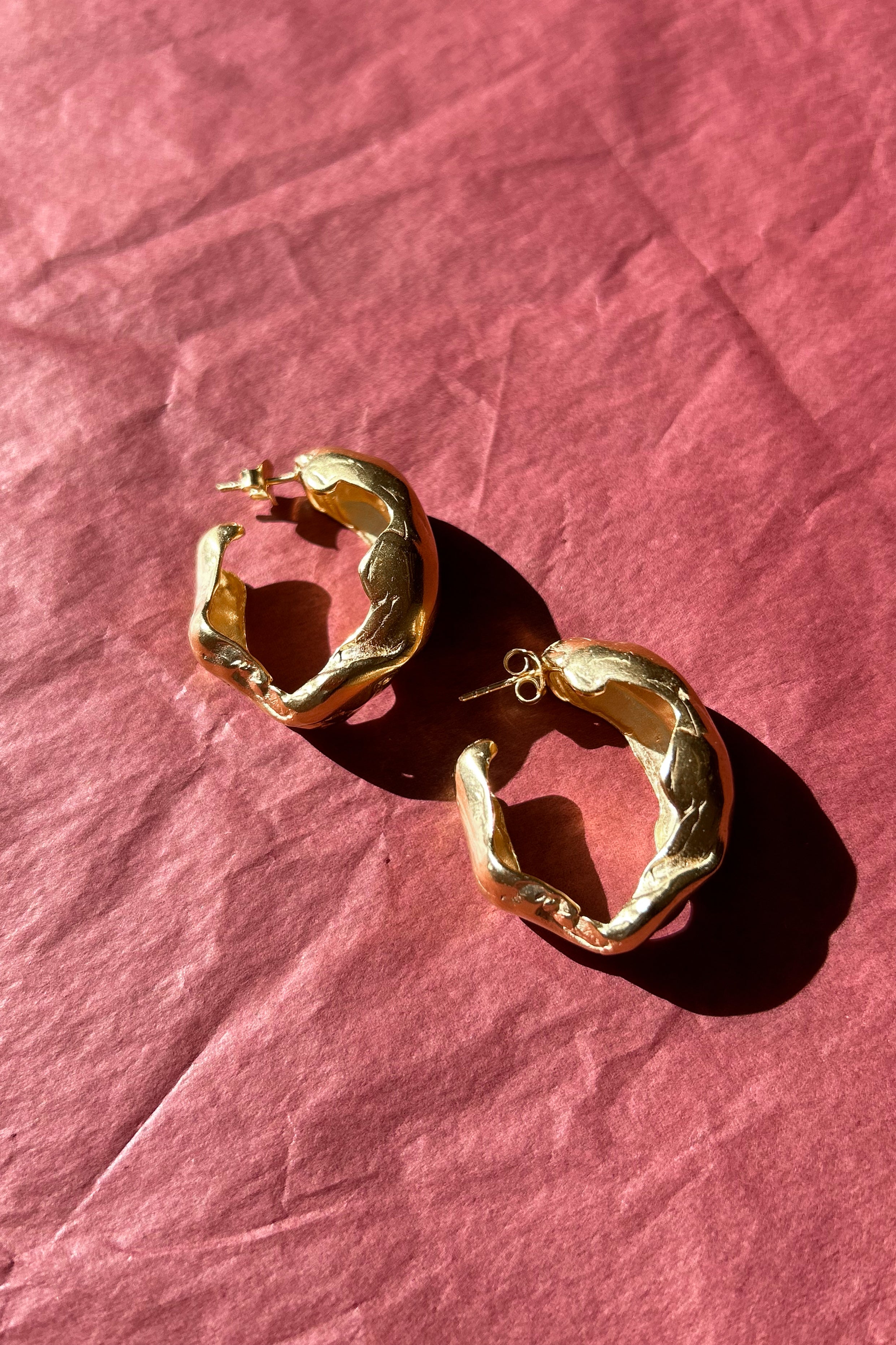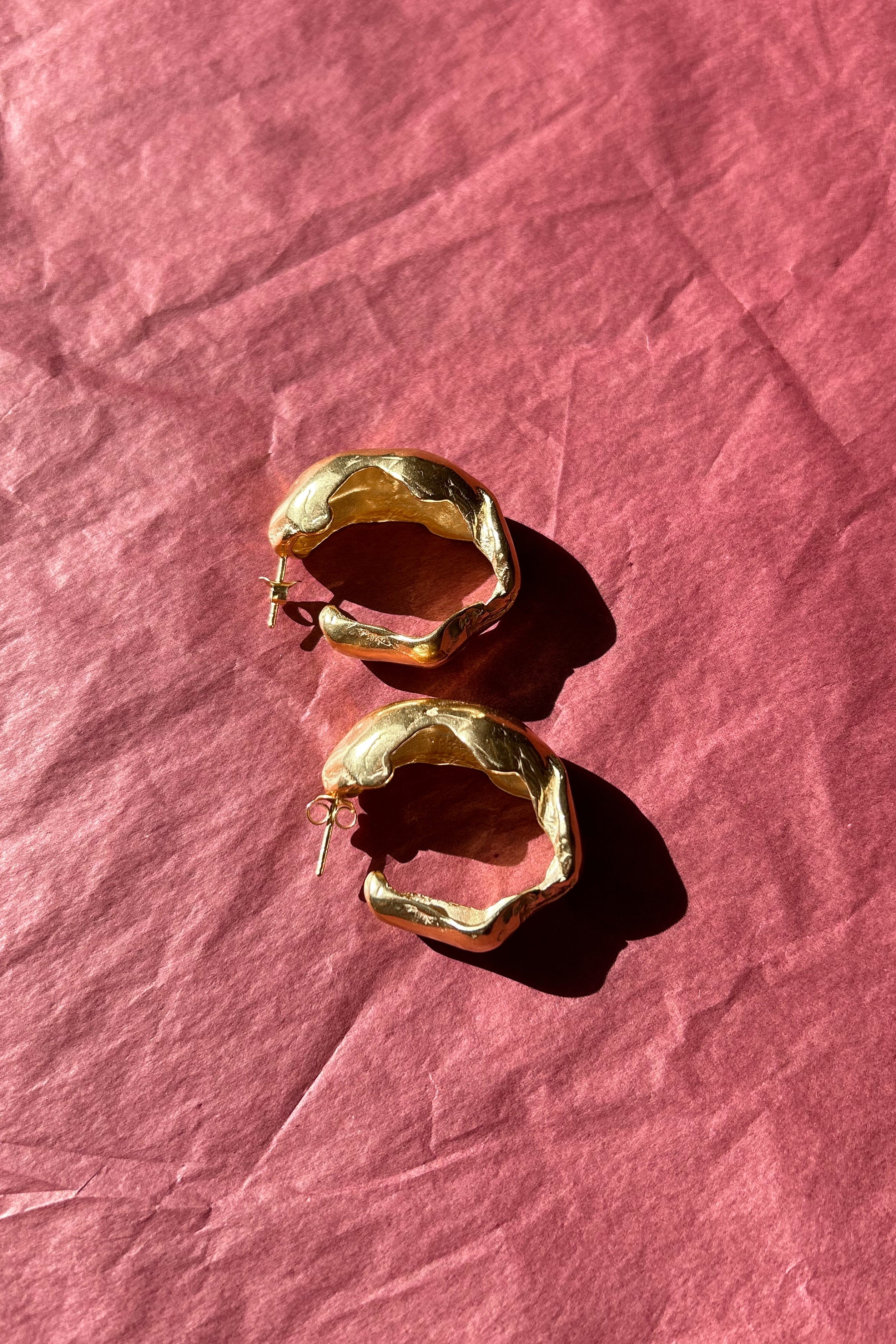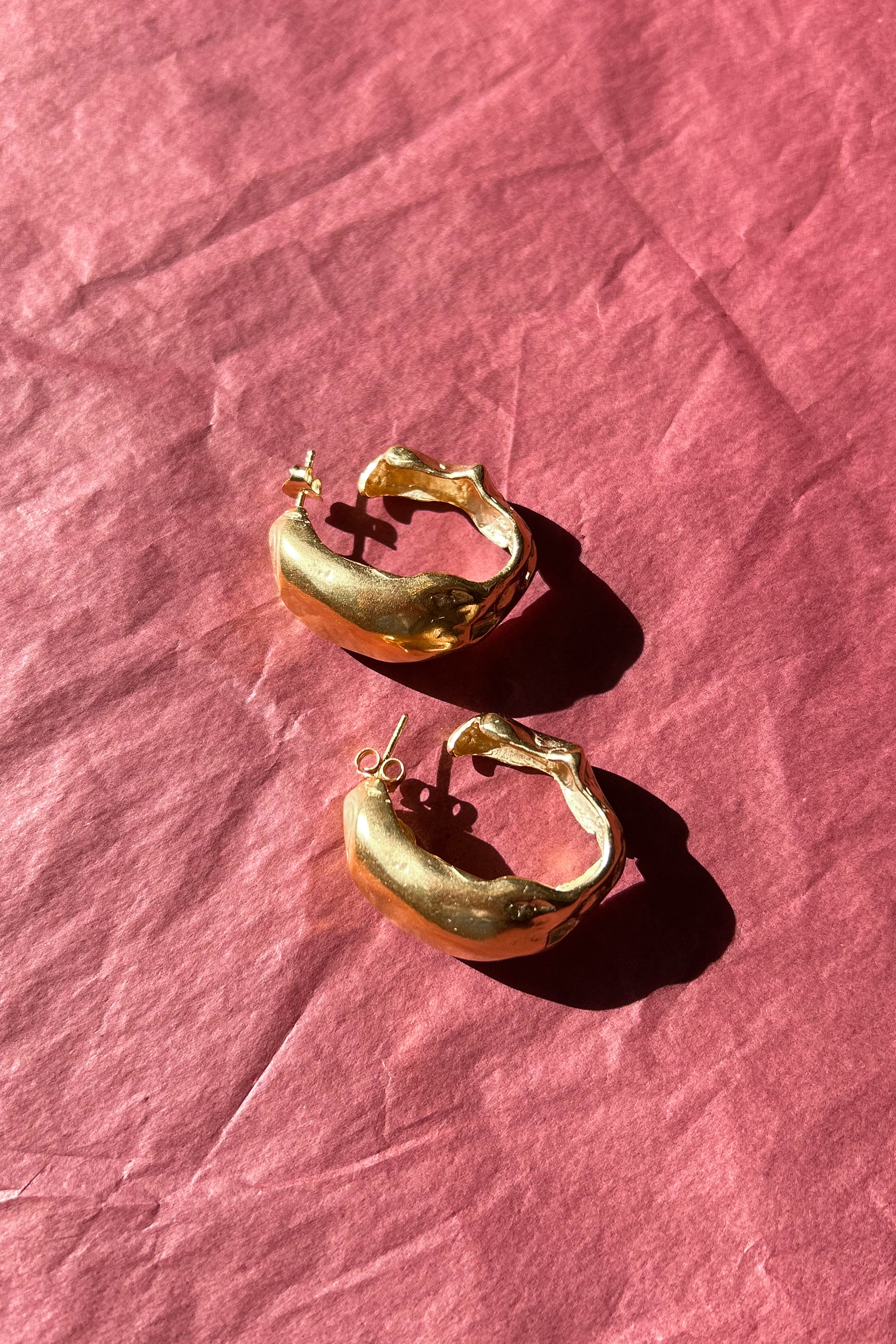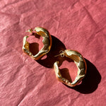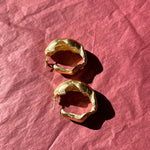 Pair of large, bubble texture shaped hoop earrings with the illusion of coming into a full circle behind the post back closure. A lightweight statement look. Featured in gold plated brass.