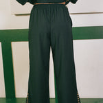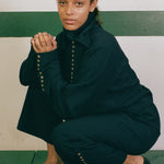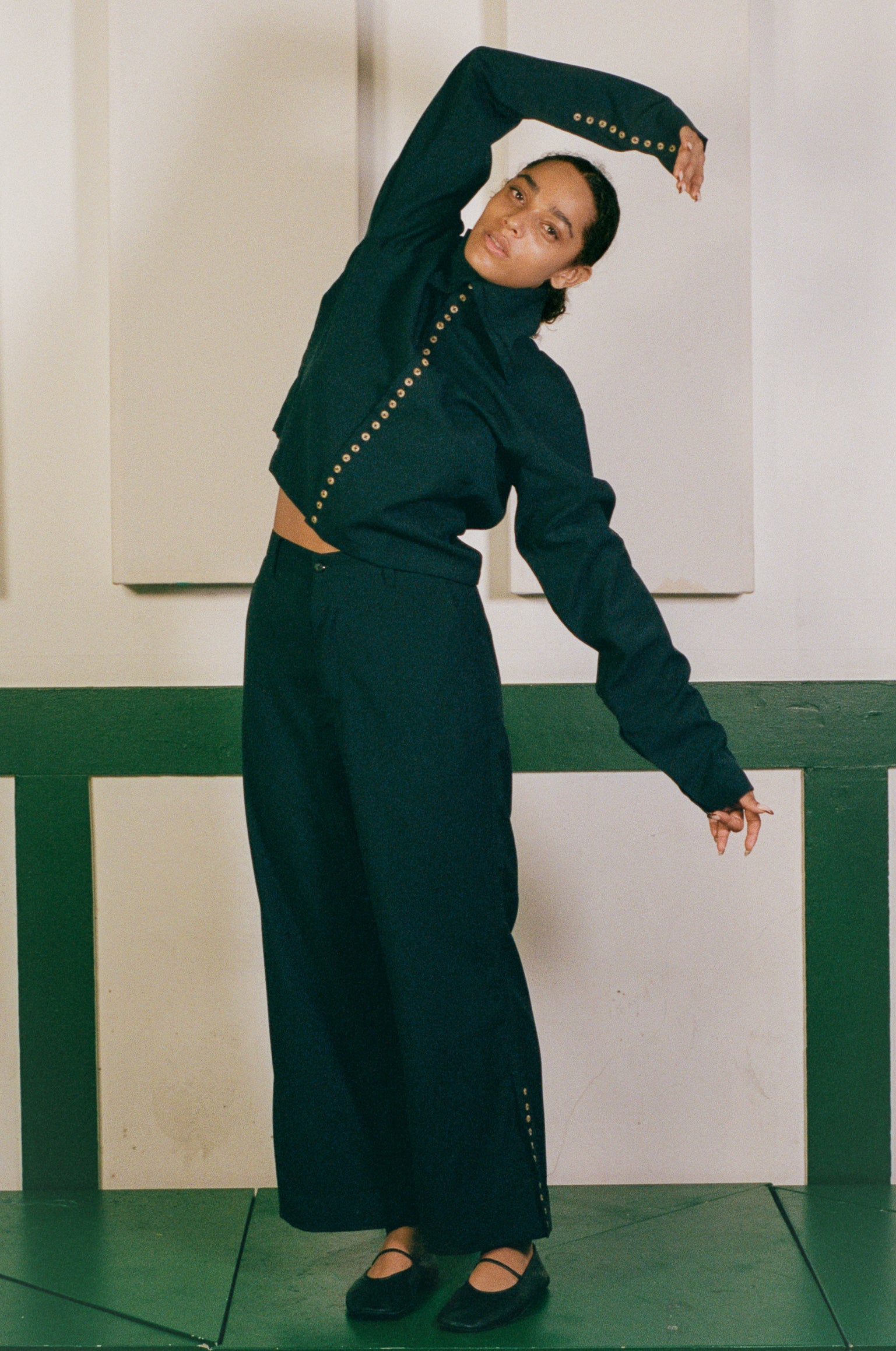 Straight cut suiting wool trousers in navy. Inner hidden button up front with a stand out button closure at the top, in contrast with an elasticated waistband around the back. Belt loops and side slit pockets. The Salima Trousers feature button sleeves at the hem. Pair with the Salima Shirt for the full suit.