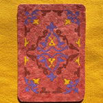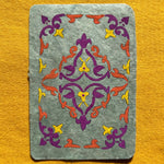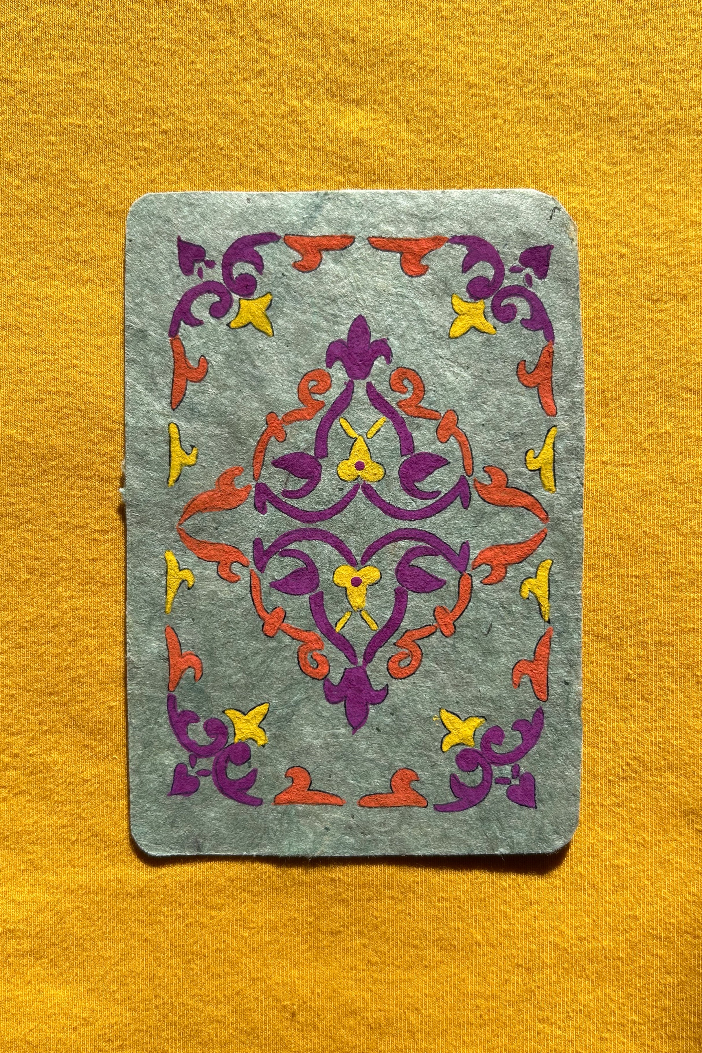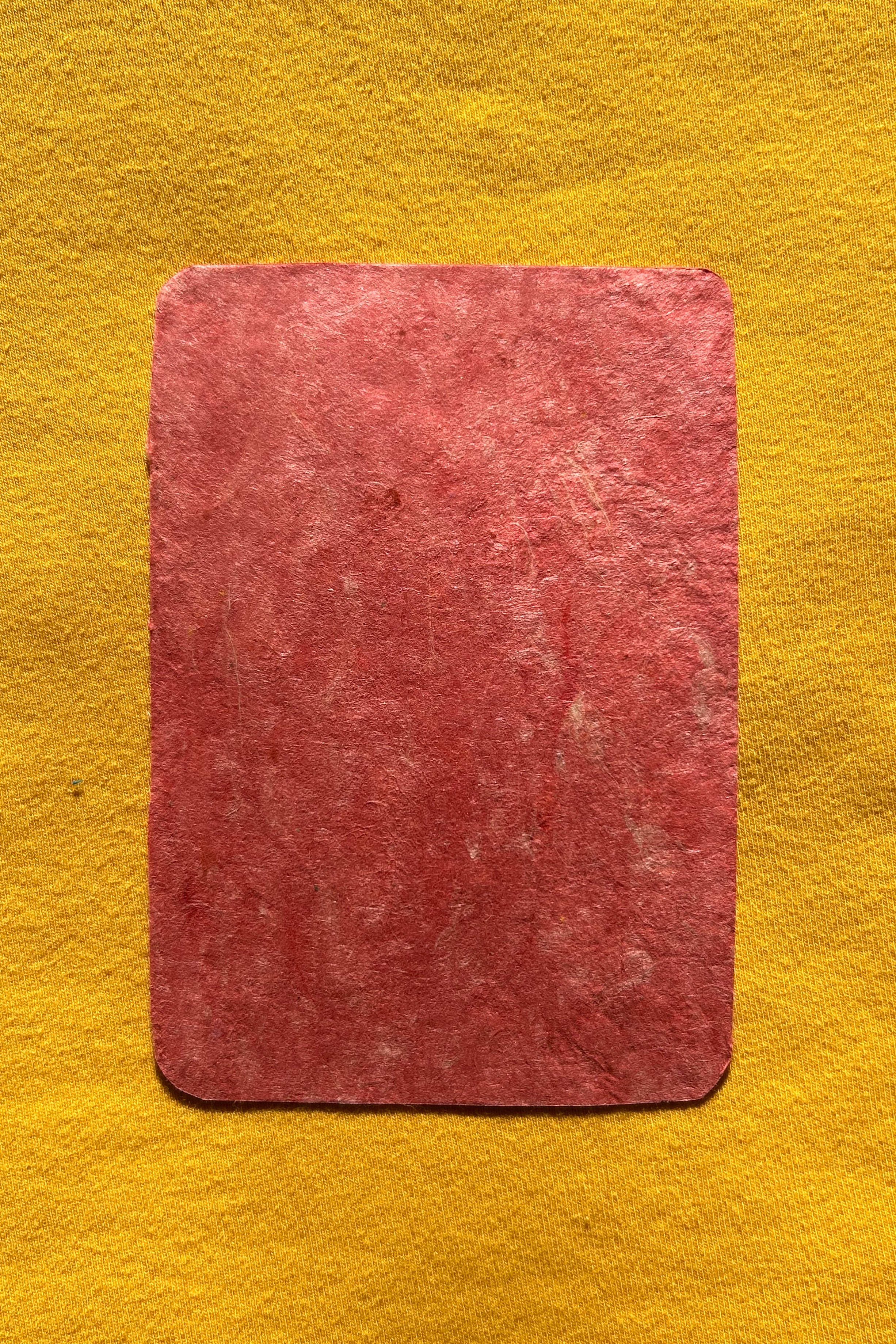 Hand made, hand blended, hand printed paper cards made from a blend of silk and paper pulp.