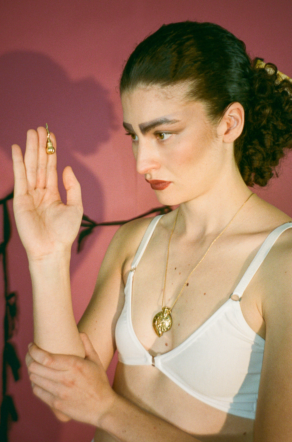 Gillian wears with the Dahlia Bra in Pink Lace, Dahlia Panties in Pink Lace, Lily Bra in White Cotton, Lily Panties in White Mesh/Cotton, Olympia Wedge in Black and Clear, and Baguette Necklace in Silver.