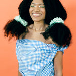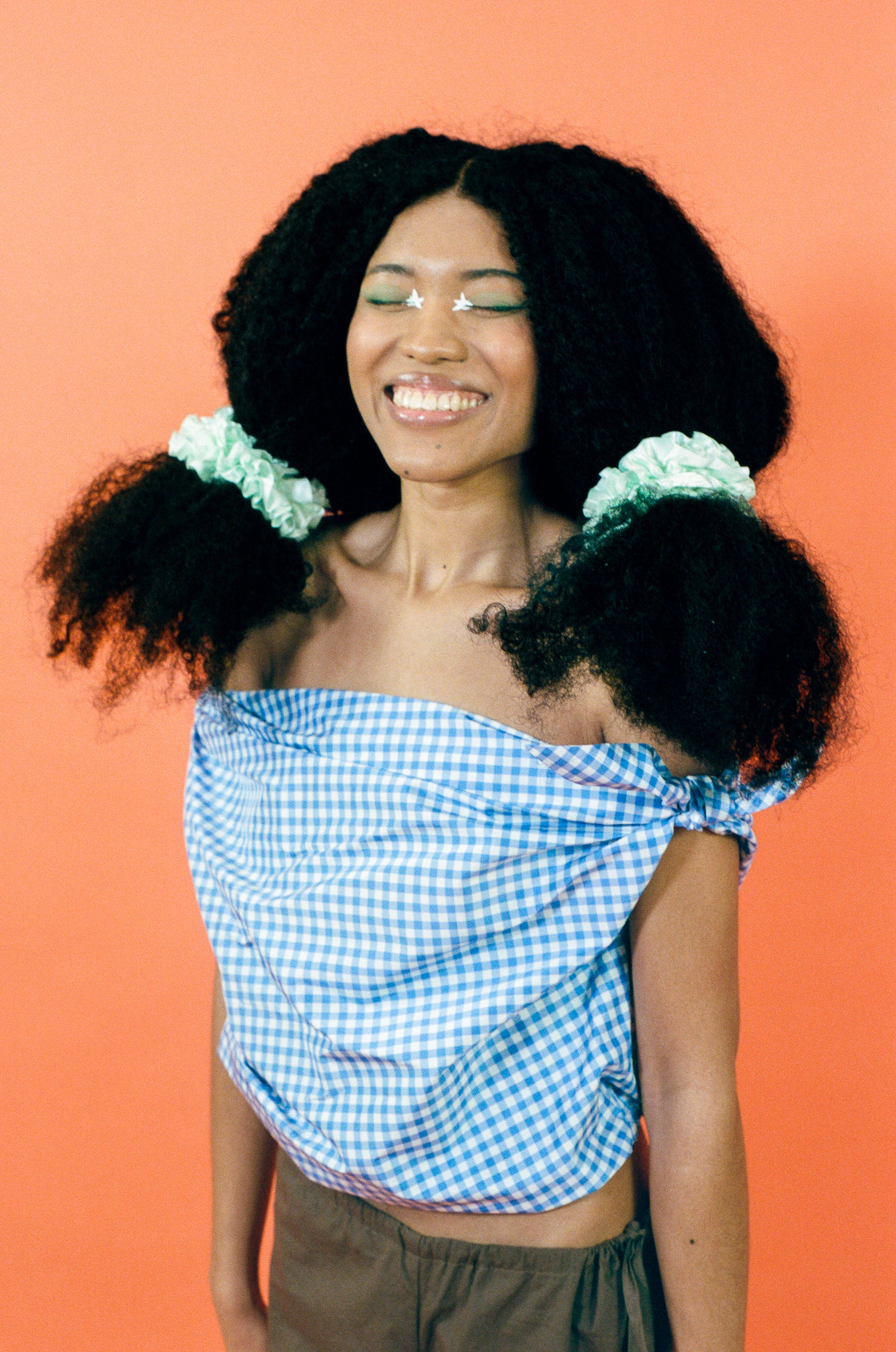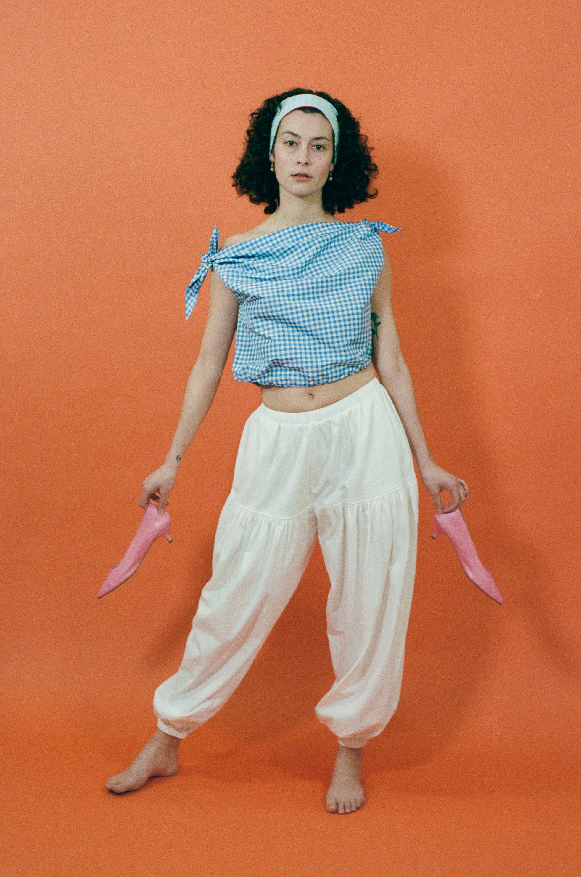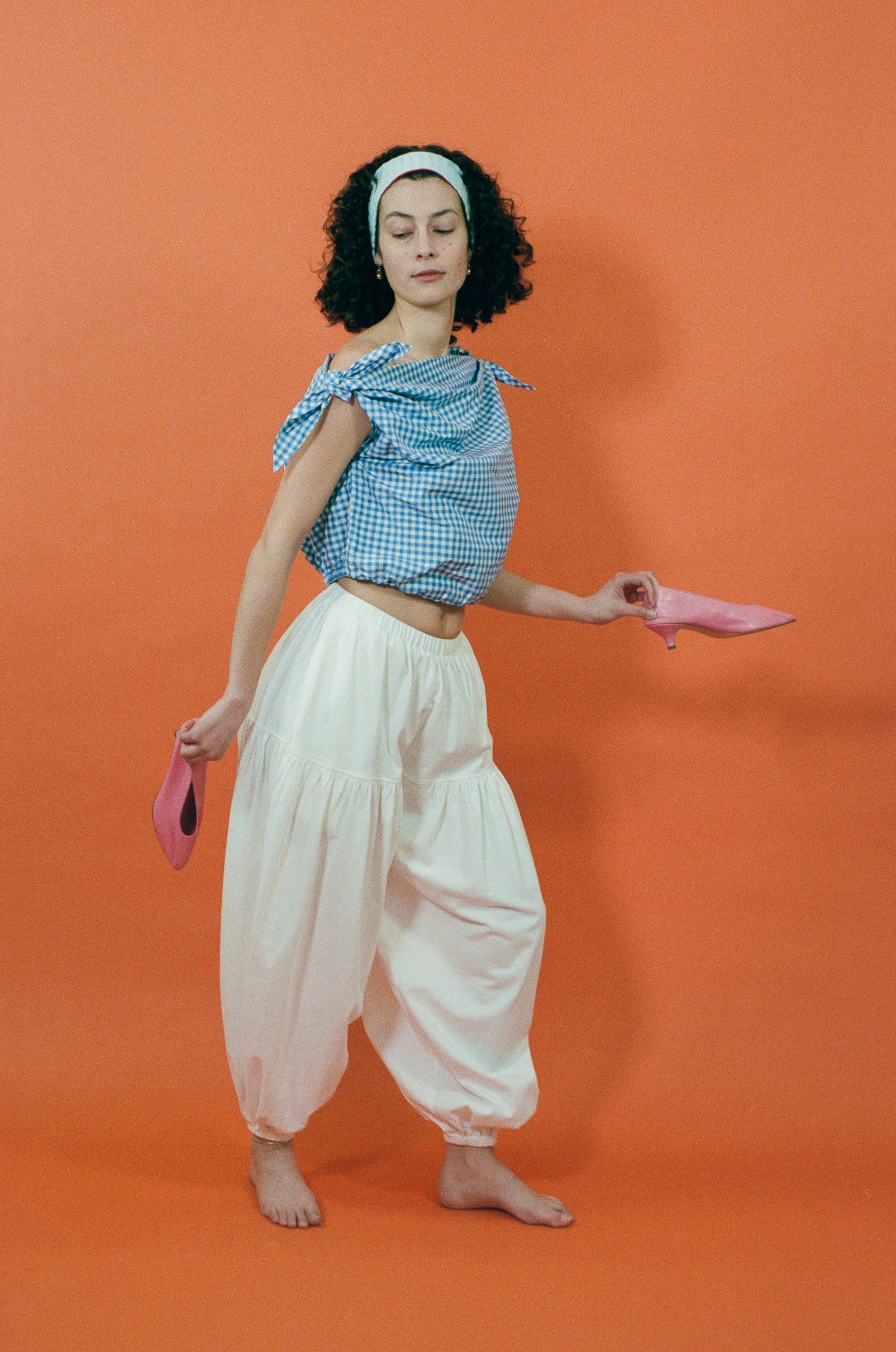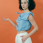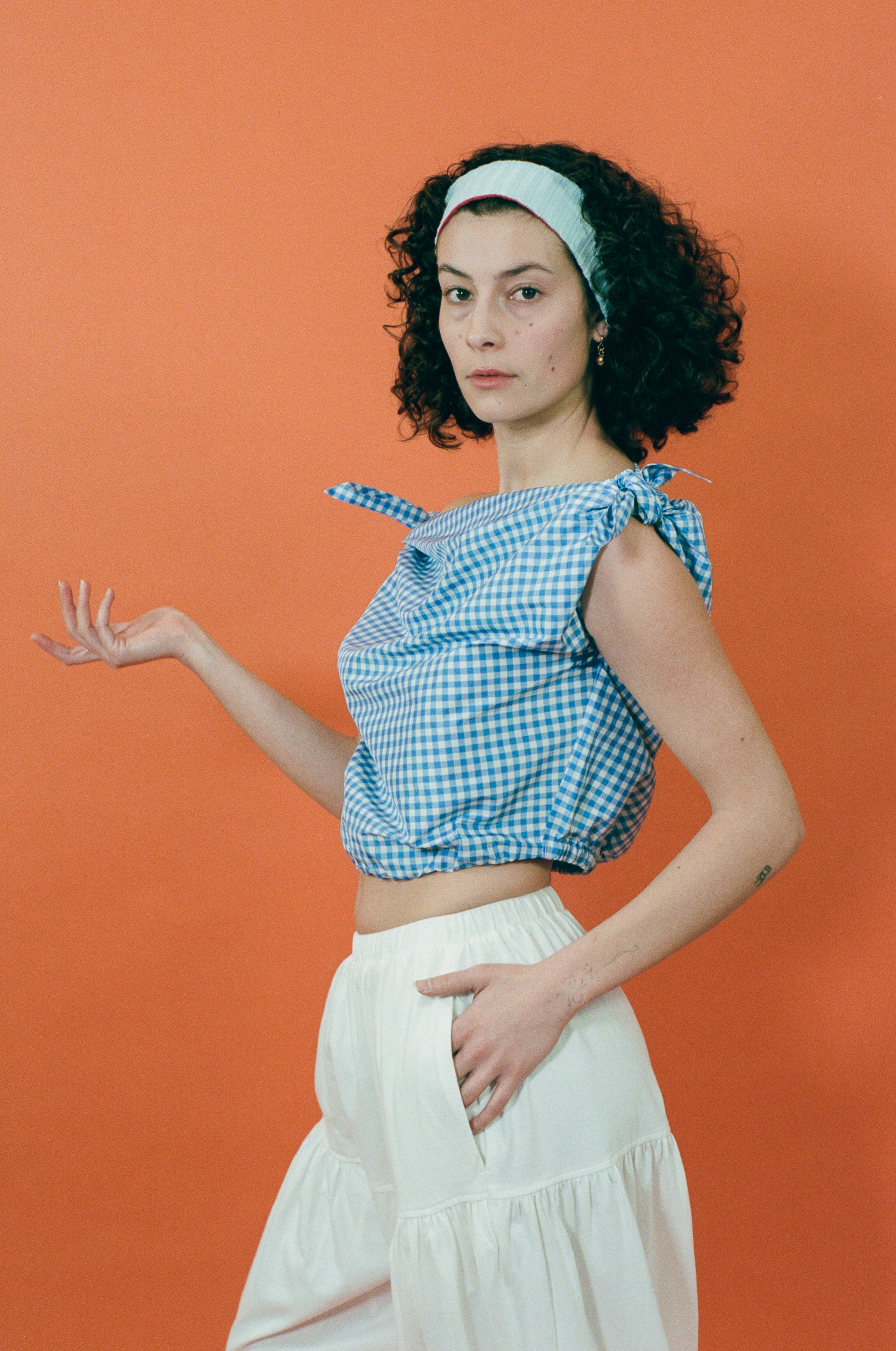 Mid length draped off the shoulder top with shoulder ties in lightweight silk shantung, featured in sky blue and white gingham. Fixed blouson at the front waist and an elasticated back. Organic in shape, folding in harmony with your desired tie at the shoulders.