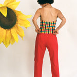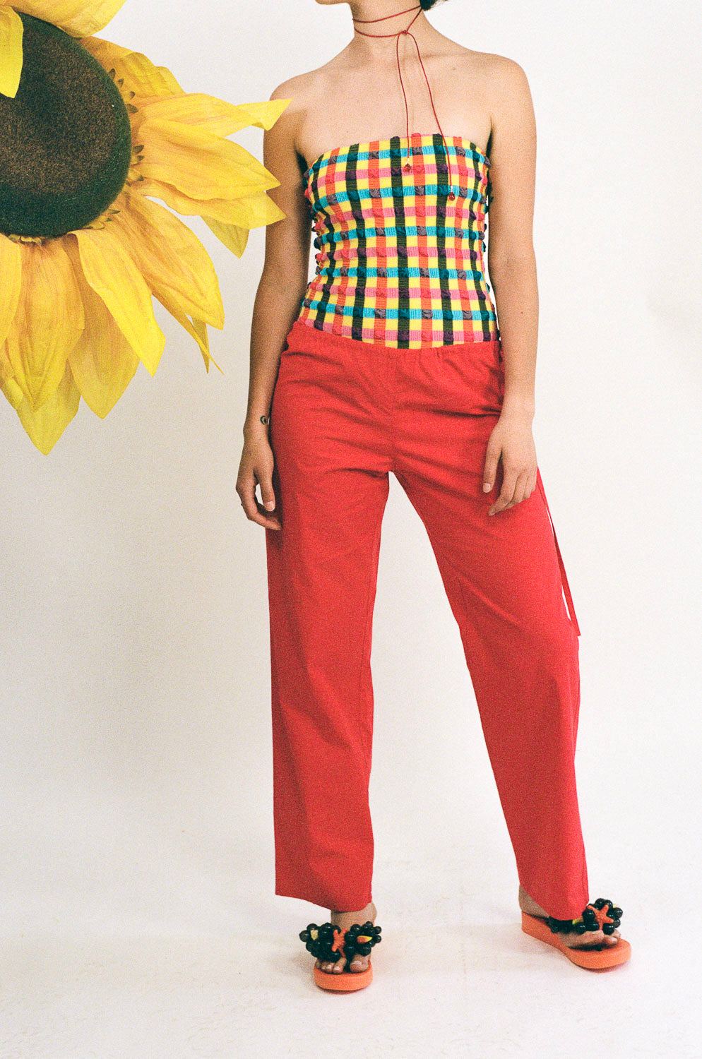 LOW RISE COTTON POPLIN STRAIGHT LEG PANTS IN RUBY RED. FEATURES FULLY ADJUSTABLE WAIST WITH SIDE STRING TIE CLOSURES INTO A BOW, PULLED TO YOUR DESIRED FIT. DESIGNED, CUT, AND SEWN IN ECHO PARK, LOS ANGELES.