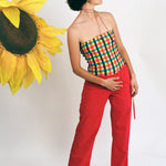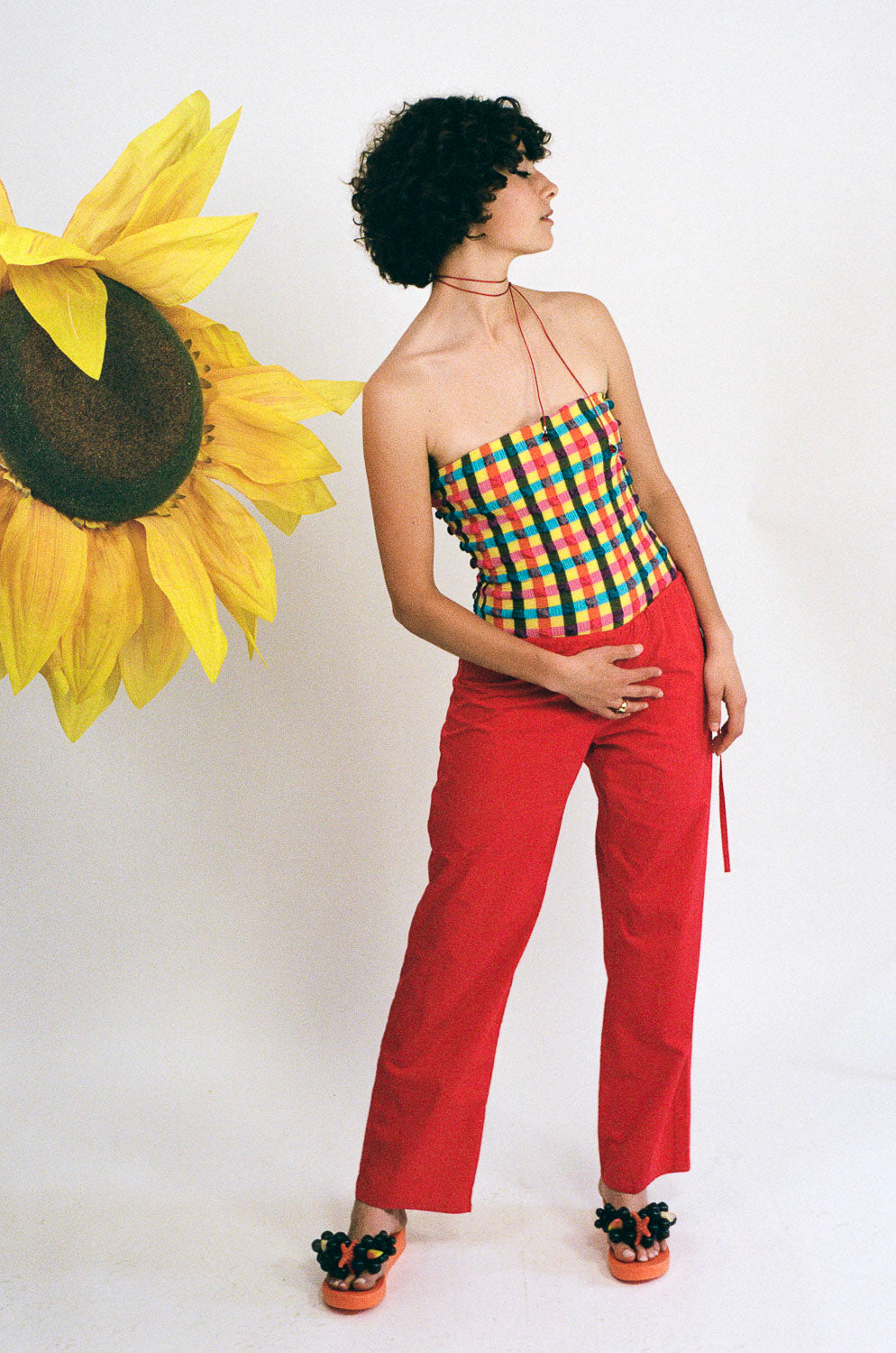 KENZIE IS 5'9 AND A SIZE SMALL/MEDIUM, AND WEARS SIZE MEDIUM 30" INSEAM WITH THE LONG TAC TAC NECKLACE IN RED AND RED AND SUEDE RING WITH GREEN, BLUE, AND RED GLASS.