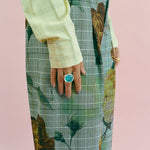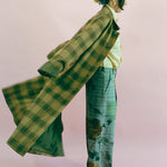 Jenn is 5'7 and a size small, and wears size small with the Juhi Shirt, Wool Plaid Coat in Yellow, Velvet Mary Jane Theatre Shoe in Maroon, Pompas Earrings in Gold, and Atolón Ring in Silver/Blue.