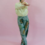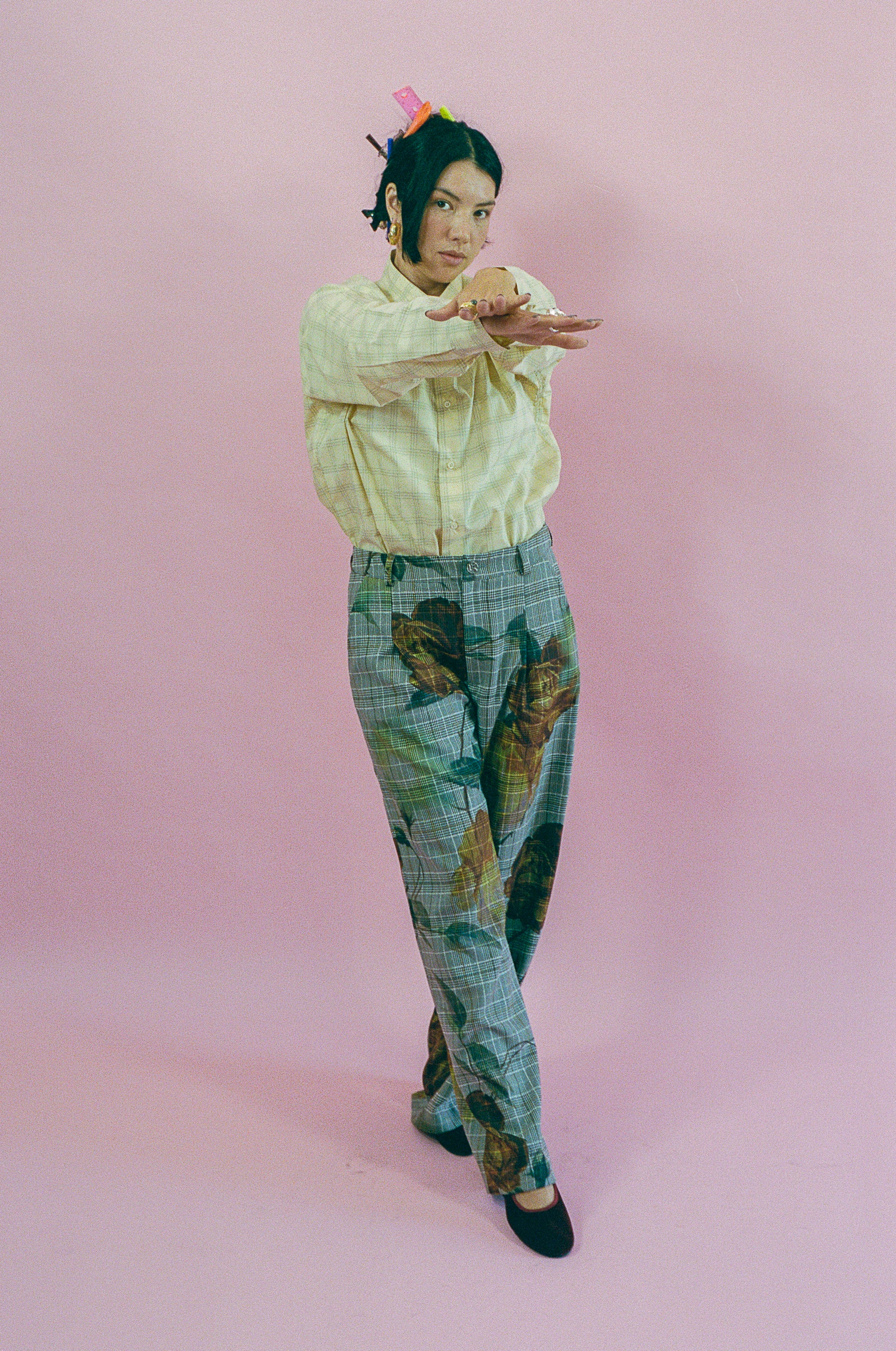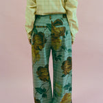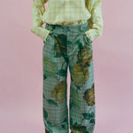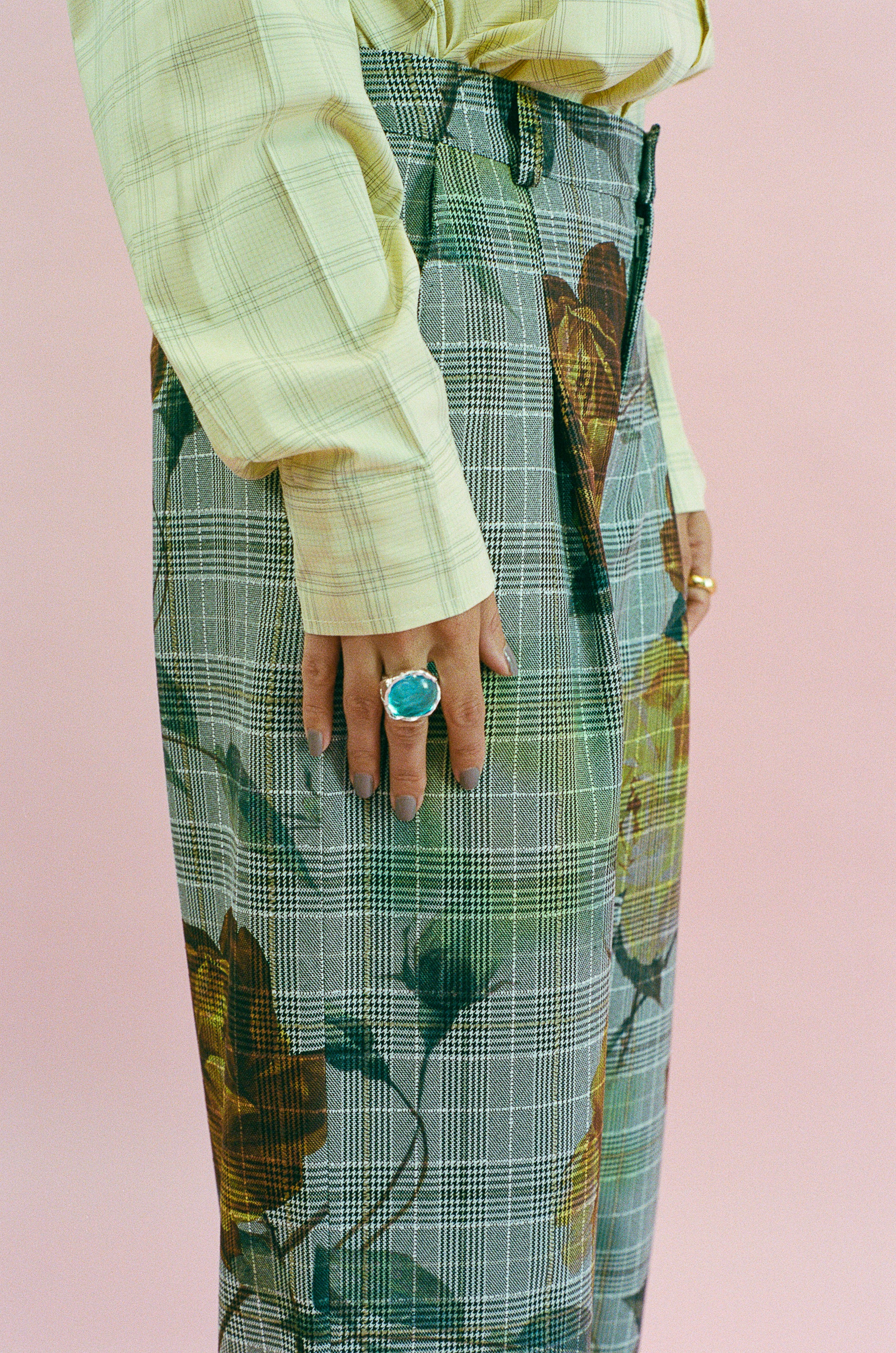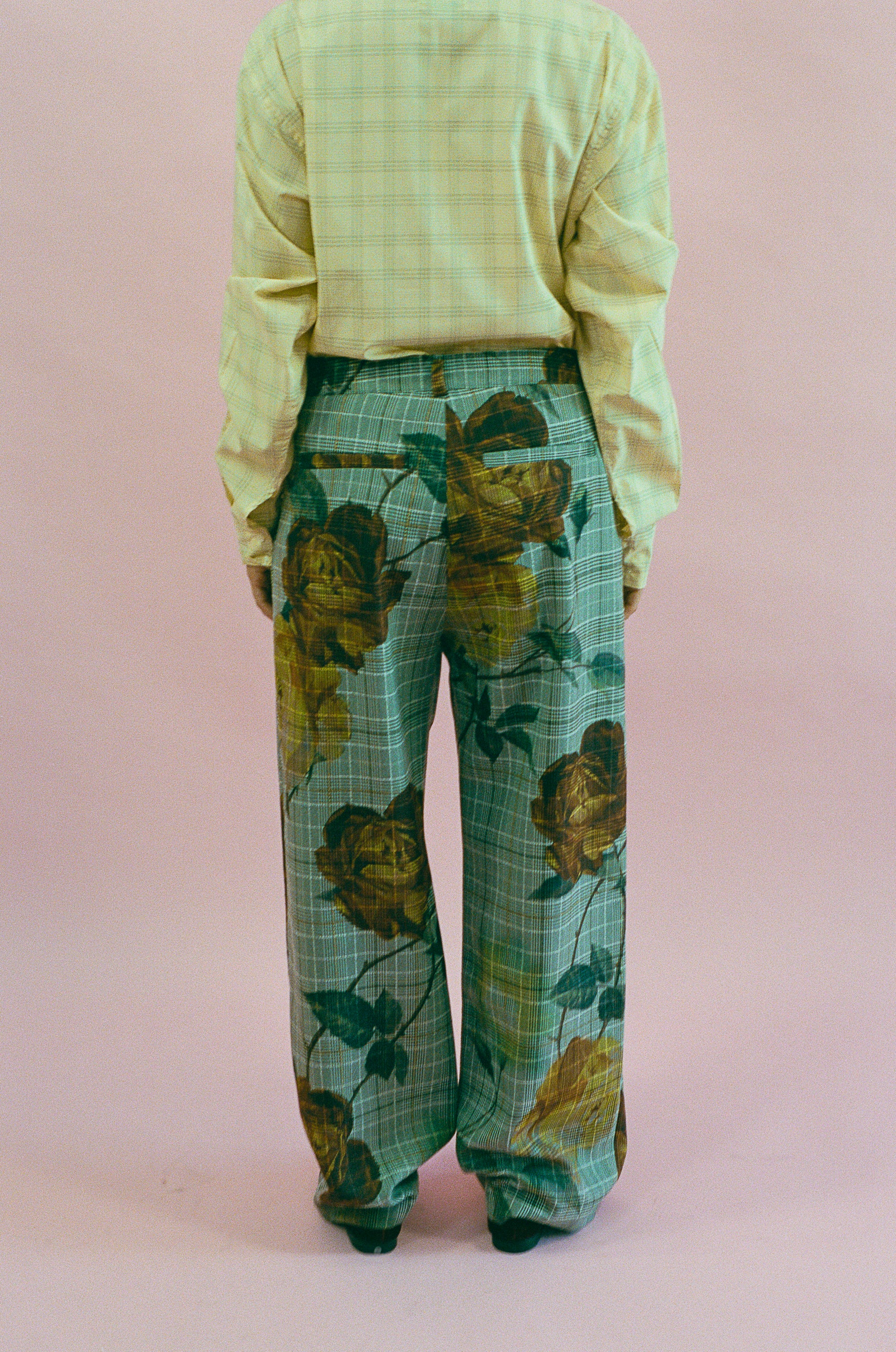 Mid rise trousers in grey plaid with straight wide legs, side slit front pockets, back welt pockets, and belt loops along the waistband. Button and zip fly closure. The Walter Trousers will hug your hips falling into a beautiful long length wide enough to wear high boots underneath, or ankle bearing shoes. Features all over digital print of brown/green/yellow flowers.