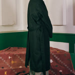 Long, classic style worsted wool coat with a wide and straight cut silhouette. Inner hidden button up front with a stand out button closure at the top right by the collar, lined and lightweight with enough room to layer underneath comfortably and retain warmth. Deep slit front pockets with a long belt attachment connected through loop holds at each side. Featured in black, the Worsted Wool Long Coat is a sleek and easy to pair addition to your fall wardrobe.
