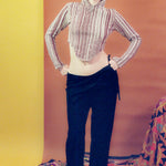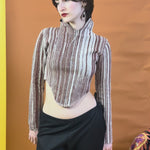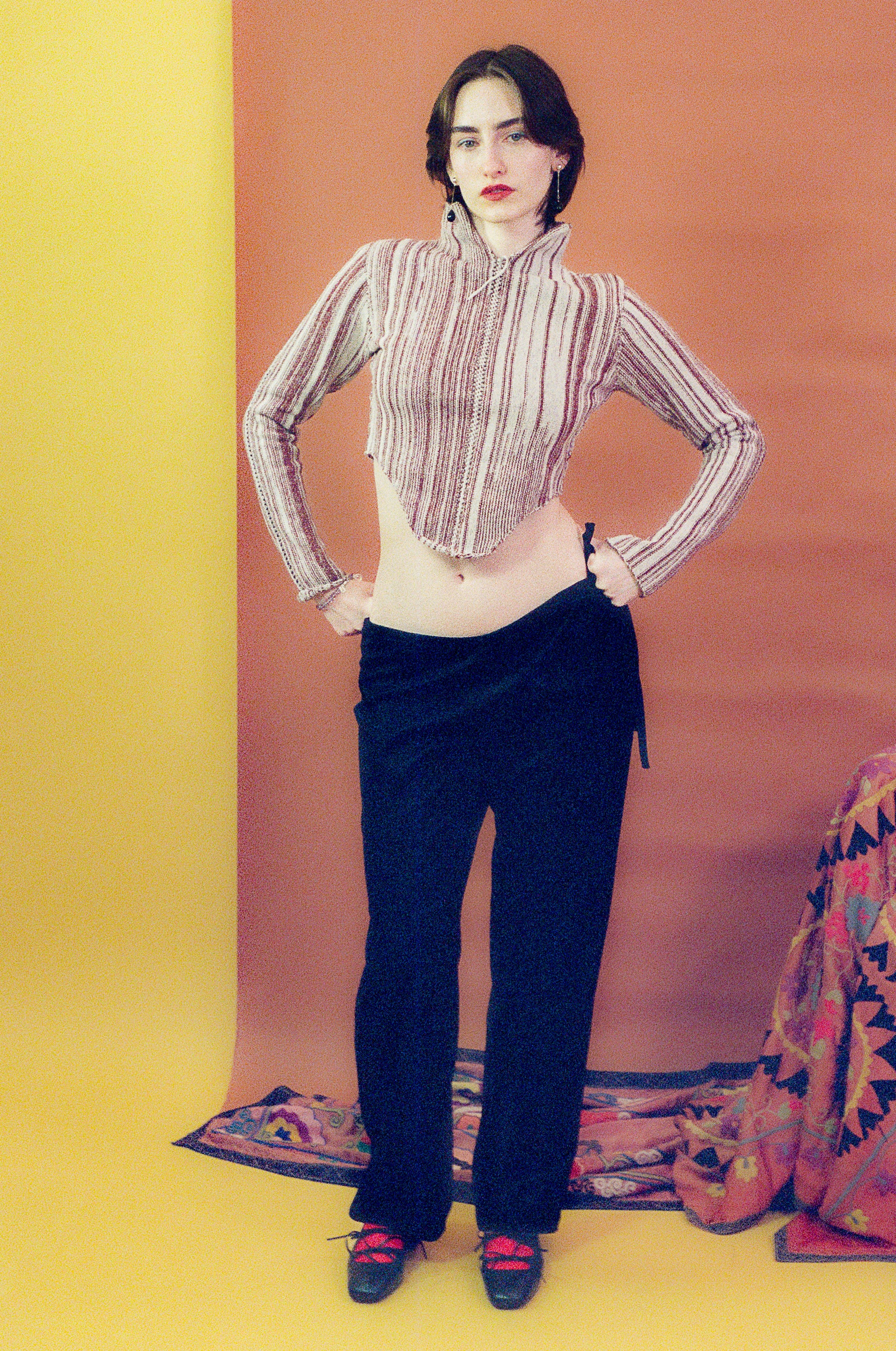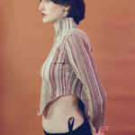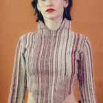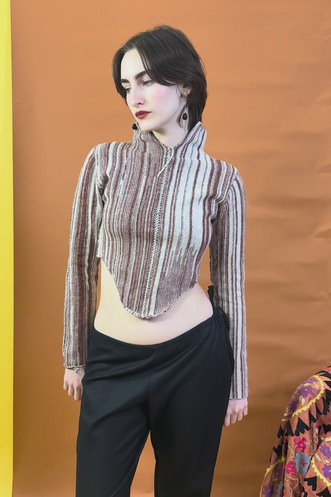 Long sleeve lambswool sweater in burgundy and cream, with embroidered braid details along the center seams on the front, back, and sleeves of the top. Subtle mock neck with a center slit for comfort, and a corset shaped bottom hem hugging your waist while showing off your hips. Since the fabric is loosely knitted and hand stitched together, please be careful to not snag or fray when wearing.